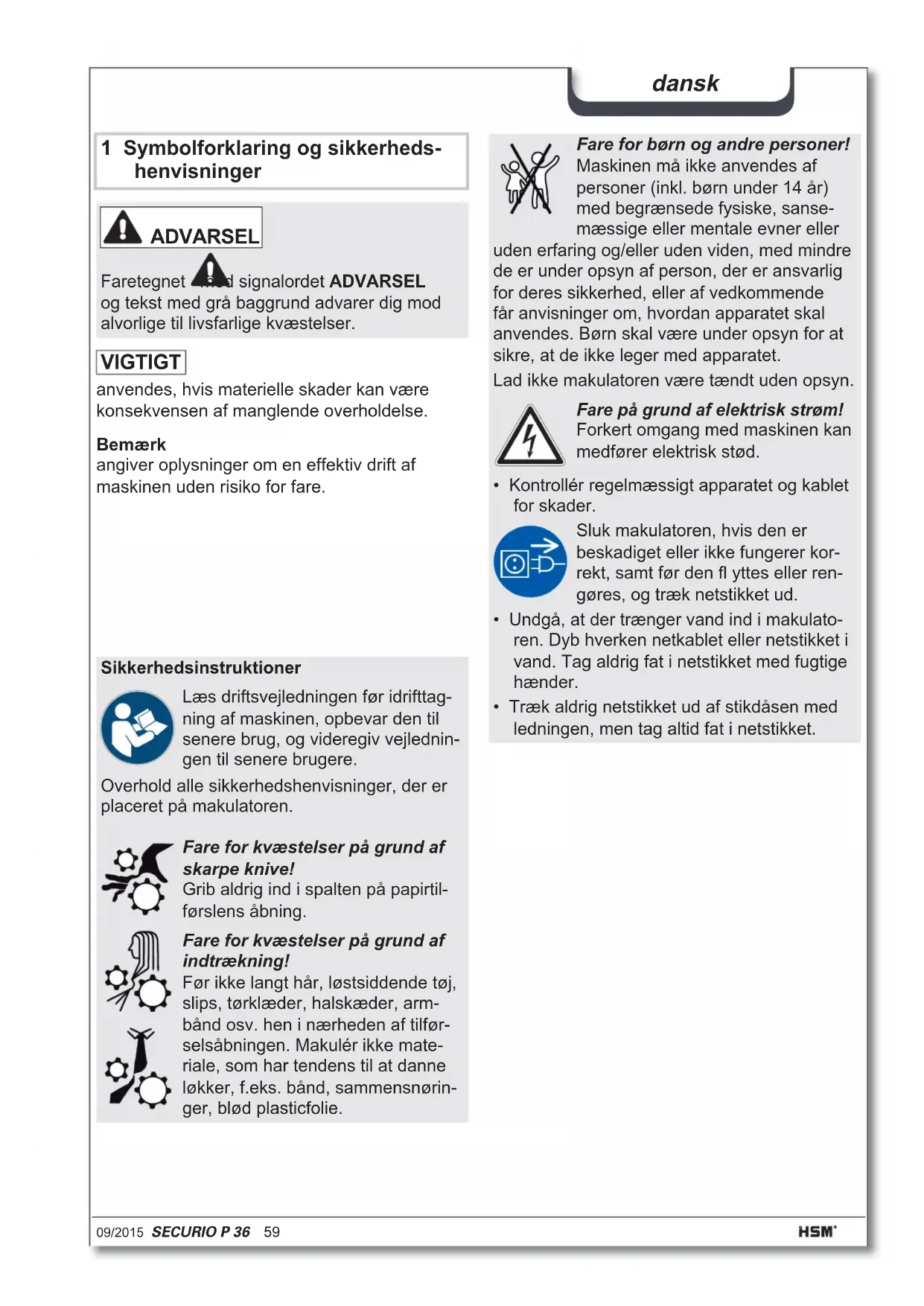 - Het max. aantal bladen (DIN A4, 70 g/m² resp. 80 g/m²), in de lengte aangevoerd, dat in één doorloop gesneden wordt. Het bepalen van de opgegeven capaciteitsgegevens gebeurt met een nieuw, geolied snijwerk en met een koude motor. Een zwakkere netspanning of een andere netfrequentie dan opgegeven, kan tot een geringere capaciteit en tot verhoogde loopgeluiden leiden. Naargelang structuur en eigenschappen van het papier en het soort invoer kan de bladcapaciteit afwijken.09/2015 SECURIO P 36 59 dansk 1 Symbolforklaring og sikkerheds- henvisninger Bemærk angiver oplysninger om en effektiv drift af maskinen uden risiko for fare. ADVARSEL Faretegnet med signalordet ADVARSEL og tekst med grå baggrund advarer dig mod alvorlige til livsfarlige kvæstelser. Sikkerhedsinstruktioner Læs driftsvejledningen før idrifttag- ning af maskinen, opbevar den til senere brug, og videregiv vejlednin- gen til senere brugere. Overhold alle sikkerhedshenvisninger, der er placeret på makulatoren. Fare for kvæstelser på grund af skarpe knive! Grib aldrig ind i spalten på papirtil- førslens åbning. Fare for kvæstelser på grund af indtrækning! Før ikke langt hår, løstsiddende tøj, slips, tørklæder, halskæder, arm- bånd osv. hen i nærheden af tilfør- selsåbningen. Makulér ikke mate- riale, som har tendens til at danne løkker, f.eks. bånd, sammensnørin- ger, blød plasticfolie. Fare for børn og andre personer! Maskinen må ikke anvendes af personer (inkl. børn under 14 år) med begrænsede fysiske, sanse- mæssige eller mentale evner eller uden erfaring og/eller uden viden, med mindre de er under opsyn af person, der er ansvarlig for deres sikkerhed, eller af vedkommende får anvisninger om, hvordan apparatet skal anvendes. Børn skal være under opsyn for at sikre, at de ikke leger med apparatet. Lad ikke makulatoren være tændt uden opsyn. Fare på grund af elektrisk strøm! Forkert omgang med maskinen kan medfører elektrisk stød.