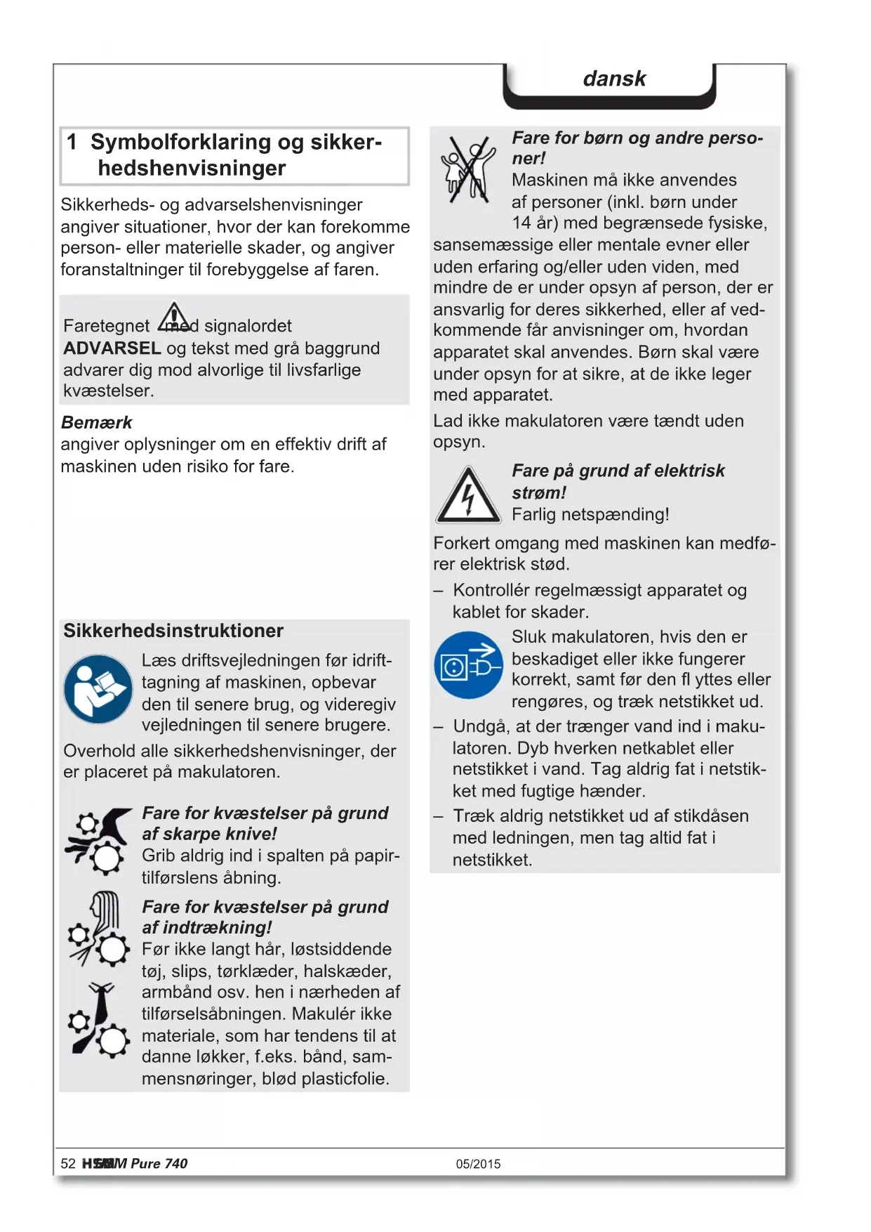 Gewicht 50 kg 56 kg Doorloopsnelheid 70 mm/s 60 mm/s Invoerbreedte 400 mm Aansluiting 230 V, 50 Hz 120 V, 60 Hz 220 V, 60 Hz Opgenomen vermogen bij max. aantal vellen 590 W Bedrijfsmodus Continubedrijf Omgevingsvoorwaarden tijdens het gebruik: Temperatuur Relatieve luchtvochtigheid Hoogte boven normaal nulpunt -10 °C tot +25 °C max. 90 %, niet condenserend max. 2.000 m Afmetingen B x D x H (mm) 620 x 487 x 889 Volume van de snijgoedbak 145 l Emissiegeluidsdrukniveau (Stationair / belast) 56 dB(A) / 59-63 dB(A)52 HSM Pure 740 05/2015 dansk 1 Symbolforklaring og sikker- hedshenvisninger Sikkerheds- og advarselshenvisninger angiver situationer, hvor der kan forekomme person- eller materielle skader, og angiver foranstaltninger til forebyggelse af faren. Bemærk angiver oplysninger om en effektiv drift af maskinen uden risiko for fare. Faretegnet med signalordet ADVARSEL og tekst med grå baggrund advarer dig mod alvorlige til livsfarlige kvæstelser. Sikkerhedsinstruktioner Læs driftsvejledningen før idrift- tagning af maskinen, opbevar den til senere brug, og videregiv vejledningen til senere brugere. Overhold alle sikkerhedshenvisninger, der er placeret på makulatoren. Fare for kvæstelser på grund af skarpe knive! Grib aldrig ind i spalten på papir- tilførslens åbning. Fare for kvæstelser på grund af indtrækning! Før ikke langt hår, løstsiddende tøj, slips, tørklæder, halskæder, armbånd osv. hen i nærheden af tilførselsåbningen. Makulér ikke materiale, som har tendens til at danne løkker, f.eks. bånd, sam- mensnøringer, blød plasticfolie. Fare for børn og andre perso- ner! Maskinen må ikke anvendes af personer (inkl. børn under 14 år) med begrænsede fysiske, sansemæssige eller mentale evner eller uden erfaring og/eller uden viden, med mindre de er under opsyn af person, der er ansvarlig for deres sikkerhed, eller af ved- kommende får anvisninger om, hvordan apparatet skal anvendes. Børn skal være under opsyn for at sikre, at de ikke leger med apparatet. Lad ikke makulatoren være tændt uden opsyn. Fare på grund af elektrisk strøm! Farlig netspænding! Forkert omgang med maskinen kan medfø- rer elektrisk stød. – Kontrollér regelmæssigt apparatet og kablet for skader. Sluk makulatoren, hvis den er beskadiget eller ikke fungerer korrekt, samt før den fl yttes eller rengøres, og træk netstikket ud. – Undgå, at der trænger vand ind i maku- latoren. Dyb hverken netkablet eller netstikket i vand. Tag aldrig fat i netstik- ket med fugtige hænder. – Træk aldrig netstikket ud af stikdåsen med ledningen, men tag altid fat i netstikket.05/2015 HSM Pure 740 53 dansk 2 Anvendelse i overensstem- melse med formålet, garanti Garantitiden for makulatoren er på 2 år. Uafhængigt af garantiydelsen gælder der en garanti for HSM makulatorernes skæreaks- ler af fuldstål i hele apparatets levetid (HSM Lifetime Warranty). Slid, skader på grund af ukorrekt brug samt indgreb fra tredje part falder hverken under garantiydelsen eller garantien. HSM garanterer leveringen af reservedele i op til 10 år, efter denne model ikke læn- gere produceres. Makulatoren er beregnet til at fi ndele papir samt små mængder cd‘er/dvd‘er og kredit-/ kundekort. Det robuste drev tåler kontakt med hæfte- klammer og clips. 3 Oversigt Betjenings- og displayelementer Visninger Beholder fuld Visninger Driftsklar Visninger Skæreværk blokeret Dør åben / Sikkerhedselement trykket ned Betjeningstast Reverseringstast 1 Dør 2 Sikkerhedshenvisninger 3 Fotocelle 4 Betjenings- og displayenhed 5 Sikkerhedselement 6 Typeskilt 7 Netafbryder 1 2 3 4 5 6 754 HSM Pure 740 05/2015 dansk 4 Idriftsættelse ADVARSEL Farlig netspænding! Forkert omgang med maskinen kan medfører elektrisk stød. – Anvend kun apparatet i tørre indendørs rum. Anvend det aldrig i fugtige rum eller i regn. – Hold apparatet, netstikket og netkablet væk fra åben ild og varme fl ader. Venti- lationsåbningerne skal være fri, og der skal overholdes en afstand til væggen eller til møbler på min. 5 cm. – Sørg for, at det er nemt at nå netstikket. – Kontrollér, at strømnettets spænding og frekvens svarer til oplysningerne på typeskiltet, før netstikket sættes i.