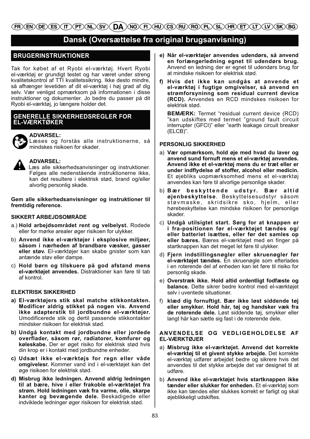 Dansk (Oversættelse fra original brugsanvisning) BRUGERINSTRUKTIONER e) Når el-værktøjer anvendes udendørs, så anvend en forlængerledning egnet til udendørs brug. Anvend en ledning der er egnet til udendørs brug for at mindske risikoen for elektrisk stød. Tak for købet af et Ryobi el-værktøj. Hvert Ryobi el-værktøj er grundigt testet og har været under streng kvalitetskontrol af TTI kvalitetssikring. Ikke desto mindre, så afhænger levetiden af dit el-værktøj i høj grad af dig selv. Vær venligst opmærksom på informationen i disse instruktioner og dokumenter. Jo bedre du passer på dit Ryobi el-værktøj, jo længere holder det. f) Hvis det ikke kan undgås at anvende et el-værktøj i fugtige omgivelser, så anvend en strømforsyninng som residual current device (RCD). Anvendes en RCD mindskes risikoen for elektrisk stød. [:ý>© Termet “residual current device (RCD) ”kan udskiftes med termet ”ground fault circuit interrupter (GFCI)” eller ”earth leakage circuit breaker (ELCB)”.
