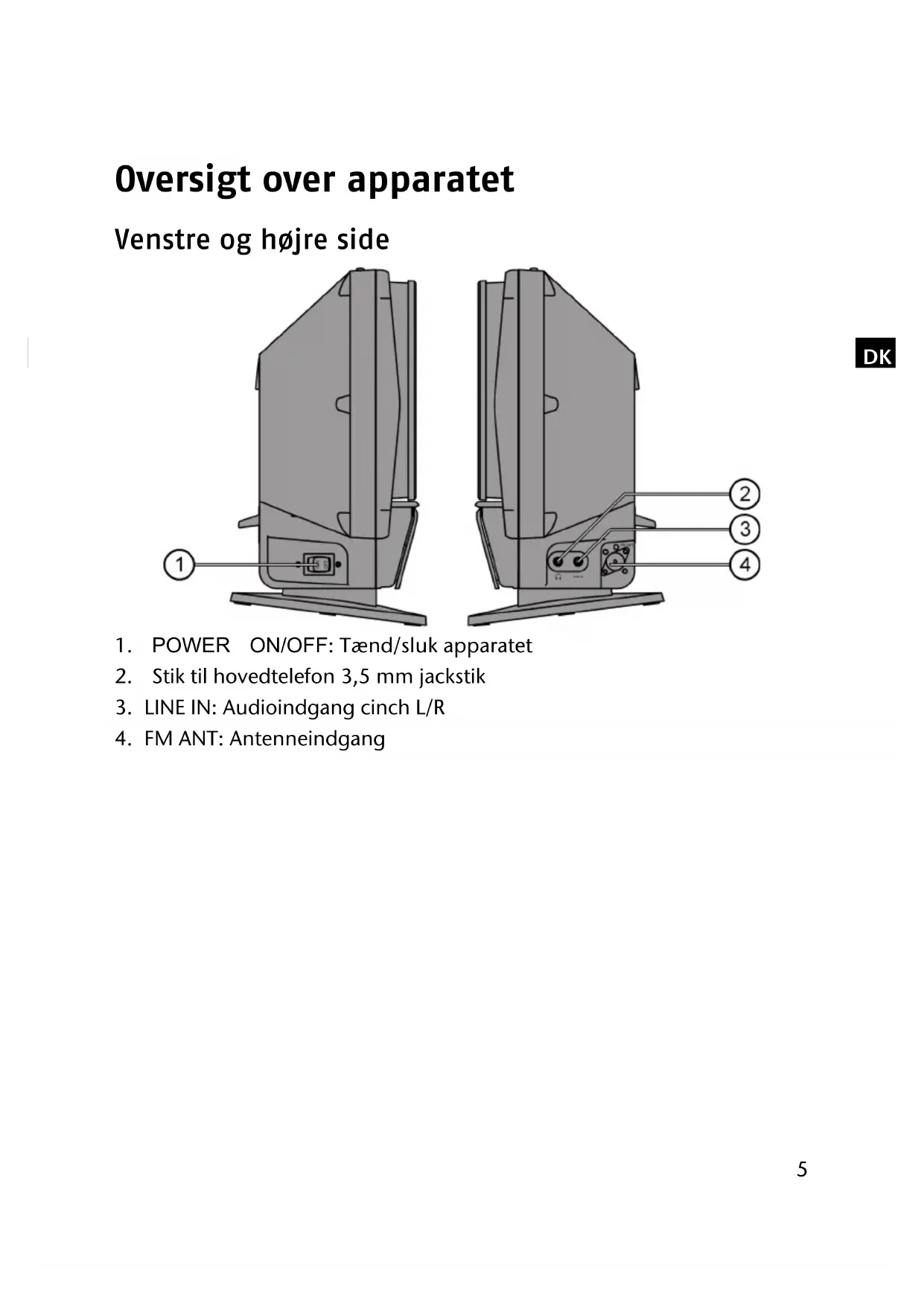 Forberedelse Kontroller pakkens indhold FORSIGTIG! Opbevar emballagen utilgængeligt for børn. Der er kvælningsfare. Kontroller ved udpakningen, at følgende dele medfølger: Mikroaudiosystem Fjernbetjening FM-Antenne Denne brugervejledning og garantikort Ilægning af batteriet i fjernbetjeningen Ved leveringen er der allerede blevet lagt batterier i fjernbetjeningen. For at aktivere batteriet skal du fjerne isolationsbåndet med teksten „PLEASE REMOVE IT BEFORE USE“ på fjernbetjeningens underside. Udskiftning af batteriet Fjernbetjeningen bruger et møntcellebatteri 3 V, CR2032. ADVARSEL! Eksplosionsfare ved forkert udskiftning af batterierne. Må kun udskiftes med samme eller tilsvarende batteritype. Tryk på låsen, og træk batterirummet ud. Fjern det tomme batteri, og bortskaf det sammen med andre brugte batterier. Læg det nye batteri af typen 2032 i rummet med pluspolen vendende opad. Sørg for, at polerne (+/-) vender rigtigt. Sæt batterirummet i igen.16 Placering og tilslutninger Placering af apparat Placer apparaterne på et plant, fast underlag. Læs i den forbindelse sikkerhedsanvisningerne på side 9. Visse aggressive møbellakker kan angribe apparaternes gummifødder. Stil eventuelt apparatet på et underlag. FORSIGTIG! Når du foretager tilslutninger til et eksternt apparat, skal du først frakoble alle apparaternes lysnetstik! Montering af foden Når du placerer apparatet, skal du anvende den medfølgende fod. Sæt apparatet med de 4 kroge i de tilsvarende indhak på foden, og skub derefter apparatet på foden, til det går i indgreb. Hvis du vil fjerne foden igen, skal du skubbe foden i retning af apparatets bagside og derefter trække det af. Vægmontering Du kan montere det primære apparat på en væg. Hvis du vil gøre det, skal du sætte to skruer i væggen. Skruehovederne skal passe til monteringshullerne på apparatets bagside. FORSIGTIG! Kontroller, at der ikke er trukket nogen strøm- eller forsyningskabler i væggen, inden du borer hullerne til monteringen. Marker de huller, der skal bores. Afstand mellem borehullerne for apparatet: 160 mm. Bor i disse markeringer 2 huller til 6 mm rawlplugs. Sæt 6 mm rawlplugs i de borede huller. Sæt skruerne i rawlplugsene, og skru dem fast med en skruetrækker.17