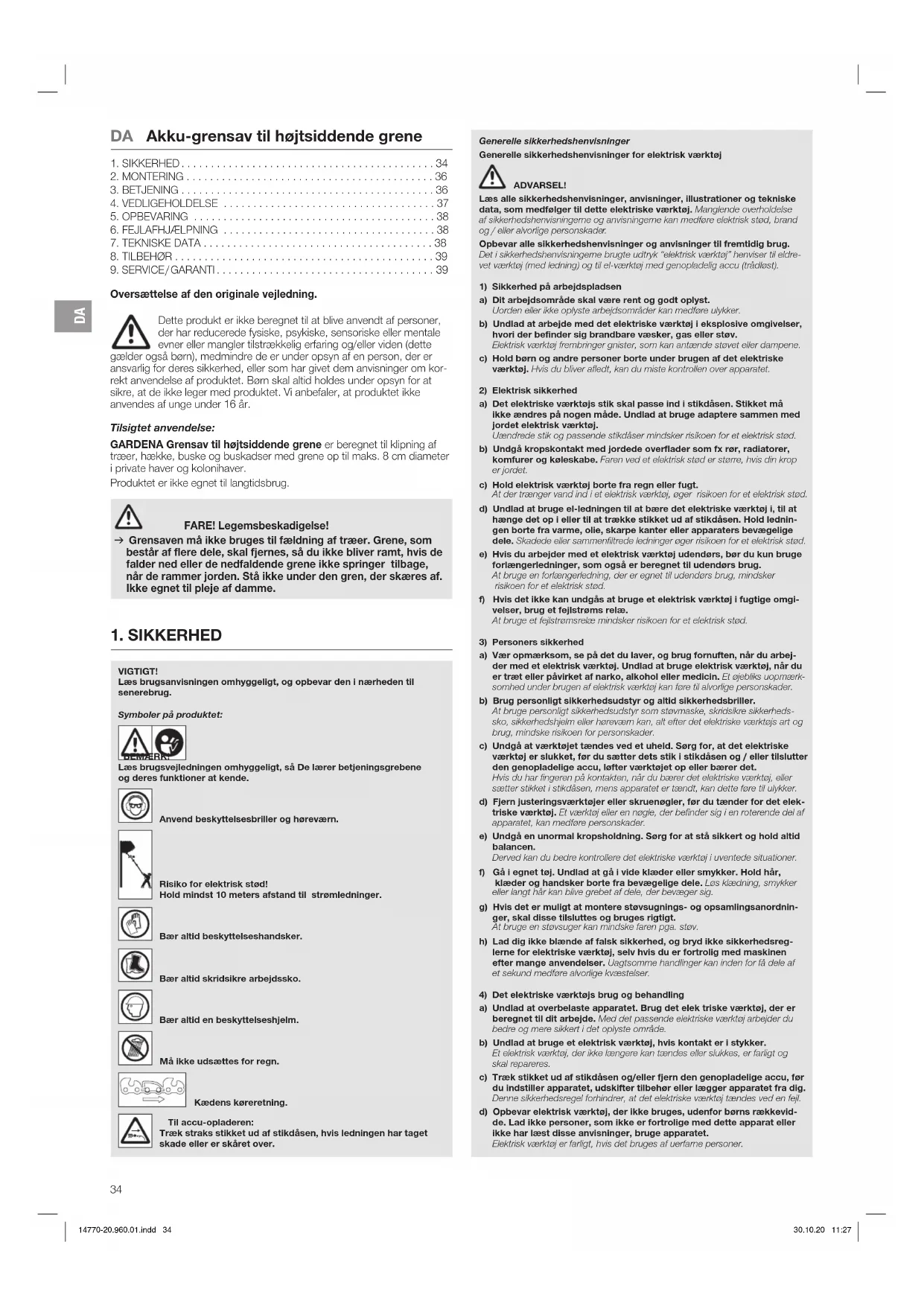 Oversættelse af den originale vejledning. Dette produkt er ikke beregnet til at blive anvendt af personer, der har reducerede fysiske, psykiske, sensoriske eller mentale evner eller mangler tilstrækkelig erfaring og/eller viden (dette gælder også børn), medmindre de er under opsyn af en person, der er ansvarlig for deres sikkerhed, eller som har givet dem anvisninger om kor- rekt anvendelse af produktet. Børn skal altid holdes under opsyn for at sikre, at de ikke leger med produktet. Vi anbefaler, at produktet ikke anvendes af unge under 16 år. Tilsigtet anvendelse: GARDENA Grensav til højtsiddende grene er beregnet til klipning af træer, hække, buske og buskadser med grene op til maks. 8 cm diameter i private haver og kolonihaver. Produktet er ikke egnet til langtidsbrug. FARE! Legemsbeskadigelse! v Grensaven må ikke bruges til fældning af træer. Grene, som består af flere dele, skal fjernes, så du ikke bliver ramt, hvis de falder ned eller de nedfaldende grene ikke springer tilbage, når de rammer jorden. Stå ikke under den gren, der skæres af. Ikke egnet til pleje af damme. Generelle sikkerhedshenvisninger Generelle sikkerhedshenvisninger for elektrisk værktøj ADVARSEL! Læs alle sikkerhedshenvisninger, anvisninger, illustrationer og tekniske data, som medfølger til dette elektriske værktøj. Manglende overholdelse af sikkerhedshenvisningerne og anvisningerne kan medføre elektrisk stød, brand og / eller alvorlige personskader. Opbevar alle sikkerhedshenvisninger og anvisninger til fremtidig brug. Det i sikkerhedshenvisningerne brugte udtryk “elektrisk værktøj” henviser til eldre- vet værktøj (med ledning) og til el-værktøj med genopladelig accu (trådløst).