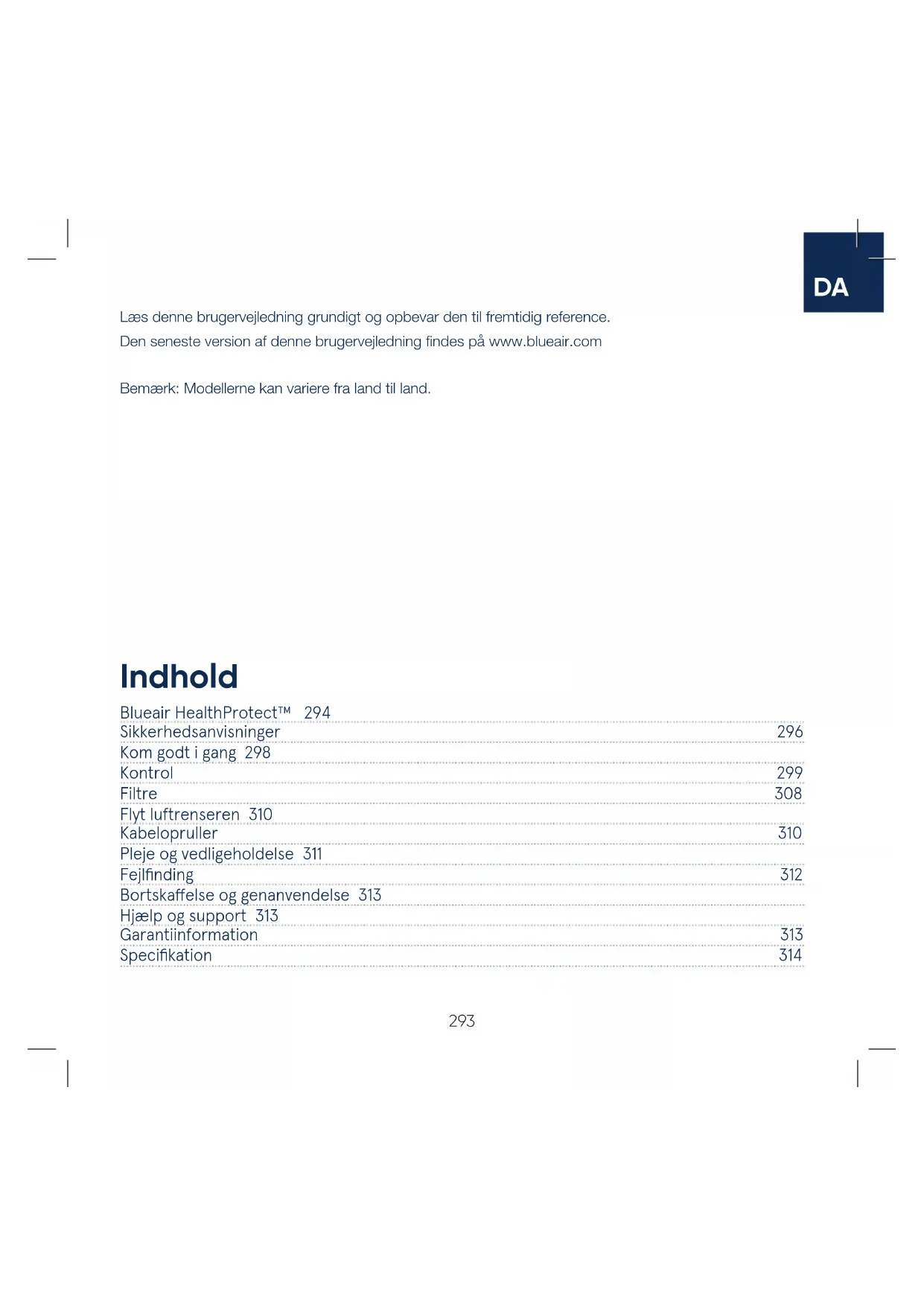 Blueair HealthProtect™ 294 Sikkerhedsanvisninger 296 Kom godt i gang 298 Kontrol 299 Filtre 308 Flyt luftrenseren 310 Kabelopruller 310 Pleje og vedligeholdelse 311 Fejlfinding 312 Bortskaelse og genanvendelse 313 Hjælp og support 313 Garantiinformation 313 Specifikation 314 Indhold Læs denne brugervejledning grundigt og opbevar den til fremtidig reference. Den seneste version af denne brugervejledning findes på www.blueair.com Bemærk: Modellerne kan variere fra land til land.294 Blueair HealthProtect™ Blueair HealthProtect™-luftrensere fås i tre modeller: 10-modellerne, 40-modellerne og 70-modellerne. Alle modeller er Wi-Fi aktiveret, har en GermShield