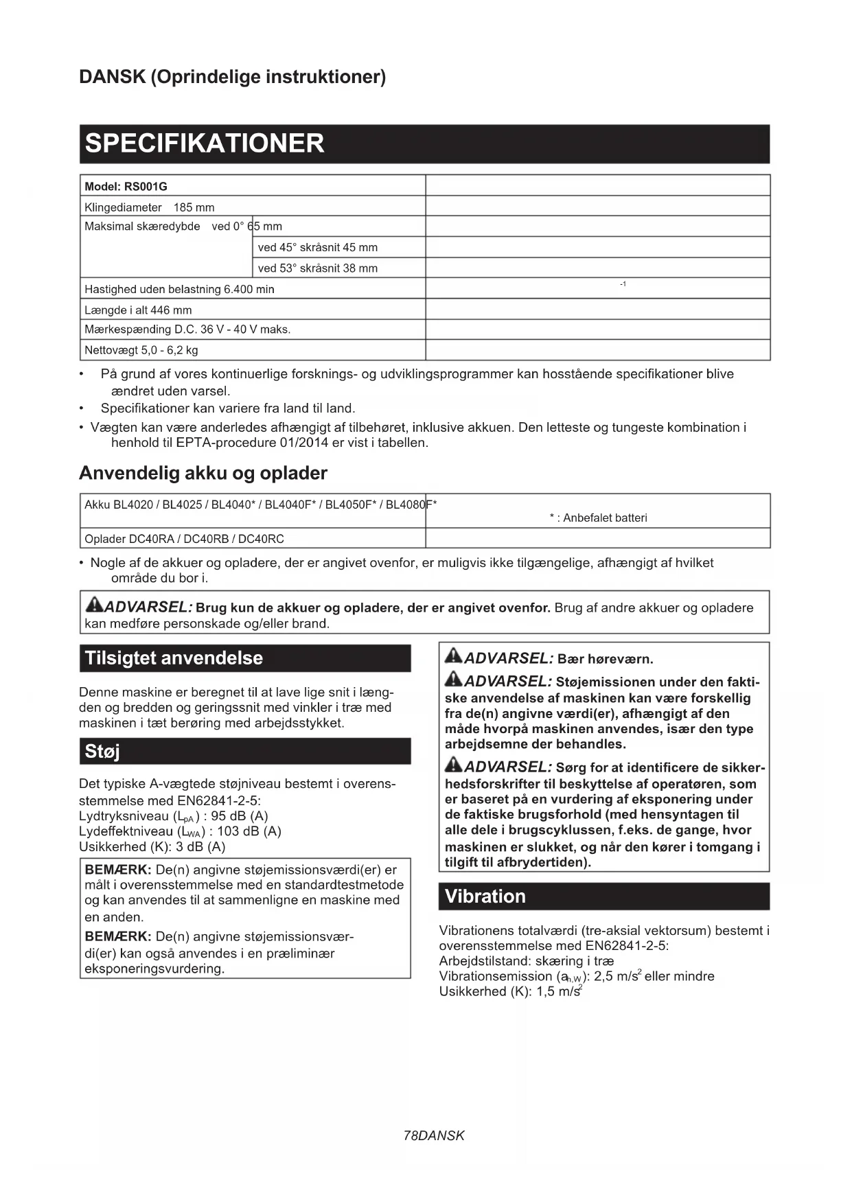 - Nogle af de akkuer og opladere, der er angivet ovenfor, er muligvis ikke tilgængelige, afhængigt af hvilket område du bor i. ADVARSEL: Brug kun de akkuer og opladere, der er angivet ovenfor. Brug af andre akkuer og opladere kan medføre personskade og/eller brand. Tilsigtet anvendelse Denne maskine er beregnet til at lave lige snit i læng- den og bredden og geringssnit med vinkler i træ med maskinenitætberøringmedarbejdsstykket. Støj DettypiskeA-vægtedestøjniveaubestemtioverens- stemmelse med EN62841-2-5: Lydtryksniveau(L