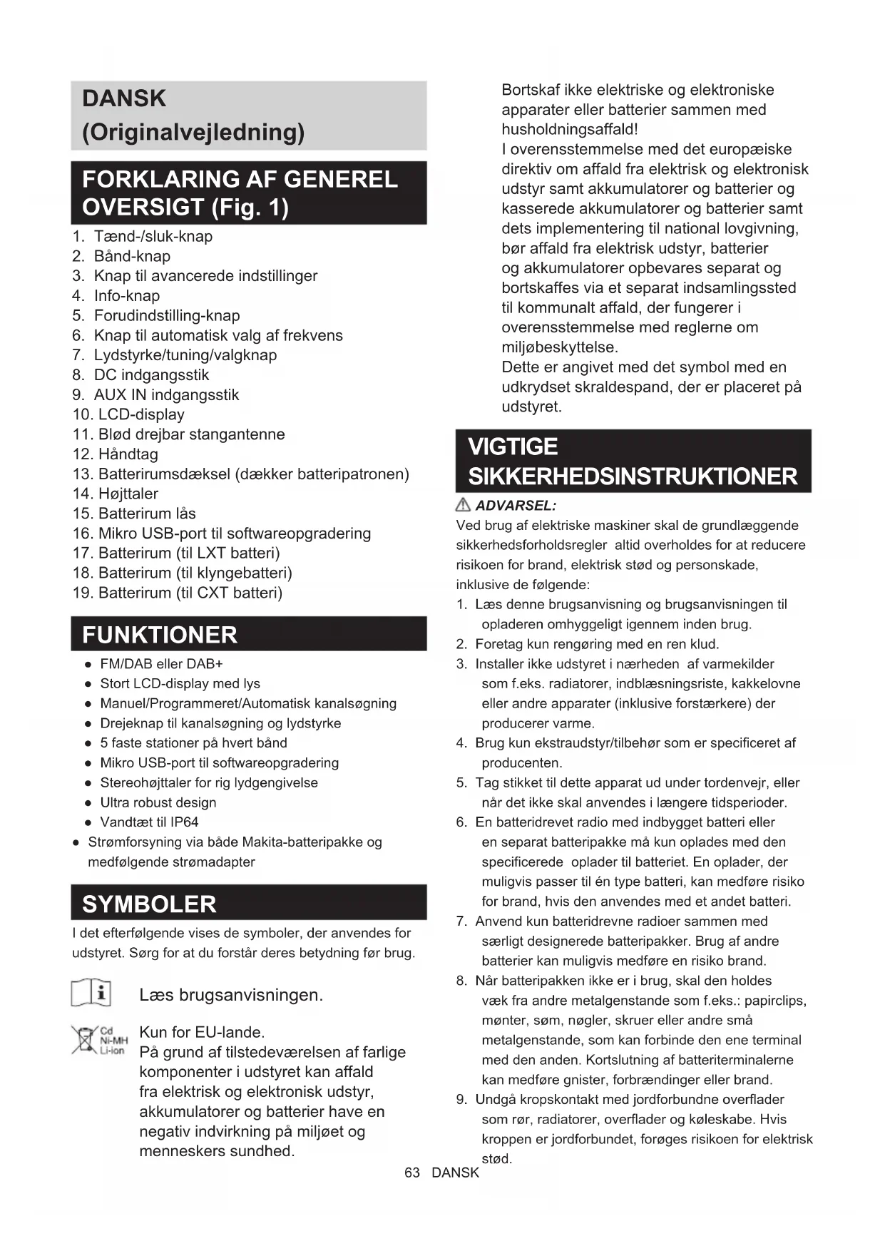 FUNKTIONER ● FM/DAB eller DAB+ ● Stort LCD-display med lys ● Manuel/Programmeret/Automatisk kanalsøgning ● Drejeknap til kanalsøgning og lydstyrke ● 5 faste stationer på hvert bånd ● Mikro USB-port til softwareopgradering ● Stereohøjttaler for rig lydgengivelse ● Ultra robust design ● Vandtæt til IP64 ● Strømforsyning via både Makita-batteripakke og medfølgende strømadapter SYMBOLER I det efterfølgende vises de symboler, der anvendes for udstyret. Sørg for at du forstår deres betydning før brug. Læs brugsanvisningen. Kun for EU-lande. På grund af tilstedeværelsen af farlige komponenter i udstyret kan affald fra elektrisk og elektronisk udstyr, akkumulatorer og batterier have en negativ indvirkning på miljøet og menneskers sundhed. Bortskaf ikke elektriske og elektroniske apparater eller batterier sammen med husholdningsaffald! I overensstemmelse med det europæiske direktiv om affald fra elektrisk og elektronisk udstyr samt akkumulatorer og batterier og kasserede akkumulatorer og batterier samt dets implementering til national lovgivning, bør affald fra elektrisk udstyr, batterier og akkumulatorer opbevares separat og bortskaffes via et separat indsamlingssted til kommunalt affald, der fungerer i overensstemmelse med reglerne om miljøbeskyttelse. Dette er angivet med det symbol med en udkrydset skraldespand, der er placeret på udstyret. VIGTIGE SIKKERHEDSINSTRUKTIONER ADVARSEL: Ved brug af elektriske maskiner skal de grundlæggende sikkerhedsforholdsregler altid overholdes for at reducere risikoen for brand, elektrisk stød og personskade, inklusive de følgende: