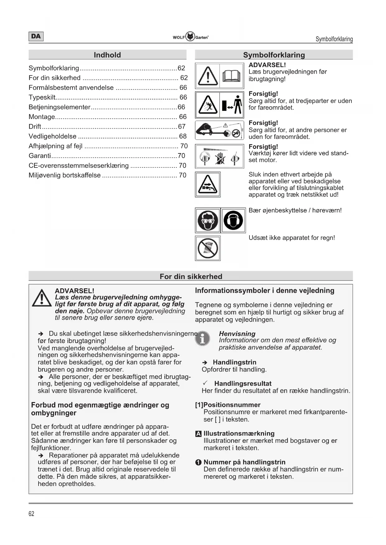 ADVARSEL! Læs denne brugervejledning omhygge- ligt før første brug af dit apparat, og følg den nøje.2SEHYDUGHQQHEUXJHUYHMOHGQLQJ WLOVHQHUHEUXJHOOHUVHQHUHHMHUH Î Du skal ubetinget læse sikkerhedshenvisningerne før første ibrugtagning! Ved manglende overholdelse af brugervejled- ningen og sikkerhedshenvisningerne kan appa- ratet blive beskadiget, og der kan opstå farer for brugeren og andre personer. Î Alle personer, der er beskæftiget med ibrugtag- ning, betjening og vedligeholdelse af apparatet, VNDOYUHWLOVYDUHQGHNYDOL¿FHUHW Forbud mod egenmægtige ændringer og ombygninger Det er forbudt at udføre ændringer på appara- tet eller at fremstille andre apparater ud af det. Sådanne ændringer kan føre til personskader og fejlfunktioner. Î Reparationer på apparatet må udelukkende udføres af personer, der har beføjelse til og er trænet i det. Brug altid originale reservedele til dette. På den måde sikres, at apparatsikker- heden opretholdes. Informationssymboler i denne vejledning Tegnene og symbolerne i denne vejledning er beregnet som en hjælp til hurtigt og sikker brug af apparatet og vejledningen. Henvisning ,QIRUPDWLRQHURPGHQPHVWH௺HNWLYHRJ SUDNWLVNHDQYHQGHOVHDIDSSDUDWHW Î Handlingstrin Opfordrer til handling. 3 Handlingsresultat +HU¿QGHUGXUHVXOWDWHWDIHQUNNHKDQGOLQJVWULQ [1]Positionsnummer 3RVLWLRQVQXPUHHUPDUNHUHWPHG¿UNDQWSDUHQWH- ser [ ] i teksten.