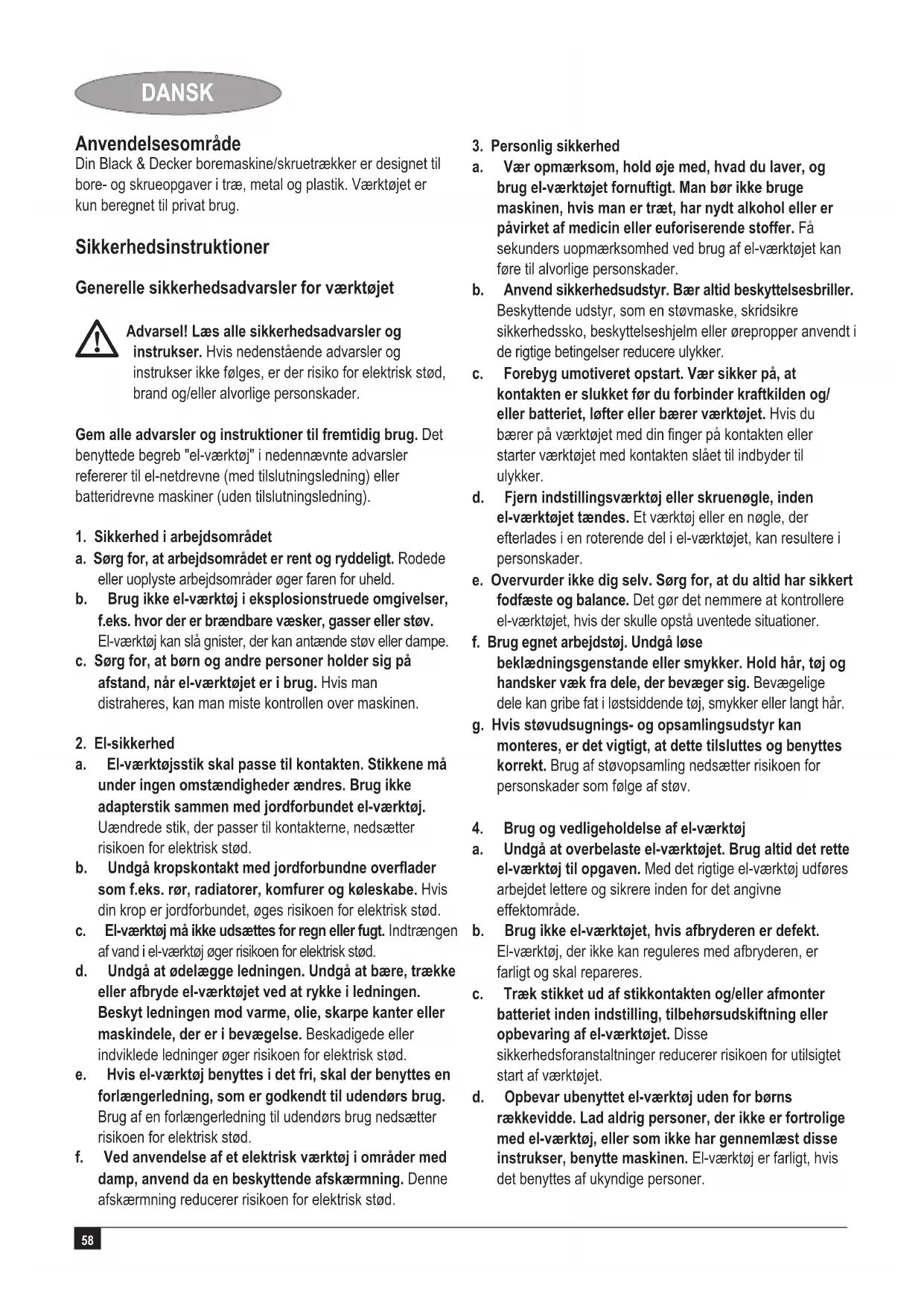 Advarsel!Læsallesikkerhedsadvarslerog instrukser. Hvis nedenstående advarsler og instrukser ikke følges, er der risiko for elektrisk stød, brand og/eller alvorlige personskader. Gem alle advarsler og instruktioner til fremtidig brug. Det benyttede begreb "el-værktøj" i nedennævnte advarsler refererer til el-netdrevne (med tilslutningsledning) eller batteridrevne maskiner (uden tilslutningsledning).