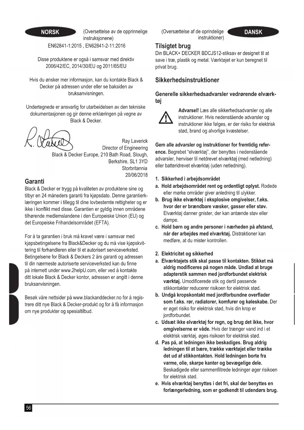 BDCJS12 stiksav Black & Decker erklærer, at produkterne beskrevet under ”Tekniske data” er i overensstemmelse med: EN62841-1:2015, EN62841-2-11:2016 Disse produkter er endvidere i overensstemmelse med direktiv 2006/42/EC, 2014/30/EU og 2011/65/EU Kontakt Black & Decker på nedenstående adresse eller se vejledningens bagside for at få yderligere oplysninger. Undertegnede er ansvarlig for udarbejdelsen af de tekniske data og fremsætter denne erklæring på vegne af Black & Decker. Ray Laverick Direktør for konstruktioner Black & Decker Europe, 210 Bath Road, Slough, Berkshire, SL1 3YD Storbritannien 20/06/2018 Garanti Black & Decker er sikker på kvaliteten af sine produkter og tilbyder forbrugerne en garanti på 24 måneder fra købsdatoen. Garantien er et tillæg til forbrugerens lovmæs- sige rettigheder og påvirker ikke disse. Garantien er gyldig inden for medlemsstaterne af Den Europæiske Union og Det Europæiske Frihandelsområde. Når du gør krav på garantien, skal kravet være i overens- stemmelse med Black & Decker vilkår og betingelser, og du skal indsende dokumentation for købet til sælgeren eller til en autoriseret reparatør. Vilkår og betingelser for Black & Decker 2 års garanti og placeringen af dit nærmeste autoriserede serviceværksted kan fås på internettet på www.2helpU.com, eller ved at kontakte dit lokale Black & Decker kontor på den adresse, der er angivet i denne vejledning. Besøg venligst vores websted www.blackanddecker.co.uk for at registrere dit nye Black & Decker produkt og modtage opdateringer om nye produkter og specielle tilbud.62 (Alkuperäisten ohjeiden käännös) SUOMI Käyttötarkoitus BLACK+DECKER BDCJS12 -pistosaha on suunniteltu puun, muovin ja metallin sahaamiseen. Tämä työkalu on tarkoitettu vain yksityiskäyttöön. Turvallisuusohjeet Sähkötyökalujen yleiset turvavaroitukset