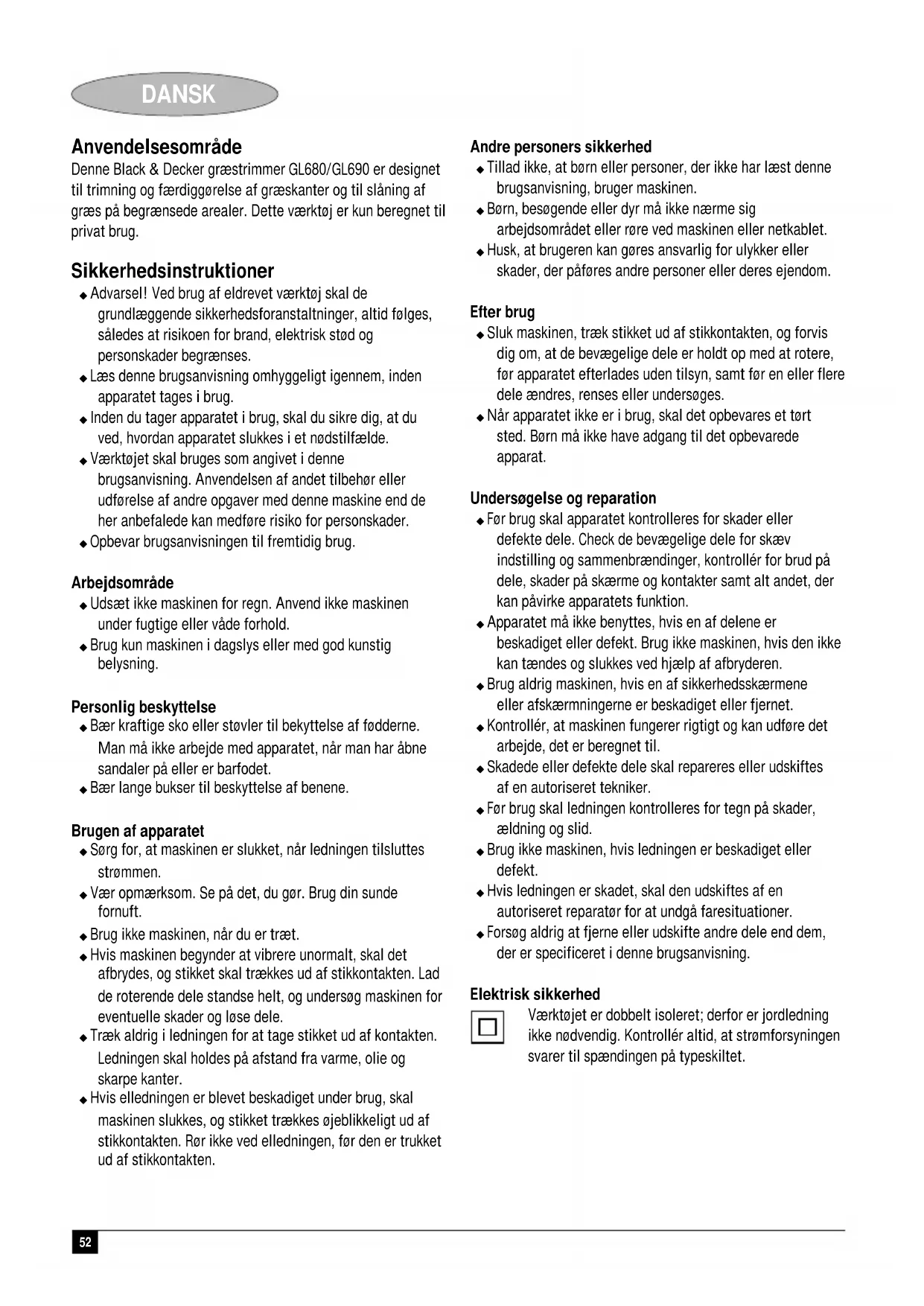 Kevin Hewitt Director of Consumer Engineering Spennymoor, County Durham DL16 6JG, United Kingdom Reservdeler / reparasjoner Reservdeler kan kjøpes hos autoriserte Black & Decker serviceverksteder, som også gir kostnadsoverslag og reparerer våre produkter. Oversikt over våre autoriserte serviceverksteder finnes på Internet, vår hjemmeside www.blackdecker.no samt www.2helpU.com. Garanti Black & Decker garanterer at produktet ikke har material- og/ eller fabrikasjonsfeil ved levering til kunde. Garantien er i tillegg til kundens lovlige rettigheter og påvirker ikke disse. Garantien gjelder innen medlemsstatene i den Europeiske Unionen og i det Europeiske Frihandelsområdet. Hvis et Black & Decker produkt går i stykker på grunn av material- og/eller fabrikasjonsfeil eller har mangler i forhold til spesifikasjonene, innen 24 måneder fra kjøpet, påtar Black & Decker seg å reparere eller bytte ut produktet med minst mulig vanskelighet for kunden. Garantien gjelder ikke for feil som kommer av: ◆ normal slittasje ◆ feilaktig bruk eller vedlikehold (mislighold) ◆ at produktet har blitt skadet av fremmede gjenstander, emner eller ved et uhell Det gjøres oppmerksom på at produktet ikke er beregnet på industriell/profesjonell/yrkesmessig bruk, men til hus- og hjemmebruk. Garantien gjelder ikke om reparasjoner har blitt utført av noen andre enn et autorisert Black & Decker serviceverksted. For å ta garantien i bruk skal produktet og kjøpekvittering leveres til forhandleren eller til et autorisert serviceverksted senest 2 måneder etter at feilen har blitt oppdaget. For informasjon om nærmeste autoriserte serviceverksted; kontakt det lokale Black & Decker kontoret på den adressen som er angitt i bruksanvisningen. En oversikt over alle autoriserte serviceverksteder samt servicevilkår finnes også tilgjengelig på Internet, adresse: www.2helpU.com.52 DANSK Anvendelsesområde Denne Black & Decker græstrimmer GL680/GL690 er designet til trimning og færdiggørelse af græskanter og til slåning af græs på begrænsede arealer. Dette værktøj er kun beregnet til privat brug. Sikkerhedsinstruktioner ◆ Advarsel! Ved brug af eldrevet værktøj skal de grundlæggende sikkerhedsforanstaltninger, altid følges, således at risikoen for brand, elektrisk stød og personskader begrænses. ◆ Læs denne brugsanvisning omhyggeligt igennem, inden apparatet tages i brug. ◆ Inden du tager apparatet i brug, skal du sikre dig, at du ved, hvordan apparatet slukkes i et nødstilfælde. ◆ Værktøjet skal bruges som angivet i denne brugsanvisning. Anvendelsen af andet tilbehør eller udførelse af andre opgaver med denne maskine end de her anbefalede kan medføre risiko for personskader. ◆ Opbevar brugsanvisningen til fremtidig brug. Arbejdsområde ◆ Udsæt ikke maskinen for regn. Anvend ikke maskinen under fugtige eller våde forhold. ◆ Brug kun maskinen i dagslys eller med god kunstig belysning. Personlig beskyttelse ◆ Bær kraftige sko eller støvler til bekyttelse af fødderne. Man må ikke arbejde med apparatet, når man har åbne sandaler på eller er barfodet. ◆ Bær lange bukser til beskyttelse af benene. Brugen af apparatet ◆ Sørg for, at maskinen er slukket, når ledningen tilsluttes strømmen. ◆ Vær opmærksom. Se på det, du gør. Brug din sunde fornuft. ◆ Brug ikke maskinen, når du er træt. ◆ Hvis maskinen begynder at vibrere unormalt, skal det afbrydes, og stikket skal trækkes ud af stikkontakten. Lad de roterende dele standse helt, og undersøg maskinen for eventuelle skader og løse dele. ◆ Træk aldrig i ledningen for at tage stikket ud af kontakten. Ledningen skal holdes på afstand fra varme, olie og skarpe kanter. ◆ Hvis elledningen er blevet beskadiget under brug, skal maskinen slukkes, og stikket trækkes øjeblikkeligt ud af stikkontakten. Rør ikke ved elledningen, før den er trukket ud af stikkontakten. Andre personers sikkerhed ◆ Tillad ikke, at børn eller personer, der ikke har læst denne brugsanvisning, bruger maskinen. ◆ Børn, besøgende eller dyr må ikke nærme sig arbejdsområdet eller røre ved maskinen eller netkablet. ◆ Husk, at brugeren kan gøres ansvarlig for ulykker eller skader, der påføres andre personer eller deres ejendom. Efter brug ◆ Sluk maskinen, træk stikket ud af stikkontakten, og forvis dig om, at de bevægelige dele er holdt op med at rotere, før apparatet efterlades uden tilsyn, samt før en eller flere dele ændres, renses eller undersøges. ◆ Når apparatet ikke er i brug, skal det opbevares et tørt sted. Børn må ikke have adgang til det opbevarede apparat. Undersøgelse og reparation ◆ Før brug skal apparatet kontrolleres for skader eller defekte dele. Check de bevægelige dele for skæv indstilling og sammenbrændinger, kontrollér for brud på dele, skader på skærme og kontakter samt alt andet, der kan påvirke apparatets funktion. ◆ Apparatet må ikke benyttes, hvis en af delene er beskadiget eller defekt. Brug ikke maskinen, hvis den ikke kan tændes og slukkes ved hjælp af afbryderen. ◆ Brug aldrig maskinen, hvis en af sikkerhedsskærmene eller afskærmningerne er beskadiget eller fjernet. ◆ Kontrollér, at maskinen fungerer rigtigt og kan udføre det arbejde, det er beregnet til. ◆ Skadede eller defekte dele skal repareres eller udskiftes af en autoriseret tekniker. ◆ Før brug skal ledningen kontrolleres for tegn på skader, ældning og slid. ◆ Brug ikke maskinen, hvis ledningen er beskadiget eller defekt. ◆ Hvis ledningen er skadet, skal den udskiftes af en autoriseret reparatør for at undgå faresituationer. ◆ Forsøg aldrig at fjerne eller udskifte andre dele end dem, der er specificeret i denne brugsanvisning. Elektrisk sikkerhed Værktøjet er dobbelt isoleret; derfor er jordledning ikke nødvendig. Kontrollér altid, at strømforsyningen svarer til spændingen på typeskiltet.53 DANSK Ekstra sikkerhedsvejledning til græstrimmere Følgende advarselssym