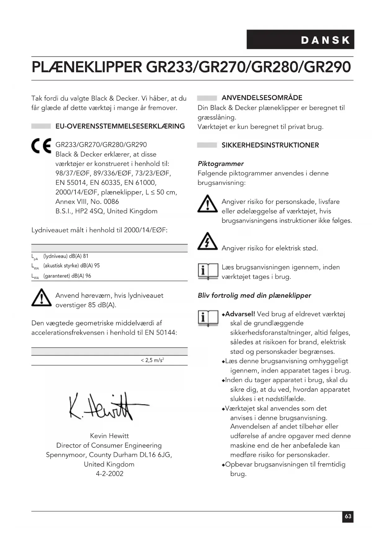 Tak fordi du valgte Black & Decker. Vi håber, at du får glæde af dette værktøj i mange år fremover. EU-OVERENSSTEMMELSESERKLÆRING GR233/GR270/GR280/GR290 Black & Decker erklærer, at disse værktøjer er konstrueret i henhold til: 98/37/EØF, 89/336/EØF, 73/23/EØF, EN 55014, EN 60335, EN 61000, 2000/14/EØF, plæneklipper, L ≤ 50 cm, Annex VIII, No. 0086 B.S.I., HP2 4SQ, United Kingdom Lydniveauet målt i henhold til 2000/14/EØF: