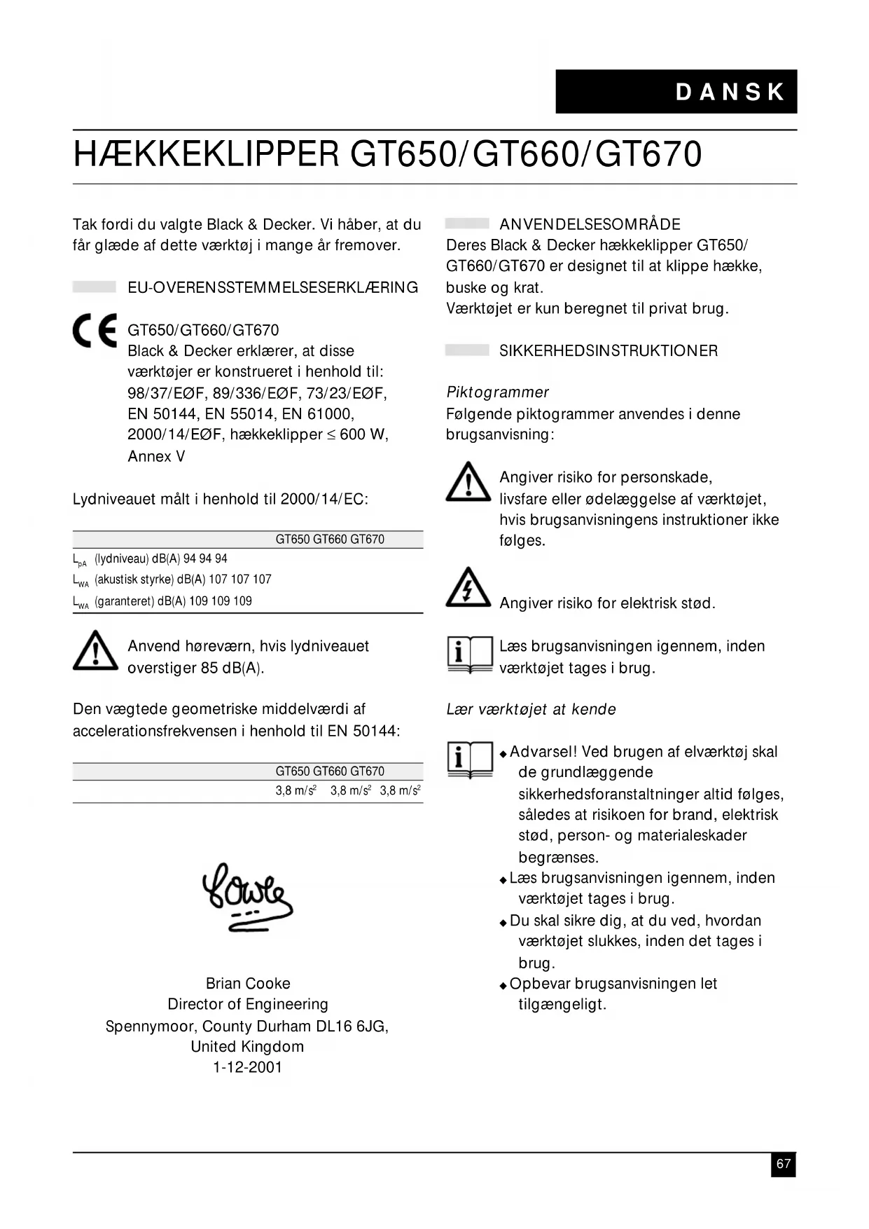 Tak fordi du valgte Black & Decker. Vi håber, at du får glæde af dette værktøj i mange år fremover. EU-OVERENSSTEMMELSESERKLÆRING GT650/GT660/GT670 Black & Decker erklærer, at disse værktøjer er konstrueret i henhold til: 98/37/EØF, 89/336/EØF, 73/23/EØF, EN 50144, EN 55014, EN 61000, 2000/14/EØF, hækkeklipper ≤ 600 W, Annex V Lydniveauet målt i henhold til 2000/14/EC: GT650 GT660 GT670