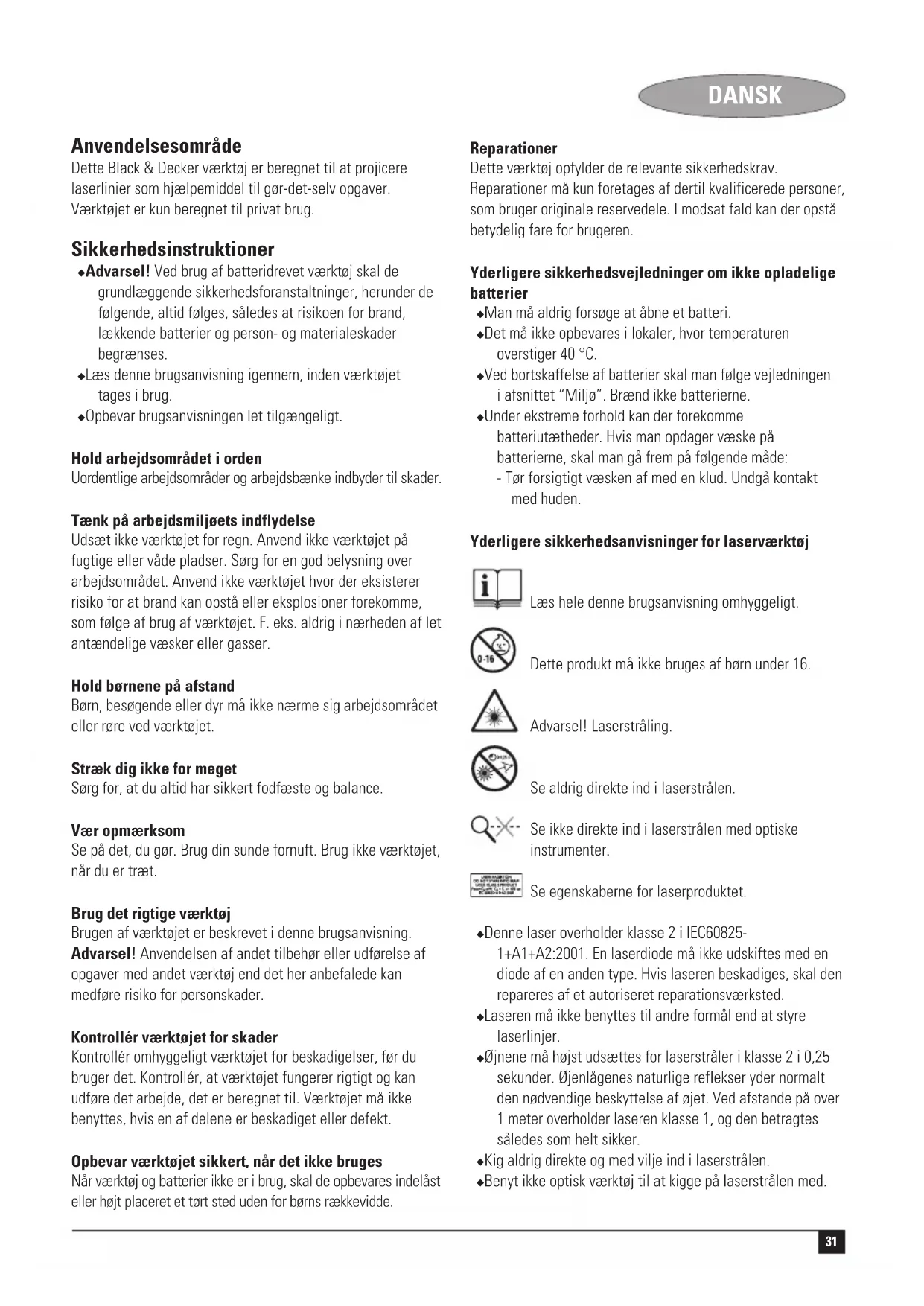 Montering Advarsel! Kontroller at verktøyet er slått av. Plassering av batteriene (fig. A) ◆ Fjern batterilokket (4) fra verktøyet. ◆ Sett batteriene inn i verktøyet i den retningen som er vist. ◆ Sett på lokket igjen og la det klikke på plass. Veggmontering (fig. B & C) Verktøyet kan monteres på vegg ved hjelp av veggfestet (5 eller 6). Veggbolten (5) brukes til å henge verktøyet på gipsplater. Nøkkelhullfestet (6) brukes til å henge verktøyet på andre veggtyper ved bruk av en skrue eller spiker. Advarsel! Oppbevar veggfestene på et trygt sted når de ikke er i bruk. Veggstift ◆ Vipp opp stiften (7). ◆ Hold veggbolten foran et passende monteringssted og trykk bolten rett inn i veggen. ◆ Installer verktøyet ved å feste magneten (8) til veggbolten (5). Advarsel! Veggboltene er skarpe, så vær forsiktig når du håndterer dem. Nøkkelhullfeste ◆ Skru inn en skrue eller slå inn en spiker i veggen. ◆ Heng veggfestet (6) på festepunktet. ◆ Installer verktøyet ved å feste magneten (8) til nøkkelhullfestet (6). Bruk (fig. D) ◆ Plasser verktøyet flatt mot veggen som vist. ◆ Skyv strømbryteren (1) opp for å slå verktøyet på. ◆ Flytt verktøyet etter behov for å posisjonere laserstrålen. ◆ Heng verktøyet på veggen med det egnede veggfestet. Justering av laserstrålen (fig. E) ◆ For å projisere en vertikal stråle, juster verktøyet til vaterpasset (9) er på nivå. ◆ For å projisere en horisontal stråle, juster verktøyet til vaterpasset (10) er på nivå. Bruk av skalaen Skalaen (11) på veggfestet kan brukes til vinkeljustering. ◆ Juster 0°-posisjonen på skalaen mot pekeren på verktøyet ved å dreie på veggbolten. ◆ Kontroller vinkelen ved å justere skalaen etter behov. Miljøvern Kildesortering. Dette produktet må ikke kastes i det vanlige husholdningsavfallet. Hvis du finner ut at Black & Decker-produktet ditt må skiftes ut, eller hvis du ikke lenger har bruk for det, må du unnlate å kaste det sammen med det vanlige husholdningsavfallet. Sørg for at dette produktet gjøres tilgjengelig for kildesortering. Kildesortering av brukte produkter og emballasje gjør det mulig å resirkulere materialer og bruke dem igjen. Gjenbruk av resirkulerte materialer bidrar til å forhindre forsøpling av miljøet og reduserer behovet for råmaterialer. Lokale regelverk kan legge tilrette for kildesortering av elektriske produkter fra husholdningen, ved kommunale deponier eller gjennom forhandleren når du kjøper et nytt produkt. Black & Decker har tilrettelagt for innsamling og resirkulering av Black & Decker-produkter etter at de har utspilt sin rolle. Ønsker du å benytte deg av denne tjenesten, returnerer du produktet ditt til et autorisert serviceverksted, som tar det imot og formidler det videre. Du kan få adressen til ditt nærmeste autoriserte serviceverksted ved å kontakte ditt lokale Black & Decker- kontor på adressen oppgitt i denne håndboken. Du kan også finne en komplett liste over autoriserte Black & Decker- serviceverksteder og utfyllende informasjon om vår ettersalgsservice og kontaktnumre på Internett på følgende adresse: www.2helpU.com Batterier Beskytt miljøet ved å levere kasserte batteriet til kildesortering. ◆ Fjern batteriene som beskrevet ovenfor. ◆ Legg batteriene i en egnet innpakning for å sikre at kontaktene ikke kan kortsluttes. ◆ Ta med batteriene til den lokale resirkuleringsstasjonen.30 NORSK Tekniske data BDL120 Spenning V 3 Batteristørrelse 2 x LR6 (AA) Laserklasse 2 Driftstemperatur °C 0 - 40 Vekt (uten batteri) kg 0,2 CE-sikkerhetserklæring Black & Decker erklærer at disse verktøyer er konstruert i henhold til: EN 61010-1, IEC 60825-1, EN 61000-6-3, EN 61000-6-1 Kevin Hewitt Director of Consumer Engineering Spennymoor, County Durham DL16 6JG, United Kingdom 1-10-2005 Reservdeler / reparasjoner Reservdeler kan kjøpes hos autoriserte Black & Decker serviceverksteder, som også gir kostnadsoverslag og reparerer våre produkter. Oversikt over våre autoriserte serviceverksteder finnes på Internet, vår hjemmeside www.blackanddecker.no samt www.2helpU.com Garanti Black & Decker garanterer at produktet ikke har material- og/ eller fabrikasjonsfeil ved levering til kunde. Garantien er i tillegg til kundens lovlige rettigheter og påvirker ikke disse. Garantien gjelder innen medlemsstatene i den Europeiske Unionen og i det Europeiske Frihandelsområdet. Hvis et Black & Decker produkt går i stykker på grunn av material- og/eller fabrikasjonsfeil eller har mangler i forhold til spesifikasjonene, innen 24 måneder fra kjøpet, påtar Black & Decker seg å reparere eller bytte ut produktet med minst mulig vanskelighet for kunden. Garantien gjelder ikke for feil som kommer av: ◆ normal slittasje ◆ feilaktig bruk eller vedlikehold (mislighold) ◆ at produktet har blitt skadet av fremmede gjenstander, emner eller ved et uhell Det gjøres oppmerksom på at produktet ikke er beregnet på industriell/profesjonell/yrkesmessig bruk, men til hus- og hjemmebruk. Garantien gjelder ikke om reparasjoner har blitt utført av noen andre enn et autorisert Black & Decker serviceverksted. For å ta garantien i bruk skal produktet og kjøpekvittering leveres til forhandleren eller til et autorisert serviceverksted senest 2 måneder etter at feilen har blitt oppdaget. For informasjon om nærmeste autoriserte serviceverksted; kontakt det lokale Black & Decker kontoret på den adressen som er angitt i bruksanvisningen. En oversikt over alle autoriserte serviceverksteder samt servicevilkår finnes også tilgjengelig på Internet, adresse: www.2helpU.com Vennligst stikk innom våre nettsider på www.blackanddecker.no for å registrere ditt nye Black & Decker-produkt og for å holde deg oppdatert om nye produkter og spesialtilbud. Du finner mer informasjon om Black & Decker og produktutvalget vårt på www.blackanddecker.no31 DANSK Anvendelsesområde Dette Black & Decker værktøj er beregnet til a