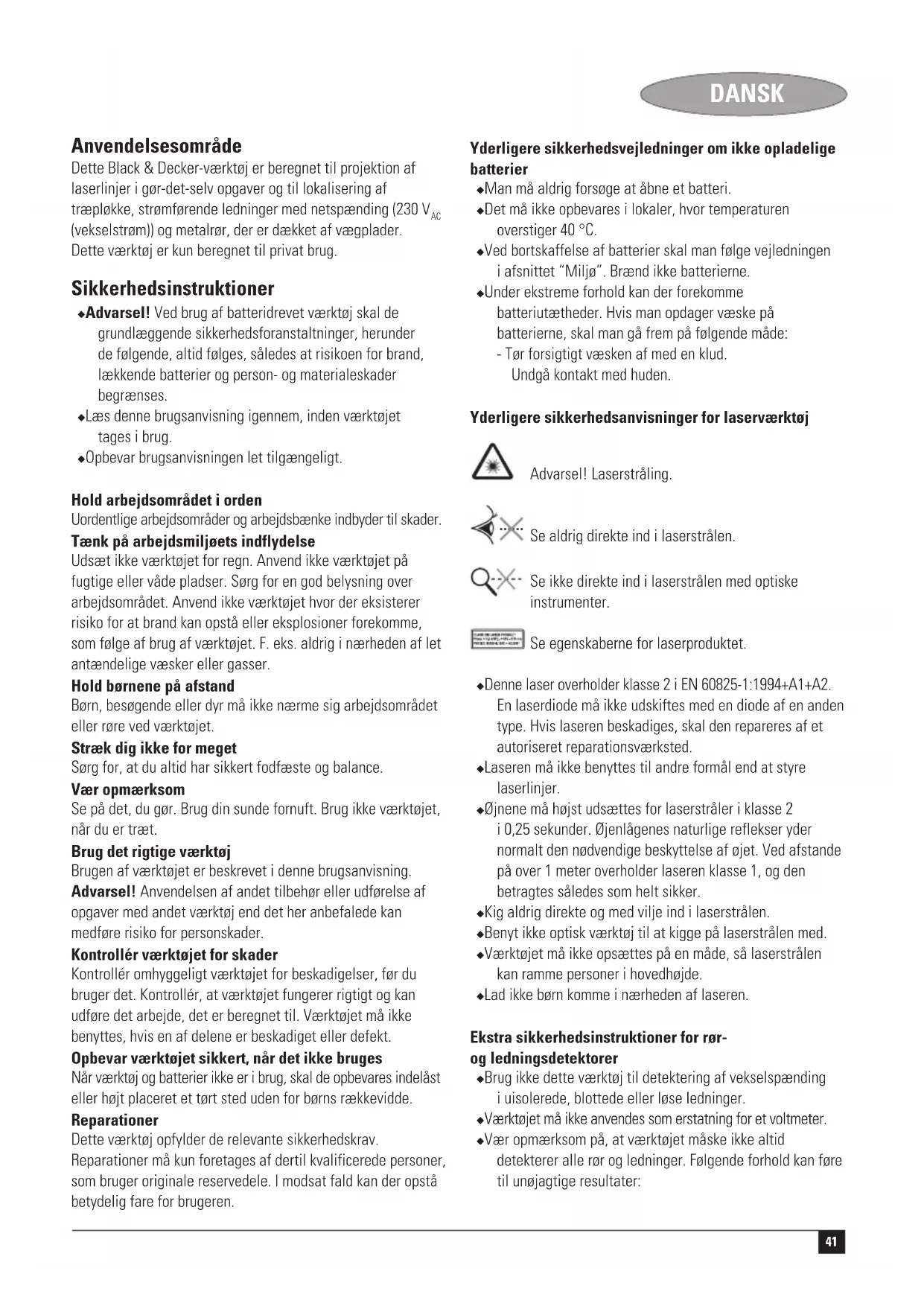 Kevin Hewitt Director of Consumer Engineering Spennymoor, County Durham DL16 6JG, United Kingdom 1-12-2004 Reservedele / reparationer Reservedele kan købes hos autoriserede Black & Decker serviceværksteder, som giver forslag til omkostninger og reparerer vore produkter. Oversigt over vore autoriserede værksteder findes på internettet på vor hjemmeside www.blackanddecker.dk samt www.2helpU.com Garanti Black & Decker garanterer, at produktet er fri for materielle skader og/eller fabrikationsfejl ved levering til kunden. Garantien er et tillæg til konsumentens lovlige rettigheder og påvirker ikke disse. Garantien gælder indenfor medlemsstaterne af den Europæiske Union og i det Europæiske Frihandelsområde. Hvis et Black & Decker produkt går i stykker på grund af materiel skade og/eller fabrikationsfejl eller på anden måde ikke fungerer i overensstemmelse med specifikationen, inden for 24 måneder fra købsdatoen, påtager Black & Decker sig at reparere eller ombytte produktet med mindst muligt besvær for kunden. Garantien gælder ikke for fejl og mangler, der er sket i forbindelse med: ◆ normal slitage ◆ uheldige følger efter unormal anvendelse af værktøjet ◆ overbelastning, hærværk eller overdrevent intensivt brug af værktøjet ◆ ulykkeshændelse Garantien gælder ikke hvis reparationer er udført af nogen anden end et autoriseret Black & Decker værksted. For at udnytte garantien skal produktet og købskvitteringen indleveres til forhandleren eller til et autoriseret værksted, senest 2 måneder efter at fejlen opdages. For information om nærmeste autoriserede værksted: kontakt det lokale Black & Decker kontor på den adresse som er opgivet i brugsanvisningen. Liste over alle autoriserede Black & Decker serviceværksteder samt servicevilkår er tilgængelig på internettet, på adressen www.2helpU.com Gå venligst ind på vores website www.blackanddecker.dk for at registrere dit nye produkt og for at blive holdt ajour om nye produkter og specialtilbud. Der findes yderligere oplysninger om mærket Black & Decker og vores produktsortiment på adressen www.blackanddecker.dk45 SUOMI Käyttötarkoitus Tämä Black & Decker -laser on suunniteltu heijastamaan laserviivoja avuksi kodin nikkarointitöissä ja havaitsemaan seinälevyjen alla olevat tukirakenteet, jännitteiset virtajohdot (230 V