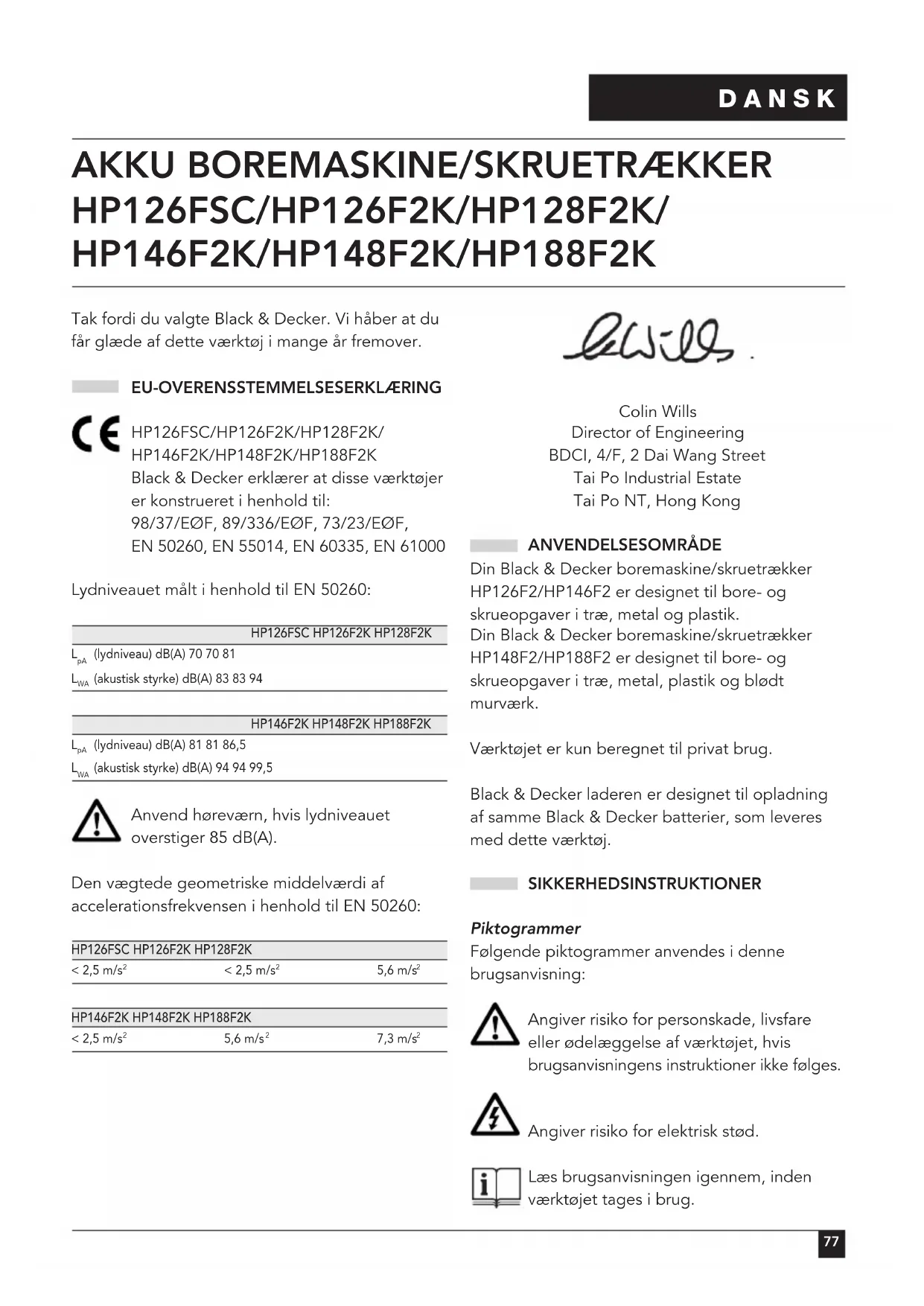 Colin Wills Director of Engineering BDCI, 4/F, 2 Dai Wang Street Tai Po Industrial Estate Tai Po NT, Hong Kong ANVENDELSESOMRÅDE Din Black & Decker boremaskine/skruetrækker HP126F2/HP146F2 er designet til bore- og skrueopgaver i træ, metal og plastik. Din Black & Decker boremaskine/skruetrækker HP148F2/HP188F2 er designet til bore- og skrueopgaver i træ, metal, plastik og blødt murværk. Værktøjet er kun beregnet til privat brug. Black & Decker laderen er designet til opladning af samme Black & Decker batterier, som leveres med dette værktøj. SIKKERHEDSINSTRUKTIONER Piktogrammer Følgende piktogrammer anvendes i denne brugsanvisning: Angiver risiko for personskade, livsfare eller ødelæggelse af værktøjet, hvis brugsanvisningens instruktioner ikke følges. Angiver risiko for elektrisk stød. Læs brugsanvisningen igennem, inden værktøjet tages i brug.78 DANSK Brandfare. Lær værktøjet at kende ◆ Advarsel! Ved brug af genopladeligt værktøj skal de grundlæggende sikkerhedsforanstaltninger, herunder de følgende, altid følges, således at risikoen for brand, lækkende batterier og person- og materialeskader begrænses. ◆ Læs denne brugsanvisning igennem, inden værktøjet tages i brug. ◆ Du skal sikre dig, at du ved, hvordan værktøjet slukkes, inden det tages i brug. ◆ Opbevar brugsanvisningen let tilgængeligt. Generelt