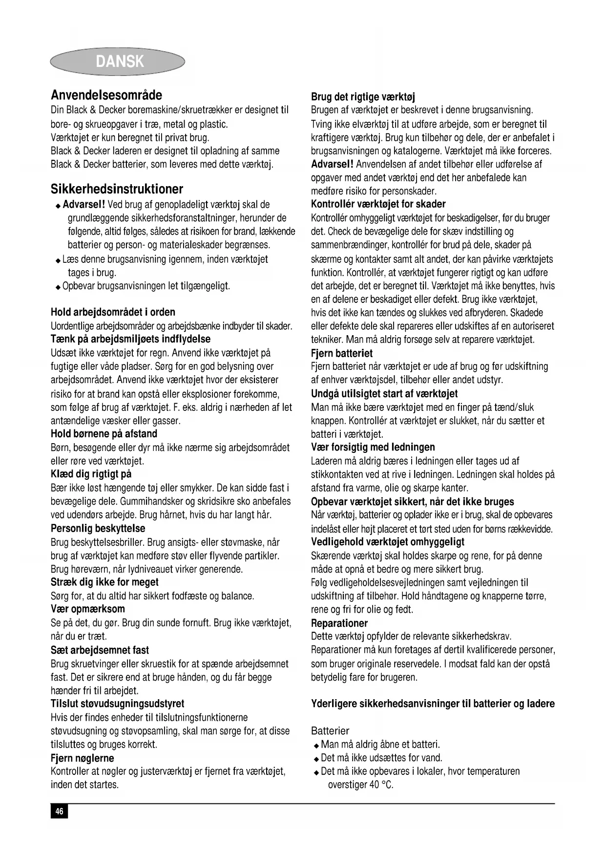 Colin Wills Director of Engineering BDCI, 4/F, 2 Dai Wang Street Tai Po Industrial Estate Tai Po NT, Hong Kong Reservdeler / reparasjoner Reservdeler kan kjøpes hos autoriserte Black & Decker serviceverksteder, som også gir kostnadsoverslag og reparerer våre produkter. Oversikt over våre autoriserte serviceverksteder finnes på Internet, vår hjemmeside www.blackdecker.no samt www.2helpU.com. Garanti Black & Decker garanterer at produktet ikke har material- og/ eller fabrikasjonsfeil ved levering til kunde. Garantien er i tillegg til kundens lovlige rettigheter og påvirker ikke disse. Garantien gjelder innen medlemsstatene i den Europeiske Unionen og i det Europeiske Frihandelsområdet. Hvis et Black & Decker produkt går i stykker på grunn av material- og/eller fabrikasjonsfeil eller har mangler i forhold til spesifikasjonene, innen 24 måneder fra kjøpet, påtar Black & Decker seg å reparere eller bytte ut produktet med minst mulig vanskelighet for kunden. Garantien gjelder ikke for feil som kommer av: ◆ normal slittasje ◆ feilaktig bruk eller vedlikehold (mislighold) ◆ at produktet har blitt skadet av fremmede gjenstander, emner eller ved et uhell Det gjøres oppmerksom på at produktet ikke er beregnet på industriell/profesjonell/yrkesmessig bruk, men til hus- og hjemmebruk. Garantien gjelder ikke om reparasjoner har blitt utført av noen andre enn et autorisert Black & Decker serviceverksted. For å ta garantien i bruk skal produktet og kjøpekvittering leveres til forhandleren eller til et autorisert serviceverksted senest 2 måneder etter at feilen har blitt oppdaget. For informasjon om nærmeste autoriserte serviceverksted; kontakt det lokale Black & Decker kontoret på den adressen som er angitt i bruksanvisningen. En oversikt over alle autoriserte serviceverksteder samt servicevilkår finnes også tilgjengelig på Internet, adresse: www.2helpU.com46 DANSK Anvendelsesområde Din Black & Decker boremaskine/skruetrækker er designet til bore- og skrueopgaver i træ, metal og plastic. Værktøjet er kun beregnet til privat brug. Black & Decker laderen er designet til opladning af samme Black & Decker batterier, som leveres med dette værktøj. Sikkerhedsinstruktioner ◆ Advarsel! Ved brug af genopladeligt værktøj skal de grundlæggende sikkerhedsforanstaltninger, herunder de følgende, altid følges, således at risikoen for brand, lækkende batterier og person- og materialeskader begrænses. ◆ Læs denne brugsanvisning igennem, inden værktøjet tages i brug. ◆ Opbevar brugsanvisningen let tilgængeligt. Hold arbejdsområdet i orden Uordentlige arbejdsområder og arbejdsbænke indbyder til skader. Tænk på arbejdsmiljøets indflydelse Udsæt ikke værktøjet for regn. Anvend ikke værktøjet på fugtige eller våde pladser. Sørg for en god belysning over arbejdsområdet. Anvend ikke værktøjet hvor der eksisterer risiko for at brand kan opstå eller eksplosioner forekomme, som følge af brug af værktøjet. F. eks. aldrig i nærheden af let antændelige væsker eller gasser. Hold børnene på afstand Børn, besøgende eller dyr må ikke nærme sig arbejdsområdet eller røre ved værktøjet. Klæd dig rigtigt på Bær ikke løst hængende tøj eller smykker. De kan sidde fast i bevægelige dele. Gummihandsker og skridsikre sko anbefales ved udendørs arbejde. Brug hårnet, hvis du har langt hår. Personlig beskyttelse Brug beskyttelsesbriller. Brug ansigts- eller støvmaske, når brug af værktøjet kan medføre støv eller flyvende partikler. Brug høreværn, når lydniveauet virker generende. Stræk dig ikke for meget Sørg for, at du altid har sikkert fodfæste og balance. Vær opmærksom Se på det, du gør. Brug din sunde fornuft. Brug ikke værktøjet, når du er træt. Sæt arbejdsemnet fast Brug skruetvinger eller skruestik for at spænde arbejdsemnet fast. Det er sikrere end at bruge hånden, og du får begge hænder fri til arbejdet. Tilslut støvudsugningsudstyret Hvis der findes enheder til tilslutningsfunktionerne støvudsugning og støvopsamling, skal man sørge for, at disse tilsluttes og bruges korrekt. Fjern nøglerne Kontroller at nøgler og justerværktøj er fjernet fra værktøjet, inden det startes. Brug det rigtige værktøj Brugen af værktøjet er beskrevet i denne brugsanvisning. Tving ikke elværktøj til at udføre arbejde, som er beregnet til kraftigere værktøj. Brug kun tilbehør og dele, der er anbefalet i brugsanvisningen og katalogerne. Værktøjet må ikke forceres. Advarsel! Anvendelsen af andet tilbehør eller udførelse af opgaver med andet værktøj end det her anbefalede kan medføre risiko for personskader. Kontrollér værktøjet for skader Kontrollér omhyggeligt værktøjet for beskadigelser, før du bruger det. Check de bevægelige dele for skæv indstilling og sammenbrændinger, kontrollér for brud på dele, skader på skærme og kontakter samt alt andet, der kan påvirke værktøjets funktion. Kontrollér, at værktøjet fungerer rigtigt og kan udføre det arbejde, det er beregnet til. Værktøjet må ikke benyttes, hvis en af delene er beskadiget eller defekt. Brug ikke værktøjet, hvis det ikke kan tændes og slukkes ved afbryderen. Skadede eller defekte dele skal repareres eller udskiftes af en autoriseret tekniker. Man må aldrig forsøge selv at reparere værktøjet. Fjern batteriet Fjern batteriet når værktøjet er ude af brug og før udskiftning af enhver værktøjsdel, tilbehør eller andet udstyr. Undgå utilsigtet start af værktøjet Man må ikke bære værktøjet med en finger på tænd/sluk knappen. Kontrollér at værktøjet er slukket, når du sætter et batteri i værktøjet. Vær forsigtig med ledningen Laderen må aldrig bæres i ledningen eller tages ud af stikkontakten ved at rive i ledningen. Ledningen skal holdes på afstand fra varme, olie og skarpe kanter. Opbevar værktøjet sikkert, når det ikke bruges Når værktøj, batterier og oplader ikke er i brug, skal de opbevares indel