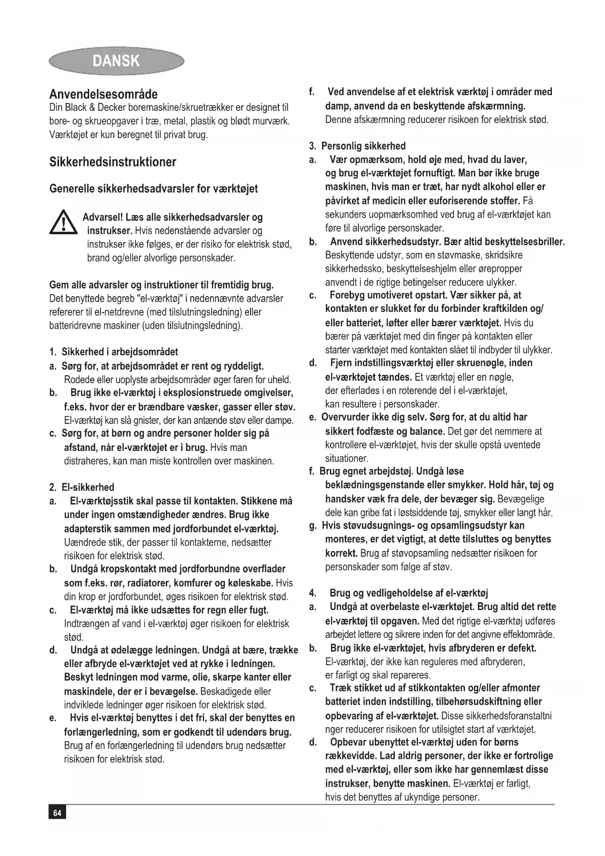 Kevin Hewitt Director of Consumer Engineering Spennymoor, County Durham DL16 6JG, Storbritannien 02-6-2009 Reservedele / reparationer Reservedele kan købes hos autoriserede Black & Decker serviceværksteder, som giver forslag til omkostninger og reparerer vore produkter. Oversigt over vore autoriserede værksteder ndes på internettet på vor hjemmeside www.blackanddecker.dk samt www.2helpU.com Garanti Black & Decker garanterer, at produktet er fri for materielle skader og/eller fabrikationsfejl ved levering til kunden. Garantien er et tillæg til konsumentens lovlige rettigheder og påvirker ikke disse. Garantien gælder indenfor medlemsstaterne af den Europæiske Union og i det Europæiske Frihandelsområde. Hvis et Black & Decker produkt går i stykker på grund af materiel skade og/eller fabrikationsfejl eller på anden måde ikke fungerer i overensstemmelse med specikationen, inden for 24 måneder fra købsdatoen, påtager Black & Decker sig at reparere eller ombytte produktet med mindst muligt besvær for kunden. Garantien gælder ikke for fejl og mangler, der er sket i forbindelse med: u normal slitageu uheldige følger efter unormal anvendelse af værktøjetu overbelastning, hærværk eller overdrevent intensivt brug af værktøjet u ulykkeshændelse Garantien gælder ikke hvis reparationer er udført af nogen anden end et autoriseret Black & Decker værksted. For at udnytte garantien skal produktet og købskvitteringen indleveres til forhandleren eller til et autoriseret værksted, senest 2 måneder efter at fejlen opdages. For information om nærmeste autoriserede værksted: kontakt det lokale Black & Decker kontor på den adresse som er opgivet i brugsanvisningen. Liste over alle autoriserede Black & Decker serviceværksteder samt servicevilkår er tilgængelig på internettet, på adressen www.2helpU.com Gå venligst ind på vores website www.blackanddecker.dk for at registrere dit nye produkt og for at blive holdt ajour om nye produkter og specialtilbud. Der ndes yderligere oplysninger om mærket Black & Decker og vores produktsortiment på adressen www.blackanddecker.dk70 SUOMI Käyttötarkoitus Black & Deckerin porakone/ruuvinväännin on suunniteltu ruuvaamiseen sekä puun, metallin, muovien ja betonin poraamiseen. Kone on tarkoitettu kotikäyttöön. Turvaohjeet Yleiset sähkötyökalujen turvallisuusohjeet
