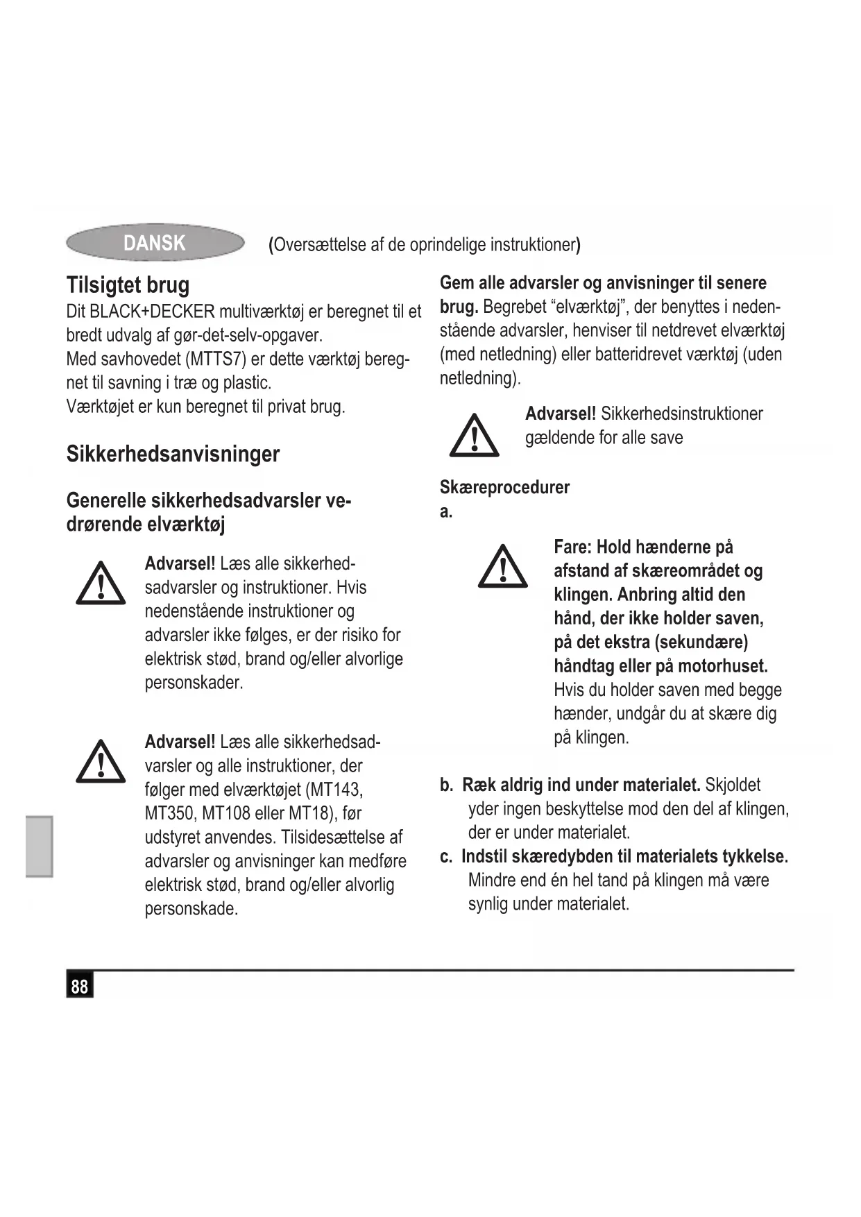 MTTS7 Black & Decker erklærer at disse produktene som er beskrevet under “Tekniske data”, er i samsvar med: 2006/42/EF, EN60745-1, EN60745-2-5 Disse produktene er også i samsvar med direktiv 2014/30/EU og 2011/65/EU. Hvis du ønsker mer informasjon, kontakt Black & Decker på følgende adresse, eller se på baksiden av håndboken. Undertegnede er ansvarlig for utarbeidelsen av den tekniske dokumentasjonen og gir denne erklæringen på vegne av Black & Decker. R. Laverick Engineering Manager Black & Decker Europe, 210 Bath Road, Slough, Berkshire, SL1 3YD Storbritannia 17/09/201488 (Oversættelse af de oprindelige instruktioner) DANSK Tilsigtet brug Dit BLACK+DECKER multiværktøj er beregnet til et bredt udvalg af gør-det-selv-opgaver. Med savhovedet (MTTS7) er dette værktøj bereg- net til savning i træ og plastic. Værktøjet er kun beregnet til privat brug. Sikkerhedsanvisninger Generelle sikkerhedsadvarsler ve- drørende elværktøj