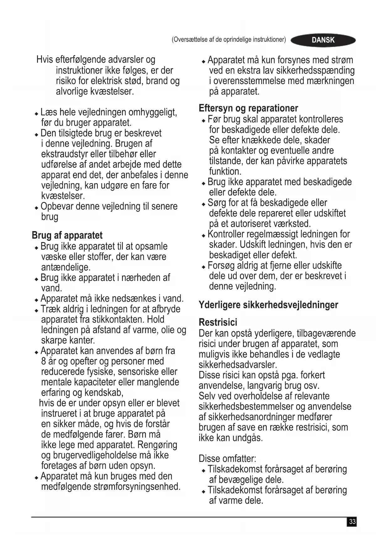 Advarsel! Læs alle sikkerhedsadvarsler og alle instruktioner.33 (Oversættelse af de oprindelige instruktioner) DANSK Hvis efterfølgende advarsler og instruktioner ikke følges, er der risiko for elektrisk stød, brand og alvorlige kvæstelser. u Læs hele vejledningen omhyggeligt, før du bruger apparatet. u Den tilsigtede brug er beskrevet i denne vejledning. Brugen af ekstraudstyr eller tilbehør eller udførelse af andet arbejde med dette apparat end det, der anbefales i denne vejledning, kan udgøre en fare for kvæstelser. u Opbevar denne vejledning til senere brug Brug af apparatet u Brug ikke apparatet til at opsamle væske eller stoffer, der kan være antændelige. u Brug ikke apparatet i nærheden af vand. u Apparatet må ikke nedsænkes i vand. u Træk aldrig i ledningen for at afbryde apparatet fra stikkontakten. Hold ledningen på afstand af varme, olie og skarpe kanter. u Apparatet kan anvendes af børn fra 8 år og opefter og personer med reducerede fysiske, sensoriske eller mentale kapaciteter eller manglende erfaring og kendskab, hvis de er under opsyn eller er blevet instrueret i at bruge apparatet på en sikker måde, og hvis de forstår de medfølgende farer. Børn må ikke lege med apparatet. Rengøring og brugervedligeholdelse må ikke foretages af børn uden opsyn. u Apparatet må kun bruges med den medfølgende strømforsyningsenhed. u Apparatet må kun forsynes med strøm ved en ekstra lav sikkerhedsspænding i overensstemmelse med mærkningen på apparatet. Eftersyn og reparationer u Før brug skal apparatet kontrolleres for beskadigede eller defekte dele. Se efter knækkede dele, skader på kontakter og eventuelle andre tilstande, der kan påvirke apparatets funktion. u Brug ikke apparatet med beskadigede eller defekte dele. u Sørg for at få beskadigede eller defekte dele repareret eller udskiftet på et autoriseret værksted. u Kontroller regelmæssigt ledningen for skader. Udskift ledningen, hvis den er beskadiget eller defekt. u Forsøg aldrig at fjerne eller udskifte dele ud over dem, der er beskrevet i denne vejledning. Yderligere sikkerhedsvejledninger Restrisici Der kan opstå yderligere, tilbageværende risici under brugen af apparatet, som muligvis ikke behandles i de vedlagte sikkerhedsadvarsler. Disse risici kan opstå pga. forkert anvendelse, langvarig brug osv. Selv ved overholdelse af relevante sikkerhedsbestemmelser og anvendelse af sikkerhedsanordninger medfører brugen af save en række restrisici, som ikke kan undgås. Disse omfatter: u Tilskadekomst forårsaget af berøring af bevægelige dele. u Tilskadekomst forårsaget af berøring af varme dele.34 (Oversættelse af de oprindelige instruktioner) DANSK u Tilskadekomst forårsaget af udskiftning af dele eller tilbehør. u Tilskadekomst forårsaget af langvarig brug af apparatet. Husk at holde pause jævnligt ved brug af et apparat i længere tid. Elektricitet og sikkerhed Apparatet er konstrueret til brug sammen med 12V bilbatterisystemer med negativ jordforbindelse. Advarsel! Cigarettænderens stik er udstyret med en sikring, som ikke kan repareres. Sikringen kan fungere i tilfælde af fejl. I det tilfælde skal sikring, stik og kabel udskiftes af producenten eller et autoriseret Black & Decker- værksted, så farlige situationer undgås. Advarsel! Anvend ikke apparatet sammen med systemer med positiv jordforbindelse eller en anden spænding. Funktioner Dette apparat leveres med nogle af eller alle de følgende komponenter.