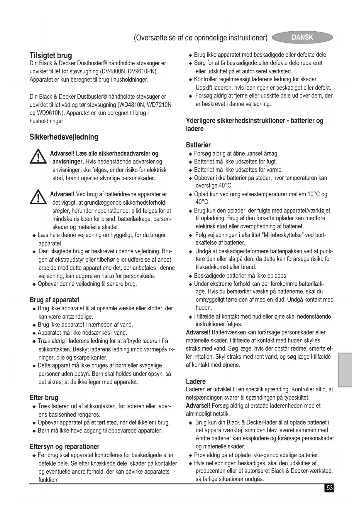 Vægt kg 0.17 0.17 0.22 Garanti Black & Decker garanterer, at produktet er fri for skader og fejl og tilbyder en fremragende garanti. Garantien er et tillæg til forbrugerens lovsikrede rettigheder og påvirker ikke disse. Ga- rantien gælder inden for medlemsstaterne af den Europæiske Union og i det Europæiske Frihandelsområde. Hvis et Black & Decker-produkt går i stykker på grund af materiel skade og/eller fabrikationsfejl eller på anden måde ikke fungerer i overensstemmelse med specikationen inden for 24 måneder fra købsdatoen, påtager Black & Decker sig at reparere eller ombytte produktet med mindst mulig ulempe for kunden. Garantien gælder ikke for fejl og mangler, der er sket i forbindelse med: u Produktet har været anvendt erhvervsmæssigt eller til udlejning. u Produktet har været anvendt forkert eller er ikke vedlige- holdt. u Produktet er beskadiget af fremmedlegemer, substanser eller pga. uheld. u Garantien gælder ikke, hvis reparationer er udført af andre end et autoriseret Black & Decker-værksted. For at udnytte garantien skal produktet og købskvitteringen indleveres til forhandleren eller til et autoriseret værksted. Kontakt det lokale Black & Decker-kontor på den adresse, der er angivet i denne vejledning, for at få oplysninger om nærmeste autoriserede værksted. En liste over alle autoris- erede Black & Decker-serviceværksteder samt servicevilkår og kontaktpersoner er tilgængelig på internettet på adressen: www.2helpU.com Gå venligst ind på vores website www.blackanddecker.dk for at registrere dit nye produkt og for at blive holdt ajour om nye produkter og specialtilbud. Der ndes yderligere oplysninger om mærket Black & Decker og vores produktsortiment på adressen www.blackanddecker.dk58 (Alkuperäisten ohjeiden käännös) SUOMI Käyttötarkoitus Black & Decker Dustbuster® -rikkaimuri on tarkoitettu kevyeen kuivaimurointiin (DV4800N, DV9610PN). Laite on tarkoitettu ainoastaan kotitalouskäyttöön. Black & Decker Dustbuster® -rikkaimuri on tarkoitettu kevyeen märkä- ja kuivaimurointiin (WD4810N, WD7210N ja WD9610N). Laite on tarkoitettu ainoastaan kotitalouskäyttöön. Turvallisuusohjeet