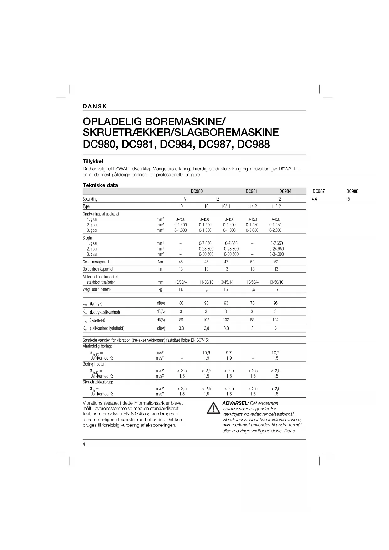 DC980, DC981, DC984, DC987, DC988 Tillykke! Du har valgt et DEWALT elværktøj. Mange års erfaring, ihærdig produktudvikling og innovation gør DEWALT til en af de mest pålidelige partnere for professionelle brugere. Tekniske data DC980 DC981 DC984 DC987 DC988 Spænding V 12 12 14,4 18 18 Type 10 10 10/11 11/12 11/12 Omdrejningstal ubelastet