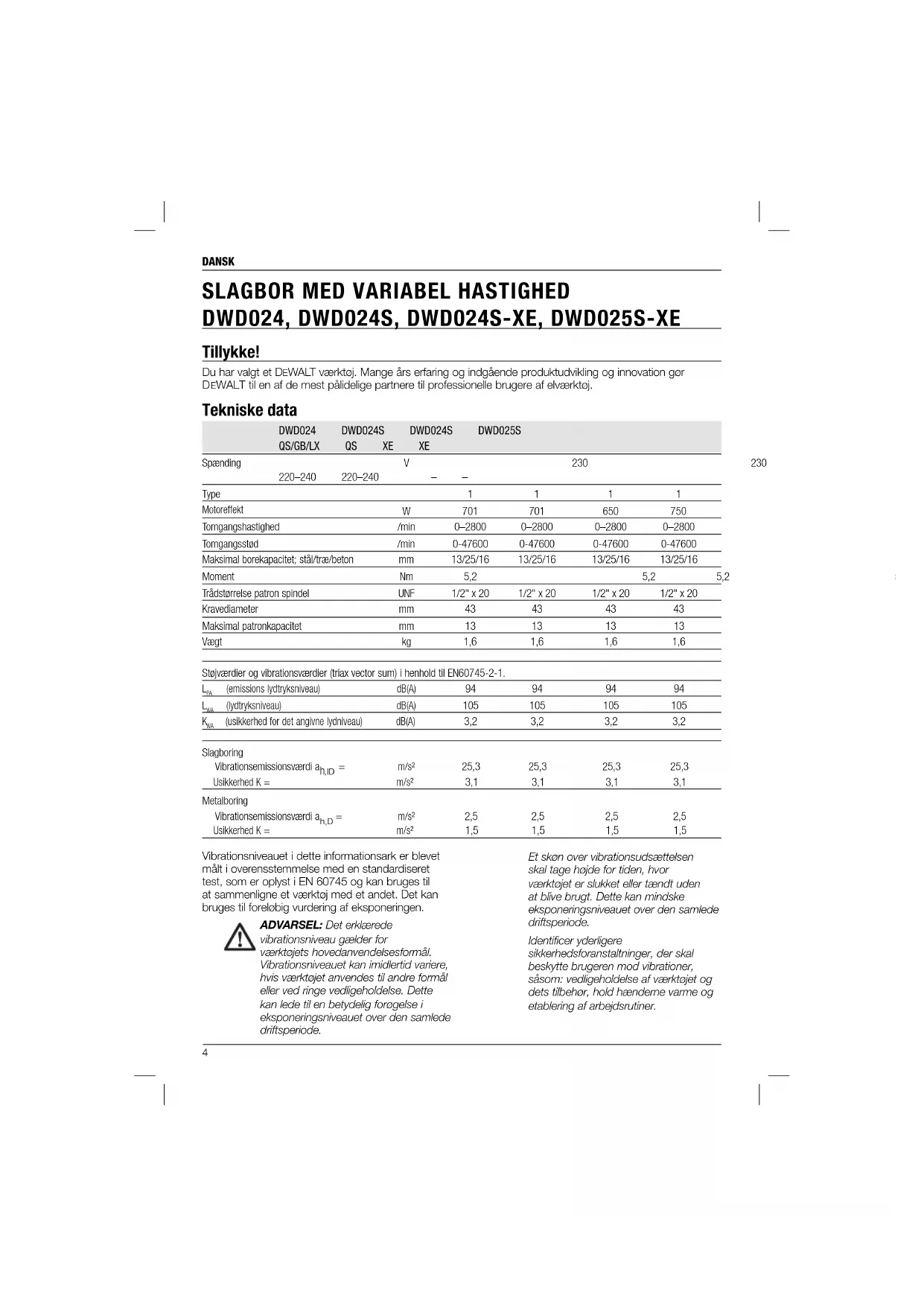 kontrollere borets rotation. ADVARSEL: Boret kan gå i stå, hvis det er overbelastet og resultere i en forvridning. Forvent altid standsningen. Hold godt fast for at kontrollere vridningen og undgå personskade.11 DANSK Nærmere oplysninger om det rigtige tilbehør fås hos forhandleren. Miljøbeskyttelse Særskilt bortskaffelse. Dette produkt må ikke bortskaffes sammen med almindeligt husholdningsaffald. Hvis du på noget tidspunkt finder det nødvendigt at udskifte dit DEWALT produkt, eller hvis det ikke længere tjener det tiltænkte formål, må det ikke bortskaffes med almindeligt husholdningsaffald. Sørg for, at dette produkt bortskaffes særskilt. Særskilt bortskaffelse af brugte produkter og emballage gør det muligt at genbruge materialer og anvende dem på ny. Genanvendelse af genbrugsmaterialer bidrager til at forhindre forurening af miljøet og reducerer behovet for råmaterialer. Lokale forskrifter muliggør i nogen tilfælde særskilt bortskaffelse af elektriske produkter fra husholdningen, ved kommunale affaldsdepoter eller hos forhandleren i forbindelse med køb af et nyt produkt. DEWALT har stillet faciliteter til rådighed til indsamling og genbrug af udslidte DEWALT produkter. For at benytte sig af denne service kan man returnere produktet til et hvilket som autoriseret serviceværksted, der modtager det på vore vegne. Du kan finde ud af, hvor det nærmeste autoriserede serviceværksted befinder sig ved at kontakte dit lokale DEWALT-kontor på den adresse, der er angivet i denne vejledning. Alternativt findes der en liste over autoriserede DEWALT serviceværksteder og detaljerede oplysninger om vores eftersalgsservice og kontakter på følgende internetadresse: www.2helpU.com. skal afbrydes, før montering og afmontering af tilbehør, før justering eller ændring af konfiguration eller ved udførelse af reparationer. Sørg for, at udløserkontakten er i OFF-position. Utilsigtet start kan medføre kvæstelser. Motorbørster DEWALT anvender et avanceret børstesystem, der automatisk standser boret, når børsterne er opbrugt. Dette forhindrer alvorlig skade på motoren. Nye børstesamlinger er tilgængelige hos autoriserede DEWALT-servicecentre. Anvend altid identiske reservedele. Smøring Dette elektriske værktøj skal ikke smøres yderligere. Rengøring ADVARSEL: Blæs støv og snavs ud af hovedhuset med tør luft, lige så snart der samler sig snavs i og omkring luftaftrækket. Bær godkendte beskyttelsesbriller og godkendt støvmaske ved udførelse af denne procedure. ADVARSEL: Brug aldrig opløsningsmidler eller andre kraftige kemikalier til at rengøre værktøjets ikke-metalliske dele. Disse kemikalier kan svække de materialer, der anvendes i disse dele. Brug en klud, der kun er fugtet med vand og mild sæbe. Der må under ingen omstændigheder komme væske ind i værktøjet. Ingen af værktøjets dele må nedsænkes i væske. Valgfrit tilbehør ADVARSEL: Da andet tilbehør end det, som stilles til rådighed af DEWALT, ikke er afprøvet med dette produkt, kan det være farligt at bruge sådant tilbehør med dette værktøj. For at mindske risikoen for personskade, må dette produkt kun anvendes med tilbehør, som anbefales af D EWALT. FORSIGTIG: For at reducere risikoen for skade bør tilbehør kun anvendes i størrelser op til det maksimale som vist i de tekniske specifikationer.12 DEUTSCH Sie haben sich für ein Werkzeug von DEWALT entschieden. Langjährige Erfahrung, sorgfältige Produktentwicklung und Innovation machen DEWALT zu einem zuverlässigen Partner für professionelle Anwender von Elektrowerkzeugen. Technische Daten DWD024 DWD024S DWD024S DWD025S QS/GB/LX QS XE XE Spannung V 230/ 230/ 230 230 220–240 220–240 – – Typ 1 1 1 1 Leistungsaufnahme W 701 701 650 750 Leerlaufdrehzahl /min 0–2800 0–2800 0–2800 0–2800 Leerlaufschlagzahl /min 0-47600 0-47600 0-47600 0-47600 Maximale Bohrleistung: Stahl/Holz/Beton mm 13/25/16 13/25/16 13/25/16 13/25/16 Drehmoment Nm 5,2 5,2 5,2 5,2 Spannfutter-Spindelgewinde UNF 1/2" x 20 1/2" x 20 1/2" x 20 1/2" x 20 Spannhalsdurchmesser mm 43 43 43 43 Max. Bohrfutter-spannweite mm 13 13 13 13 Gewicht kg 1,6 1,6 1,6 1,6 Lärmwerte und Vibrationswerte (Triax-Vektorsumme) gemäß EN60745-2-1.