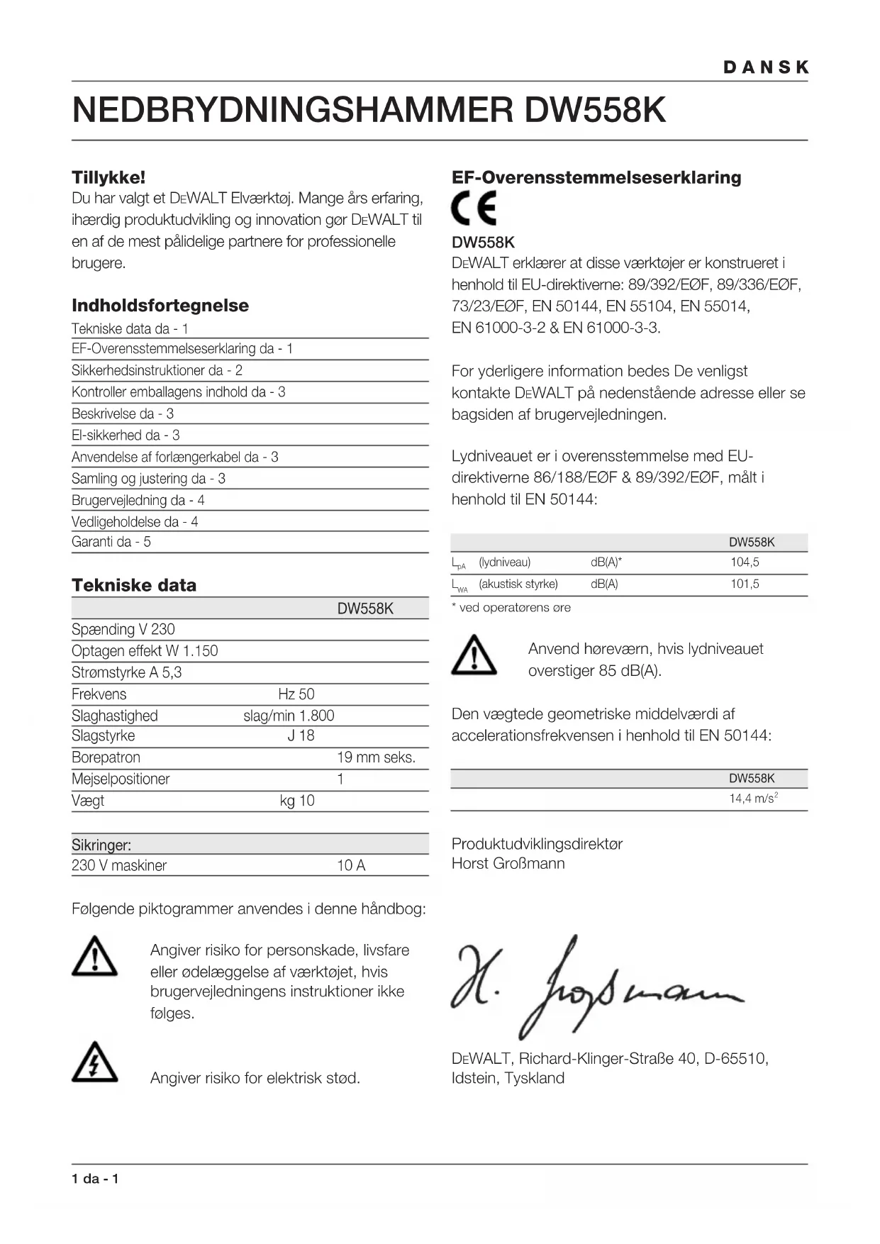 Produktudviklingsdirektør Horst Großmann DEWALT, Richard-Klinger-Straße 40, D-65510, Idstein, Tyskland2da - 2 DANSK Sikkerhedsinstruktioner Læs brugsanvisningen igennem, inden maskinen tages i brug. Opbevar brugsanvisningen let tilgængeligt, så alle, der bruger maskinen, har adgang til brugsanvisningen. Foruden nedenstående instruktioner, bør Arbejdstilsynets regler altid følges. ADVARSEL! Når man anvender elværktøj, skal følgende grundlæggende sikkerhedsinstruktioner altid følges for at nedsætte risikoen for elektriske stød, personskader og brand. 1 Brug høreværn Lydniveauet ved bearbejdning af forskellige materialer kan variere, af og til overstiger niveauet 85 dB(A). For at beskytte sig selv, skal man altid anvende høreværn. 2 Hold arbejdsområdet i orden Uordentlige arbejdsområder og arbejdsbænke indbyder til skader. 3 Tænk på arbejdsmiljøets indflydelse Udsæt ikke elværktøj for regn. Anvend ikke elværktøj på fugtige eller våde pladser. Sørg for en god belysning over arbejdsområdet. Anvend ikke elværktøj i nærheden af let antændelige væsker eller gasser. 4 Beskyt dig mod elektriske stød Undgå kropskontakt med dele, der har jordforbindelse (f.eks. rør, radiatorer, komfurer, køleskabe). Ved ekstreme arbejdsforhold (f.eks. høj fugtighed, forekomst af metalstøv osv.) kan den elektriske sikkerhed øges ved at tilkoble en fejlstrømsafbryder. 5 Hold børnene på afstand Lad ikke børn komme i berøring med værktøjet eller forlængerledningen. Det er påkrævet at holde børn under 16 år under opsyn. 6 Opbevar værktøj sikkert Når elværktøjet ikke anvendes, skal det opbevares på et tørt, højt placeret sted, låst inde, uden for børns rækkevidde. 7 Overbelast ikke elværktøj Man arbejder bedre og mere sikkert inden for det anførte effektområde. 8 Brug det rigtige elværktøj Tving ikke elværktøj til at udføre arbejde, som er beregnet til kraftigere værktøj. Brug ikke værktøj til formål, det ikke er beregnet til, brug f.eks. ikke en håndrundsav til at save kviste eller brænde. 9 Klæd dig rigtigt på Bær ikke løst hængende tøj eller smykker. De kan sidde fast i bevægelige dele. Gummihandsker og skridsikre sko anbefales ved udendørs arbejde. Brug hårnet, hvis du har langt hår. 10 Brug beskyttelsesbriller Brug beskyttelsesbriller for at forhindre, at du får støv i øjnene, hvilket kan forårsage skade. Hvis der opstår meget støv, bruges også støvmaske. 11 Ledningen må ikke mishandles Bær aldrig værktøjet i ledningen og træk ikke i ledningen for at tage kontakten ud af stikket. Udsæt ikke ledningen for varme, olie eller skarpe kanter. 12 Sæt arbejdsemnet fast Brug skruetvinger eller skruestik for at spænde arbejdsemnet fast. Det er sikrere end at bruge hånden, og du får begge hænder fri til arbejdet. 13 Stræk dig ikke for meget Sørg for, at du altid har sikkert fodfæste og balance. 14 Vedligehold værktøjet omhyggeligt Hold værktøjet skarpt og rent. Følg instruktionerne med hensyn til pasning og udskiftning af tilbehør. Kontroller elværktøjets ledning regelmæssigt og få den repareret hos et autoriseret serviceværksted, hvis den er beskadiget. Kontroller forlængerledninger regelmæssigt og udskift dem, hvis de er beskadigede. Hold håndtagene tørre, rene og fri for olie og fedt. 15 Tag kontakten ud af stikket når elværktøjet ikke er i brug, inden service og ved udskiftning af tilbehør 16 Fjern nøglerne Kontroller at nøgler og justerværktøj er fjernet fra elværktøjet, inden det startes. 17 Undgå utilsigtet start Bær ikke tændt elværktøj med fingeren på afbryderen. Sørg for, at afbryderen er slået fra, når du sætter kontakten i stikket. 18 Forlængerledninger udendørs Udendørs må der kun anvendes forlængerledninger, der er godkendt til udendørs brug og mærkede til dette. 19 Vær opmærksom Se på det, du gør. Brug din sunde fornuft. Brug ikke elværktøjet, når du er træt.3 da - 3 DANSK 20 Kontroller elværktøjet for skader, inden du tilslutter ledningen til vægstikket Inden fortsat brug af elværktøjet, skal eventuelle beskadigede sikringsanordninger og andre defekte dele kontrolleres nøje for at finde ud af, om de fortsat kan fungere rigtigt og udføre den planlagte funktion. Kontroller at de bevægelige dele fungerer upåklageligt og ikke klemmer, at ingen dele er gået i stykker, at alle dele er rigtigt monterede, og at andre forhold, der kan påvirke driften, er i orden. En sikkerhedsanordning eller en anden del, som er beskadiget, skal repareres eller udskiftes af et autoriseret serviceværksted, hvis intet andet er anført i brugsanvisningen. Fejlbehæftede afbrydere skal udskiftes hos et autoriseret serviceværksted. Brug ikke elværktøjet, hvis afbryderen ikke kan kobles til eller fra. 21 For din personlige sikkerhed Brug kun tilbehør og dele, der er anbefalet i brugsanvisningen og katalogerne. Anvendelsen af andet værktøj eller tilbehør end det, der anbefales i brugsanvisningen eller katalogerne kan medføre risiko for personskader. 22 Få dit værktøj repareret hos et autoriseret DEWALT serviceværksted Dette elværktøj overholder de relevante sikkerhedsforskrifter. For at undgå fare, må reparationer af eludstyr kun foretages af autoriserede elektrikere. Kontroller emballagens indhold Emballagen indeholder: 1 Nedbrydningshammer 1 Sidehåndtag 1 Umbrachonøgle 1 Spids mejsel 1 Støvafskærmning 1 Kasse 1 Brugervejledning 1 Tegning