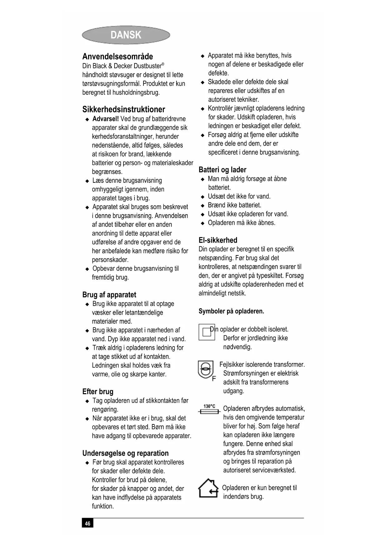 håndholdt støvsuger er designet til lette tørstøvsugningsformål. Produktet er kun beregnet til husholdningsbrug. Sikkerhedsinstruktioner Advarsel! Ved brug af batteridrevne apparater skal de grundlæggende sik kerhedsforanstaltninger, herunder nedenstående, altid følges, således at risikoen for brand, lækkende batterier og person- og materialeskader begrænses. Læs denne brugsanvisning omhyggeligt igennem, inden apparatet tages i brug. Apparatet skal bruges som beskrevet i denne brugsanvisning. Anvendelsen af andet tilbehør eller en anden anordning til dette apparat eller udførelse af andre opgaver end de her anbefalede kan medføre risiko for personskader. Opbevar denne brugsanvisning til fremtidig brug. Brug af apparatet Brug ikke apparatet til at optage væsker eller letantændelige materialer med. Brug ikke apparatet i nærheden af vand. Dyp ikke apparatet ned i vand. Træk aldrig i opladerens ledning for at tage stikket ud af kontakten. Ledningen skal holdes væk fra varme, olie og skarpe kanter. Efter brug Tag opladeren ud af stikkontakten før rengøring. Når apparatet ikke er i brug, skal det opbevares et tørt sted. Børn må ikke have adgang til opbevarede apparater. Undersøgelse og reparation Før brug skal apparatet kontrolleres for skader eller defekte dele. Kontroller for brud på delene, for skader på knapper og andet, der kan have indflydelse på apparatets funktion. Apparatet må ikke benyttes, hvis nogen af delene er beskadigede eller defekte. Skadede eller defekte dele skal repareres eller udskiftes af en autoriseret tekniker. Kontrollér jævnligt opladerens ledning for skader. Udskift opladeren, hvis ledningen er beskadiget eller defekt. Forsøg aldrig at fjerne eller udskifte andre dele end dem, der er specificeret i denne brugsanvisning. Batteri og lader Man må aldrig forsøge at åbne batteriet. Udsæt det ikke for vand. Brænd ikke batteriet. Udsæt ikke opladeren for vand. Opladeren må ikke åbnes. El-sikkerhed Din oplader er beregnet til en specifik netspænding. Før brug skal det kontrolleres, at netspændingen svarer til den, der er angivet på typeskiltet. Forsøg aldrig at udskifte opladerenheden med et almindeligt netstik. Symboler på opladeren.