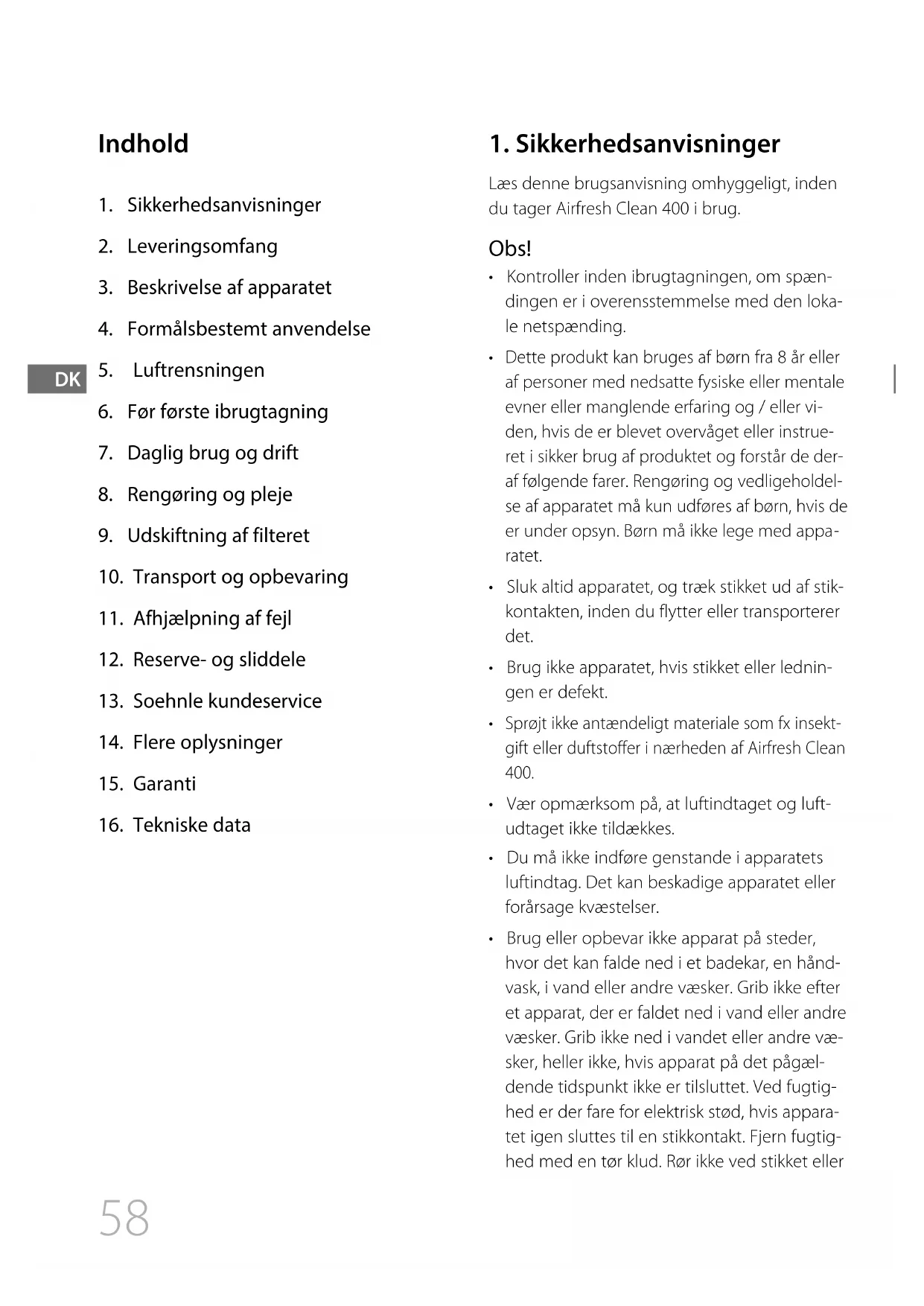 Læs denne brugsanvisning omhyggeligt, inden du tager Airfresh Clean 400 i brug. Obs!