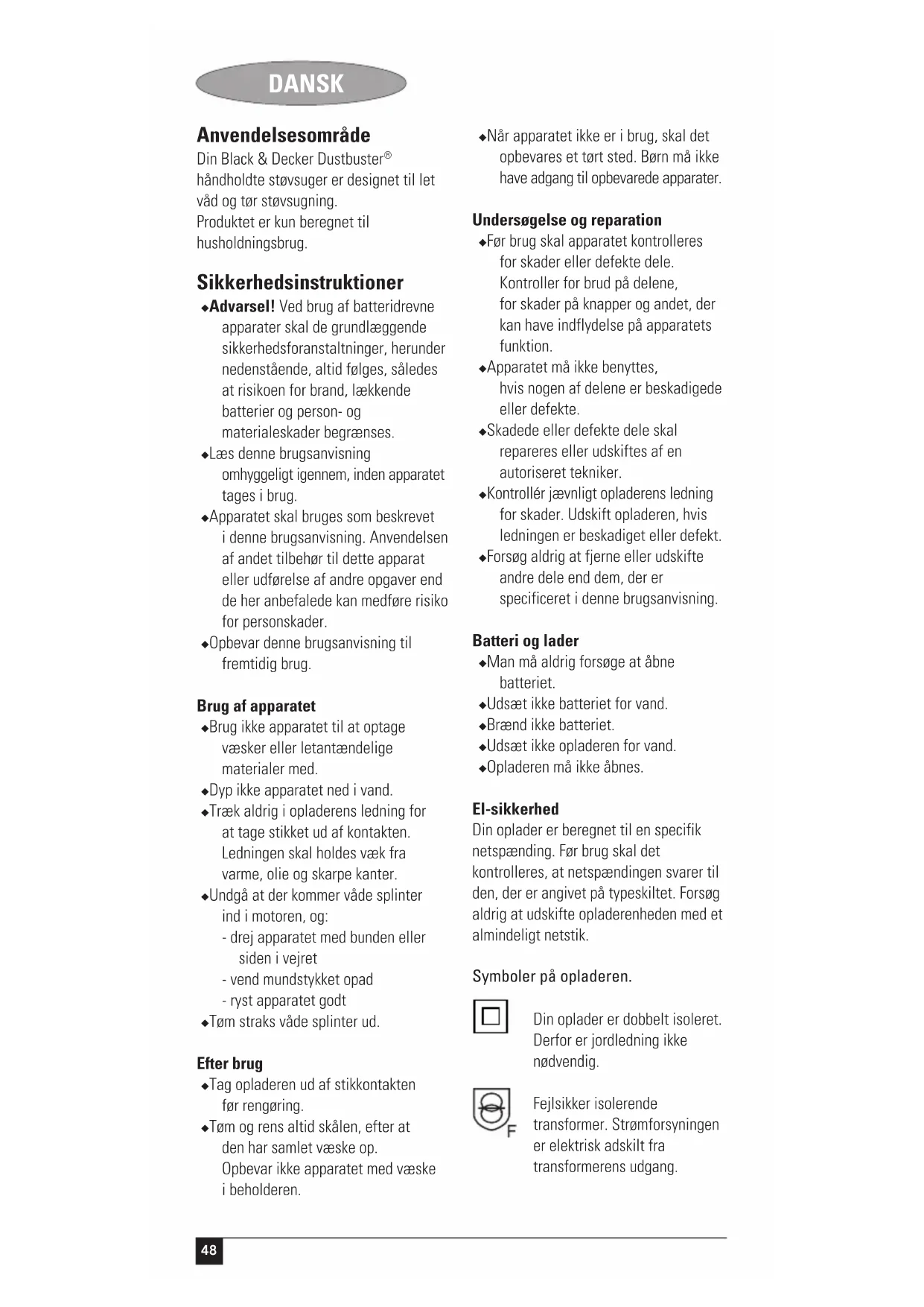 håndholdte støvsuger er designet til let våd og tør støvsugning. Produktet er kun beregnet til husholdningsbrug. Sikkerhedsinstruktioner ◆ Advarsel! Ved brug af batteridrevne apparater skal de grundlæggende sikkerhedsforanstaltninger, herunder nedenstående, altid følges, således at risikoen for brand, lækkende batterier og person- og materialeskader begrænses. ◆ Læs denne brugsanvisning omhyggeligt igennem, inden apparatet tages i brug. ◆ Apparatet skal bruges som beskrevet i denne brugsanvisning. Anvendelsen af andet tilbehør til dette apparat eller udførelse af andre opgaver end de her anbefalede kan medføre risiko for personskader. ◆ Opbevar denne brugsanvisning til fremtidig brug. Brug af apparatet ◆ Brug ikke apparatet til at optage væsker eller letantændelige materialer med. ◆ Dyp ikke apparatet ned i vand. ◆ Træk aldrig i opladerens ledning for at tage stikket ud af kontakten. Ledningen skal holdes væk fra varme, olie og skarpe kanter. ◆ Undgå at der kommer våde splinter ind i motoren, og: - drej apparatet med bunden eller siden i vejret - vend mundstykket opad - ryst apparatet godt ◆ Tøm straks våde splinter ud. Efter brug ◆ Tag opladeren ud af stikkontakten før rengøring. ◆ Tøm og rens altid skålen, efter at den har samlet væske op. Opbevar ikke apparatet med væske i beholderen. ◆ Når apparatet ikke er i brug, skal det opbevares et tørt sted. Børn må ikke have adgang til opbevarede apparater. Undersøgelse og reparation ◆ Før brug skal apparatet kontrolleres for skader eller defekte dele. Kontroller for brud på delene, for skader på knapper og andet, der kan have indflydelse på apparatets funktion. ◆ Apparatet må ikke benyttes, hvis nogen af delene er beskadigede eller defekte. ◆ Skadede eller defekte dele skal repareres eller udskiftes af en autoriseret tekniker. ◆ Kontrollér jævnligt opladerens ledning for skader. Udskift opladeren, hvis ledningen er beskadiget eller defekt. ◆ Forsøg aldrig at fjerne eller udskifte andre dele end dem, der er specificeret i denne brugsanvisning. Batteri og lader ◆ Man må aldrig forsøge at åbne batteriet. ◆ Udsæt ikke batteriet for vand. ◆ Brænd ikke batteriet. ◆ Udsæt ikke opladeren for vand. ◆ Opladeren må ikke åbnes. El-sikkerhed Din oplader er beregnet til en specifik netspænding. Før brug skal det kontrolleres, at netspændingen svarer til den, der er angivet på typeskiltet. Forsøg aldrig at udskifte opladerenheden med et almindeligt netstik. Symboler på opladeren. Din oplader er dobbelt isoleret. Derfor er jordledning ikke nødvendig. Fejlsikker isolerende transformer. Strømforsyningen er elektrisk adskilt fra transformerens udgang.49 DANSK Opladeren afbrydes automatisk, hvis den omgivende temperatur bliver for høj. Så snart den omgivende temperatur er faldet, vil opladeren genoptage funktionen. Opladeren er kun beregnet til indendørs brug. Læs brugsanvisningen omhyggeligt igennem, inden apparatet tages i brug. Funktioner