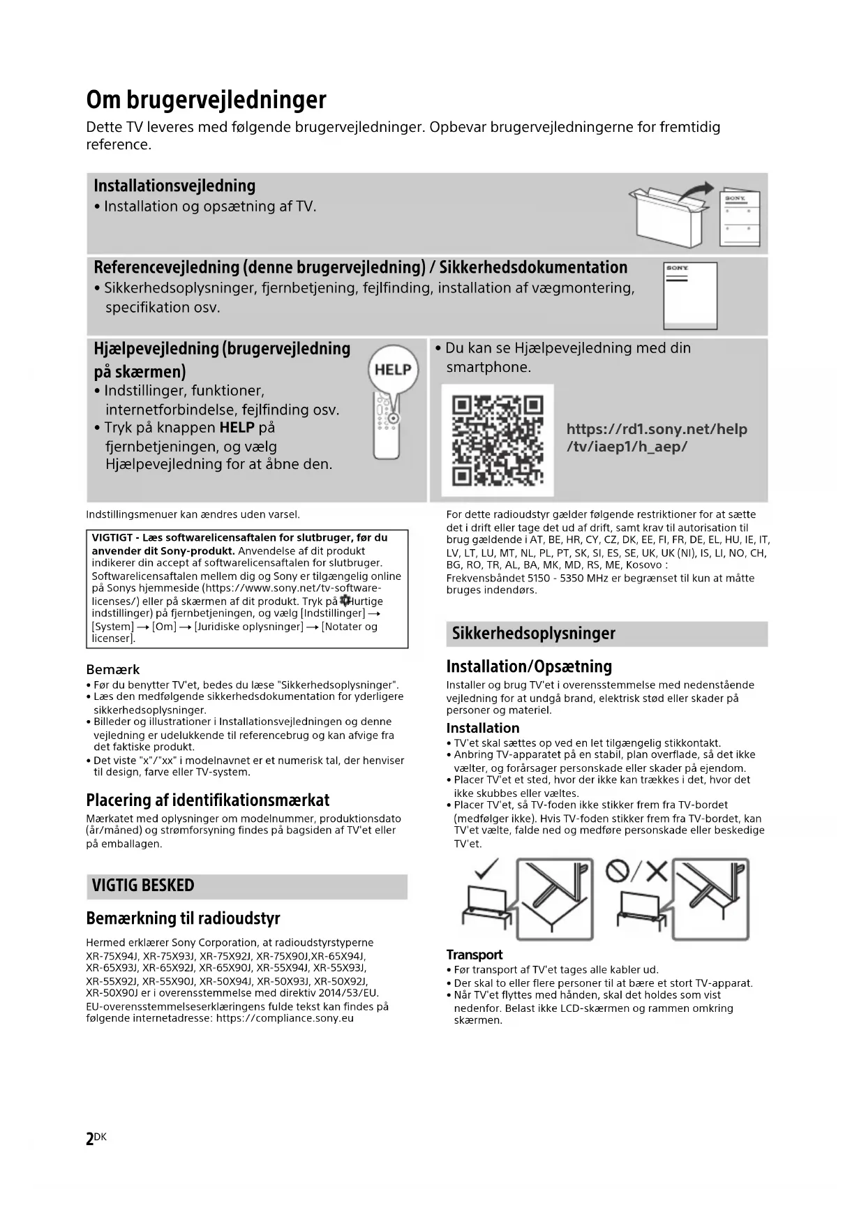 Hermed erkrlaerer Sony Corporation, at radioudstyrsterne XR-75X94J,XR-75X93J,XR-75X92JXR-75X90JXR-65X94J XR-65X93JXR-65X92JXR-50X94JXR-50X93J XR-50X92J XR-55X90JXR-50X94J XR-50X93J XR-50X92J XR-50X90J er i overensstammelse med direktiv 2014/53/EU. EU-overensstammelseserklaringens fulde tekst kan findes pa folgende internetadresse: https://compliance.sony.eu