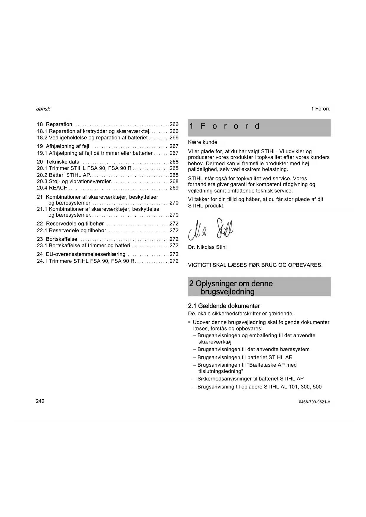 dansk 1 Forord Kære kunde Vi er glade for, at du har valgt STIHL. Vi udvikler og producerer vores produkter i topkvalitet efter vores kunders behov. Dermed kan vi fremstille produkter med høj pålidelighed, selv ved ekstrem belastning. STIHL står også for topkvalitet ved service. Vores forhandlere giver garanti for kompetent rådgivning og vejledning samt omfattende teknisk service. Vi takker for din tillid og håber, at du får stor glæde af dit STIHL-produkt. Dr. Nikolas Stihl VIGTIGT! SKAL LÆSES FØR BRUG OG OPBEVARES.