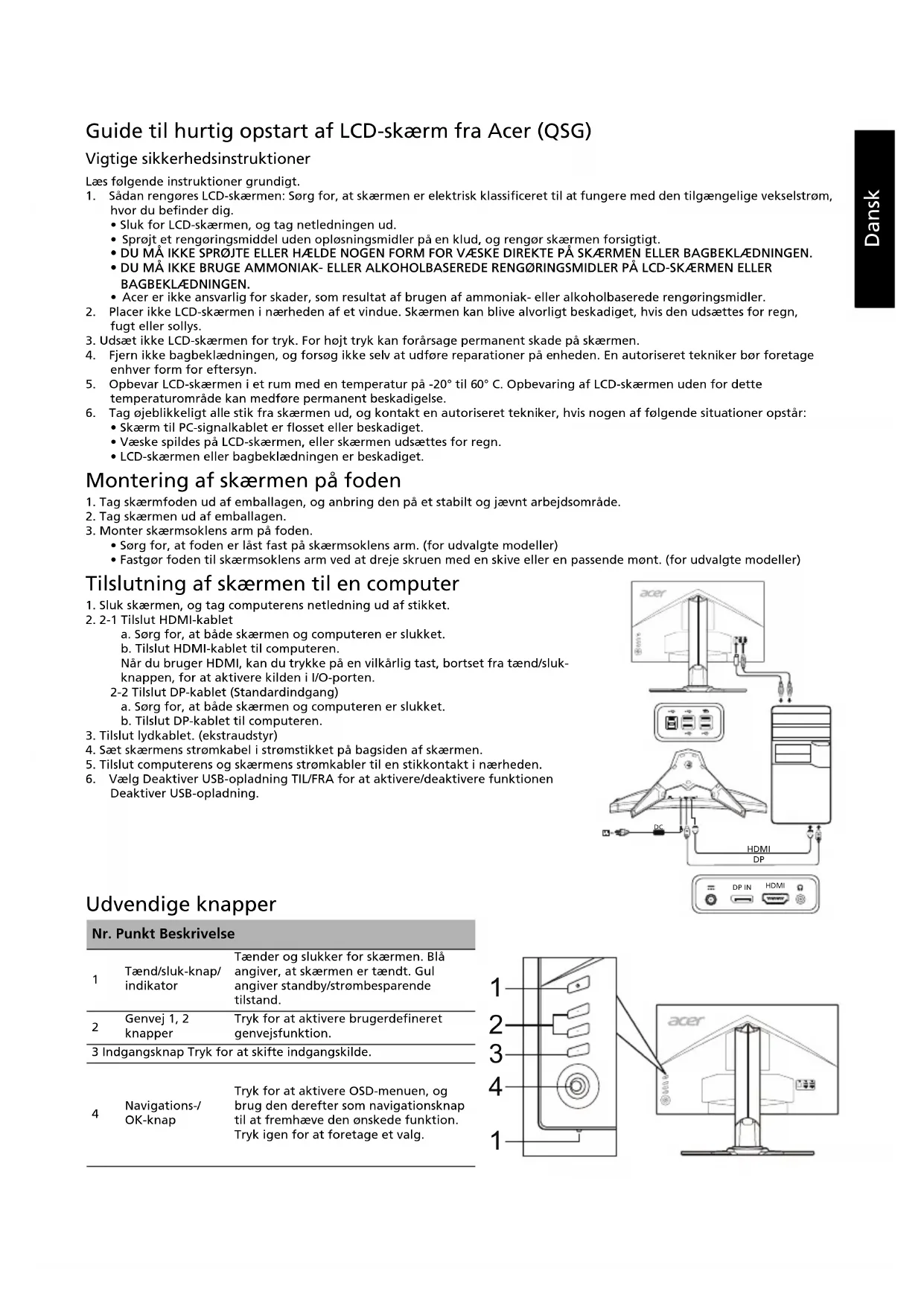 Tænd/sluk-knap/indikatorTænder og slukker for skærmen. Blå angiver, at skærmen er tændt. Gul angiver standby/strømbesparende tilstand. Genvej 1, 2 knapperTryk for at aktivere brugerdefineret genvejsfunktion.3 Indgangsknap Tryk for at skifte indgangskilde. Navigations-/OK-knapTryk for at aktivere OSD-menuen, og brug den derefter som navigationsknap til at fremhæve den ønskede funktion. Tryk igen for at foretage et valg.HDMI