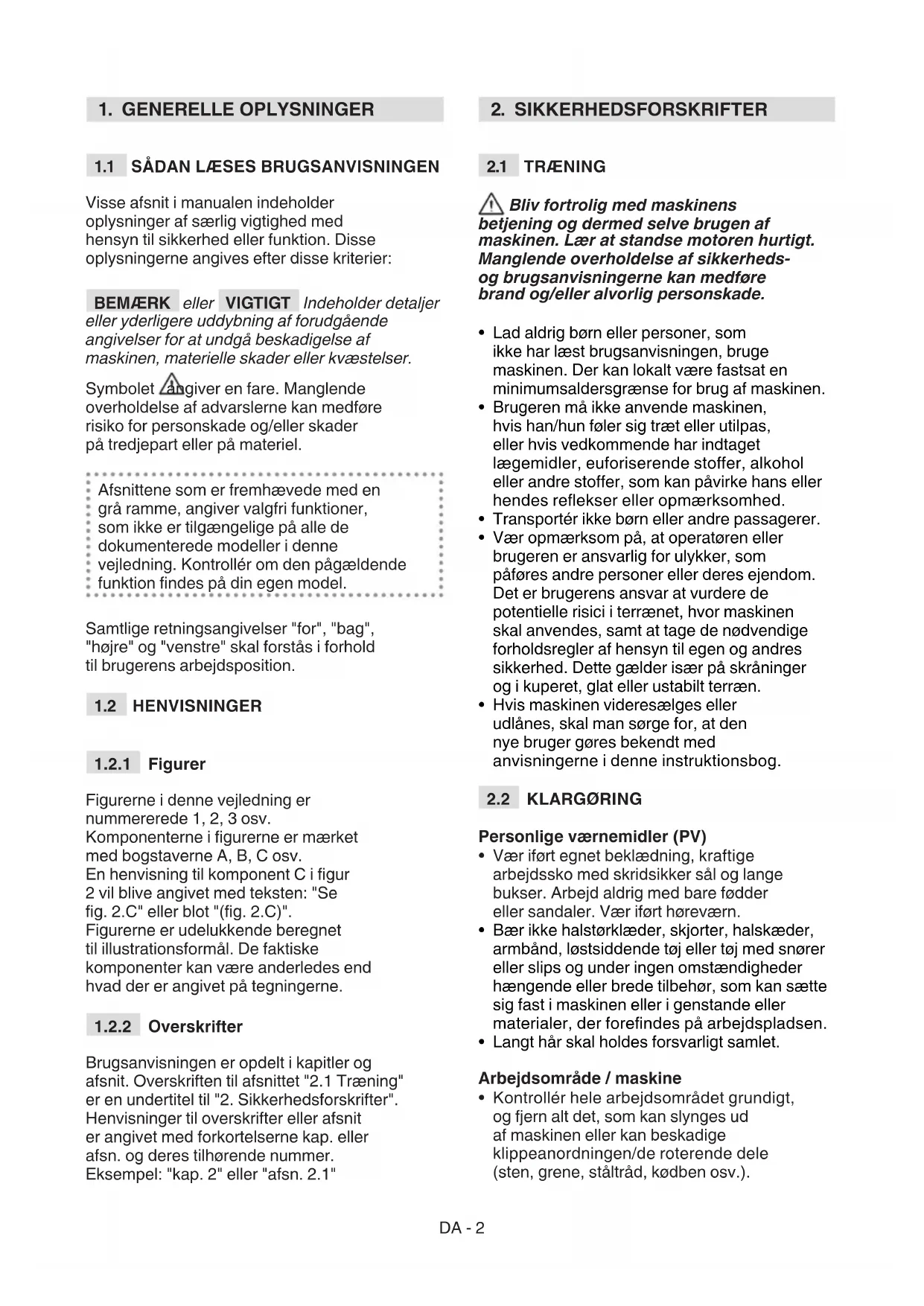 - Vær opmærksom på, at operatøren eller brugeren er ansvarlig for ulykker, som påføres andre personer eller deres ejendom. Det er brugerens ansvar at vurdere de potentielle risici i terrænet, hvor maskinen skal anvendes, samt at tage de nødvendige forholdsregler af hensyn til egen og andres sikkerhed. Dette gælder især på skråninger og i kuperet, glat eller ustabilt terræn.