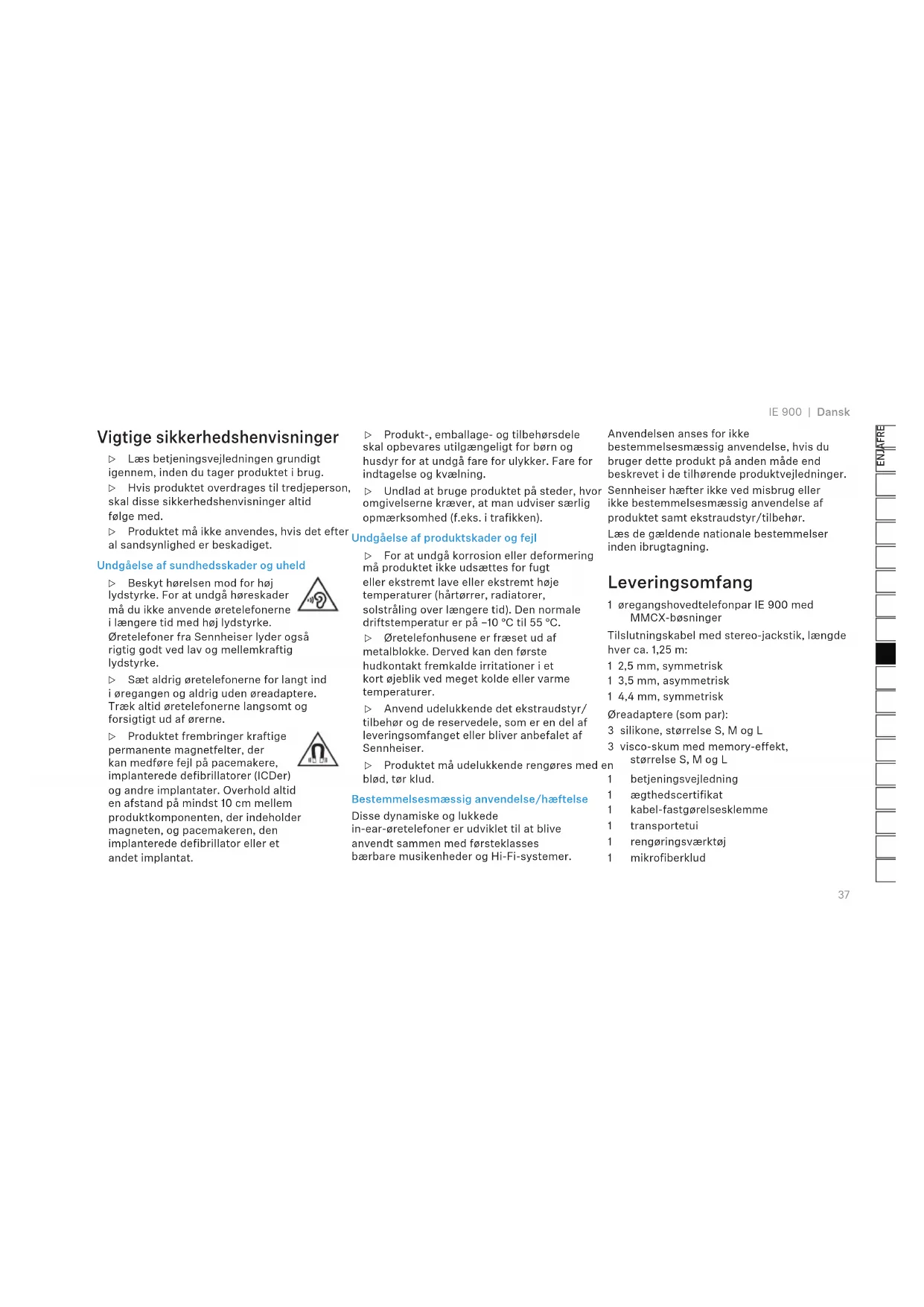 IE 900 | Dansk Vigtige sikkerhedshenvisninger ▷ Læs betjeningsvejledningen grundigt igennem, inden du tager produktet i brug. ▷ Hvis produktet overdrages til tredjeperson, skal disse sikkerhedshenvisninger altid følge med. ▷ Produktet må ikke anvendes, hvis det efter al sandsynlighed er beskadiget. Undgåelse af sundhedsskader og uheld ▷ Beskyt hørelsen mod for høj lydstyrke. For at undgå høreskader må du ikke anvende øretelefonerne i længere tid med høj lydstyrke. Øretelefoner fra Sennheiser lyder også rigtig godt ved lav og mellemkraftig lydstyrke. ▷ Sæt aldrig øretelefonerne for langt ind i øregangen og aldrig uden øreadaptere. Træk altid øretelefonerne langsomt og forsigtigt ud af ørerne. ▷ Produktet frembringer kraftige permanente magnetfelter, der kan medføre fejl på pacemakere, implanterede defibrillatorer (ICDer) og andre implantater. Overhold altid en afstand på mindst 10 cm mellem produktkomponenten, der indeholder magneten, og pacemakeren, den implanterede defibrillator eller et andet implantat. ▷ Produkt-, emballage- og tilbehørsdele skal opbevares utilgængeligt for børn og husdyr for at undgå fare for ulykker. Fare for indtagelse og kvælning. ▷ Undlad at bruge produktet på steder, hvor omgivelserne kræver, at man udviser særlig opmærksomhed (f.eks. i trafikken). Undgåelse af produktskader og fejl ▷ For at undgå korrosion eller deformering må produktet ikke udsættes for fugt eller ekstremt lave eller ekstremt høje temperaturer (hårtørrer, radiatorer, solstråling over længere tid). Den normale driftstemperatur er på –10 °C til 55 °C. ▷ Øretelefonhusene er fræset ud af metalblokke. Derved kan den første hudkontakt fremkalde irritationer i et kort øjeblik ved meget kolde eller varme temperaturer. ▷ Anvend udelukkende det ekstraudstyr/ tilbehør og de reservedele, som er en del af leveringsomfanget eller bliver anbefalet af Sennheiser. ▷ Produktet må udelukkende rengøres med en blød, tør klud. Bestemmelsesmæssig anvendelse/hæftelse Disse dynamiske og lukkede in-ear-øretelefoner er udviklet til at blive anvendt sammen med førsteklasses bærbare musikenheder og Hi-Fi-systemer. Anvendelsen anses for ikke bestemmelsesmæssig anvendelse, hvis du bruger dette produkt på anden måde end beskrevet i de tilhørende produktvejledninger. Sennheiser hæfter ikke ved misbrug eller ikke bestemmelsesmæssig anvendelse af produktet samt ekstraudstyr/tilbehør. Læs de gældende nationale bestemmelser inden ibrugtagning. Leveringsomfang 1 øregangshovedtelefonpar IE 900 med MMCX-bøsninger Tilslutningskabel med stereo-jackstik, længde hver ca. 1,25 m: 1 2,5 mm, symmetrisk 1 3,5 mm, asymmetrisk 1 4,4 mm, symmetrisk Øreadaptere (som par): 3 silikone, størrelse S, M og L 3 visco-skum med memory-effekt, størrelse S, M og L 1 betjeningsvejledning 1 ægthedscertifikat 1 kabel-fastgørelsesklemme 1 transportetui 1 rengøringsværktøj 1 mikrofiberklud38 Dansk | IE 900 Din Sennheiser IE 900 Til musiknydere med de højeste kvalitetskrav er søgningen efter den ideelle lyd en uophørlig stræben efter perfektion. IE 900 er inspireret af denne lidenskab og er det nye flagskib i Sennheisers in-ear-serie og sætter nye standarder inden for loyal lydgengivelse. Fra det ekskvisitte hus over en forbedret version den berømmede 7 mm-XWB- omformer til deres lydkanals ledende egenskaber: Der blev taget højde for selv det mindste aspekt ved udviklingen for, at man kunne høre Sennheisers omfattende akustikviden i disse in-ears. Det nye akustiske design har en forbedret svingspole, som optimerer effekten i høje frekvenser af hensyn til en brillant, naturlig lyd. Naturlige resonanser og klirforvrængninger minimeres af en optimeret membranfolie. Summen af alle disse forbedringer er en ekstraordinær naturlig lydgengivelse for at belønne selv de mest krævende audio-entusiaster. IE 900 produceres af et ekspertteam på Sennheisers hovedfabrik i Tyskland under overholdelse af de mindste produktionstolerancer. Hver lydomformer testes fuldstændigt to gange – både enkeltvis før og sammen efter parringen af højre og venstre øretelefonside. Lydomformerne på den højre og venstre side vælges, så de er optimalt tilpasset til hinanden. Denne forkærlighed for detaljer viser også i det professionelt-audioinspirerede premiumdesign. Hvert hus fræses præcist ud af en enkelt blok af førsteklasses aluminium for at garantere maksimal lydkvalitet og samtidigt en ekstraordinær holdbarhed. IE 900 giver derudover fremragende konnektivitet med førsteklasses Fidelity