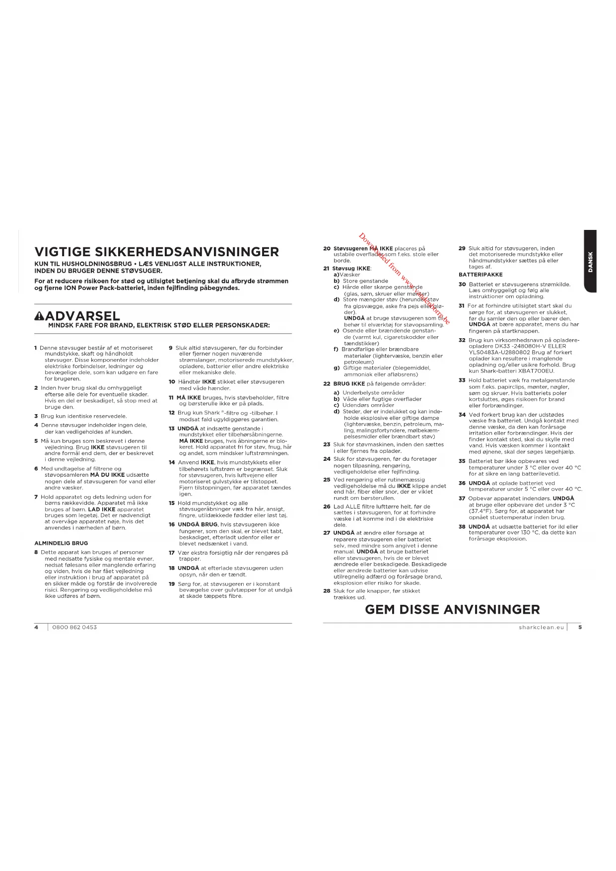 - Batterigaranti DANSK 2 3sharkclean.eu INDHOLDSFORTEGNELSE TAK for dit køb af Shark Anti Hair Wrap & DuoClean Cordless batteristøvsuger Downloaded from www.vandenborre.be1 Denne støvsuger består af et motoriseret mundstykke, skaft og håndholdt støvsuger. Disse komponenter indeholder elektriske forbindelser, ledninger og bevægelige dele, som kan udgøre en fare for brugeren. 2 Inden hver brug skal du omhyggeligt efterse alle dele for eventuelle skader. Hvis en del er beskadiget, så stop med at bruge den. 3 Brug kun identiske reservedele. 4 Denne støvsuger indeholder ingen dele, der kan vedligeholdes af kunden. 5 Må kun bruges som beskrevet i denne vejledning. Brug IKKE støvsugeren til andre formål end dem, der er beskrevet idenne vejledning. 6 Med undtagelse af filtrene og støvopsamleren MÅ DU IKKE udsætte nogen dele af støvsugeren for vand eller andre væsker. 7 Hold apparatet og dets ledning uden for børns rækkevidde. Apparatet må ikke bruges af børn. LAD IKKE apparatet bruges som legetøj. Det er nødvendigt at overvåge apparatet nøje, hvis det anvendes i nærheden af børn. ALMINDELIG BRUG 8 Dette apparat kan bruges af personer med nedsatte fysiske og mentale evner, nedsat følesans eller manglende erfaring og viden, hvis de har fået vejledning eller instruktion i brug af apparatet på en sikker måde og forstår de involverede risici. Rengøring og vedligeholdelse må ikke udføres af børn. p. 19