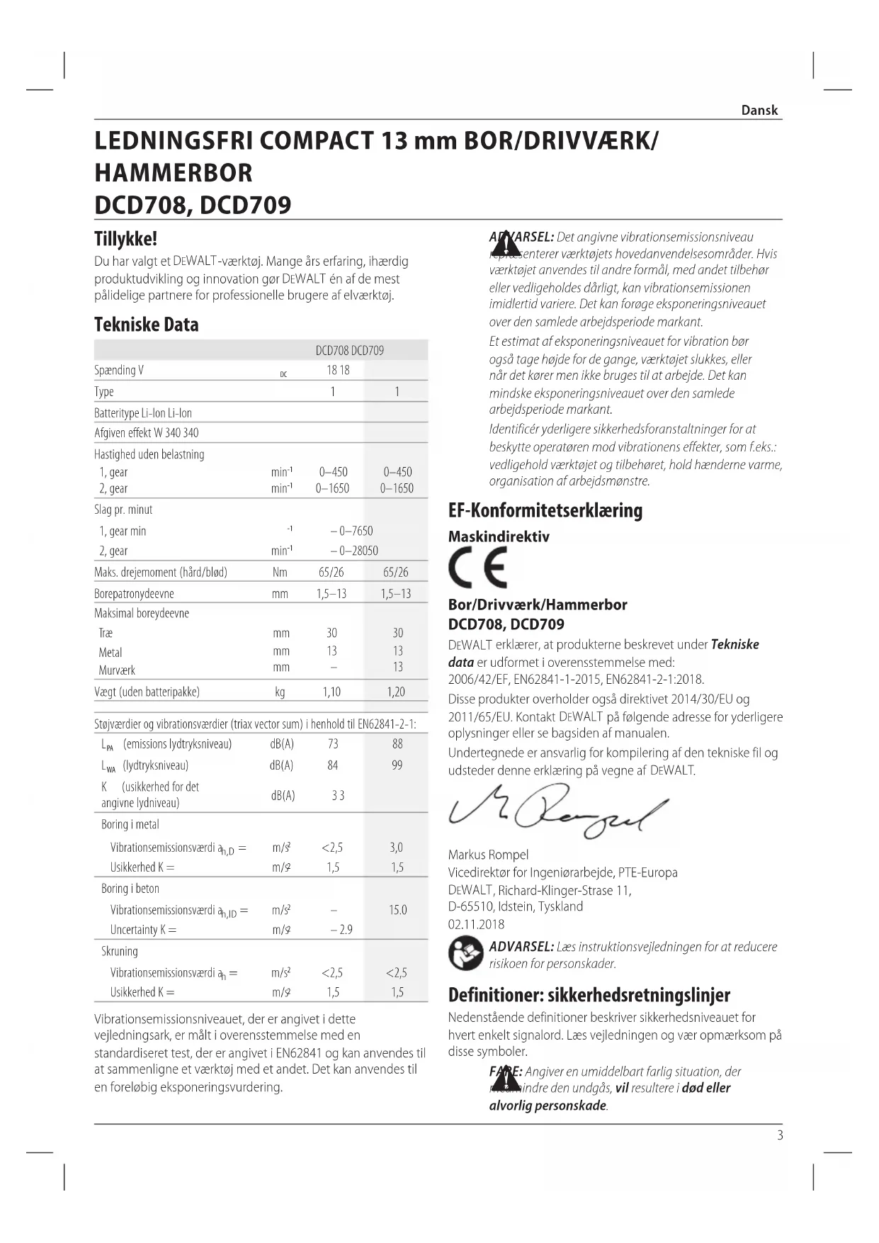 ADVARSEL: Det angivne vibrationsemissionsniveau repræsenterer værktøjets hovedanvendelsesområder. Hvis værktøjet anvendes til andre formål, med andet tilbehør eller vedligeholdes dårligt, kan vibrationsemissionen imidlertid variere. Det kan forøge eksponeringsniveauet over den samlede arbejdsperiodemarkant. Et estimat af eksponeringsniveauet for vibration bør også tage højde for de gange, værktøjet slukkes, eller når det kører men ikke bruges til at arbejde. Det kan mindske eksponeringsniveauet over den samlede arbejdsperiodemarkant. Identificér yderligere sikkerhedsforanstaltninger for at beskytte operatøren mod vibrationens effekter, som f.eks.: vedligehold værktøjet og tilbehøret, hold hænderne varme, organisation afarbejdsmønstre. EF-Konformitetserklæring Maskindirektiv Bor/Drivværk/Hammerbor DCD708, DCD709 DeWALT erklærer, at produkterne beskrevet under Tekniske data er udformet i overensstemmelse med: 2006/42/EF, EN62841-1-2015, EN62841-2-1:2018. Disse produkter overholder også direktivet 2014/30/EU og 2011/65/EU. Kontakt DeWALT på følgende adresse for yderligere oplysninger eller se bagsiden afmanualen. Undertegnede er ansvarlig for kompilering af den tekniske fil og udsteder denne erklæring på vegne af DeWALT