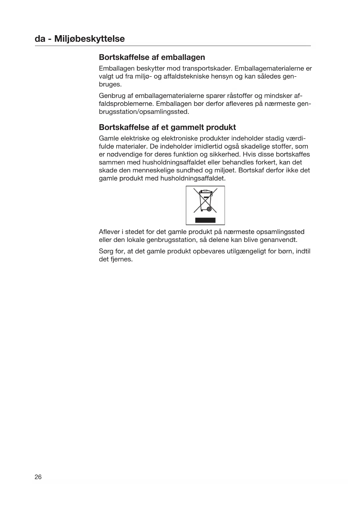 Bortskaffelse af emballagen Emballagen beskytter mod transportskader. Emballagematerialerne er valgt ud fra miljø- og affaldstekniske hensyn og kan således gen- bruges. Genbrug af emballagematerialerne sparer råstoffer og mindsker af- faldsproblemerne. Emballagen bør derfor afleveres på nærmeste gen- brugsstation/opsamlingssted. Bortskaffelse af et gammelt produkt Gamle elektriske og elektroniske produkter indeholder stadig værdi- fulde materialer. De indeholder imidlertid også skadelige stoffer, som er nødvendige for deres funktion og sikkerhed. Hvis disse bortskaffes sammen med husholdningsaffaldet eller behandles forkert, kan det skade den menneskelige sundhed og miljøet. Bortskaf derfor ikke det gamle produkt med husholdningsaffaldet. Aflever i stedet for det gamle produkt på nærmeste opsamlingssted eller den lokale genbrugsstation, så delene kan blive genanvendt. Sørg for, at det gamle produkt opbevares utilgængeligt for børn, indtil det fjernes.da - Montering