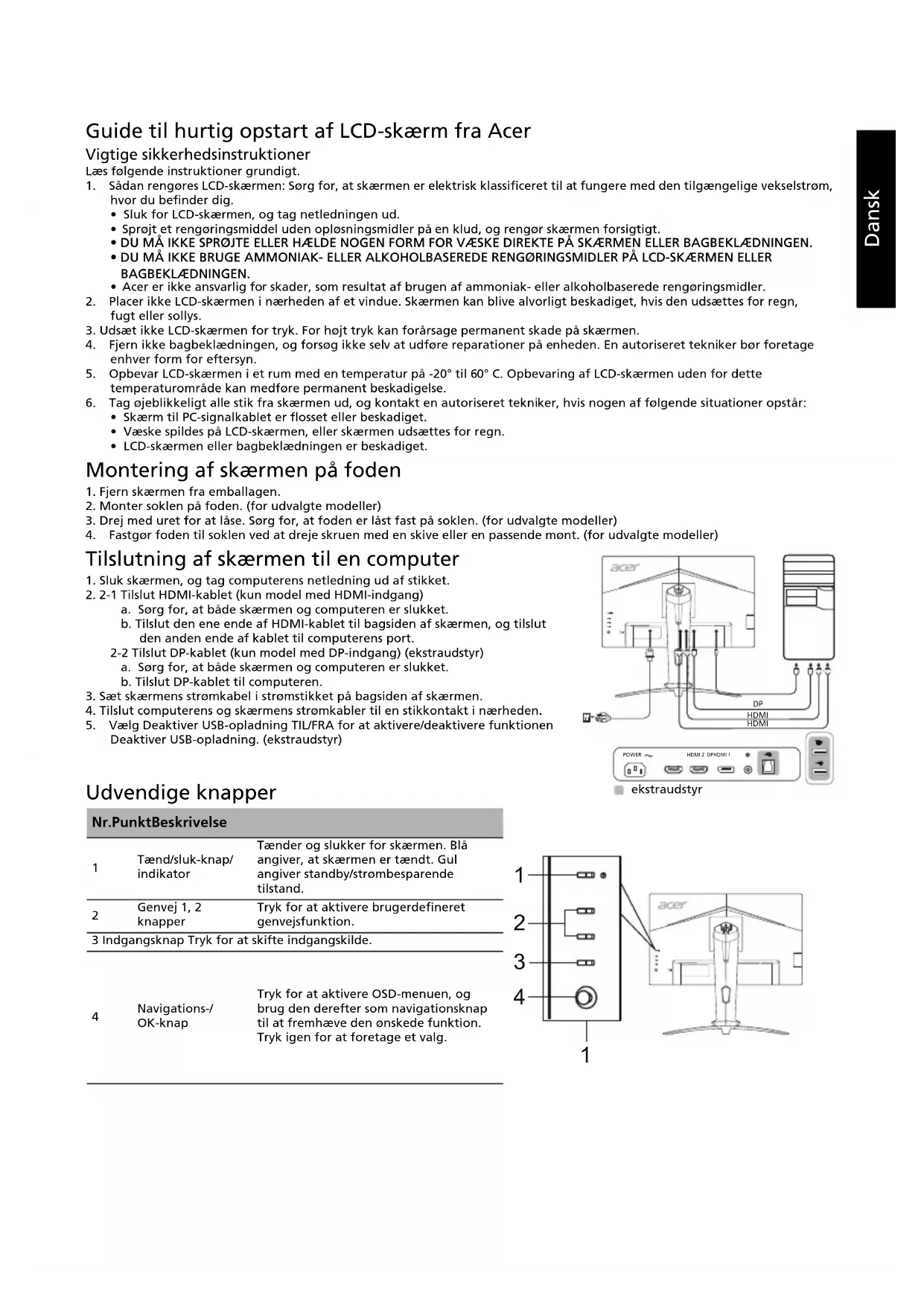 Tilslutning af skærmen til en computer 1. Sluk skærmen, og tag computerens netledning ud af stikket.2. 2-1 Tilslut HDMI-kablet (kun model med HDMI-indgang)a. Sørg for, at både skærmen og computeren er slukket.b. Tilslut den ene ende af HDMI-kablet til bagsiden af skærmen, og tilslut den anden ende af kablet til computerens port.2-2 Tilslut DP-kablet (kun model med DP-indgang) (ekstraudstyr)a. Sørg for, at både skærmen og computeren er slukket.b. Tilslut DP-kablet til computeren.3. Sæt skærmens strømkabel i strømstikket på bagsiden af skærmen.4. Tilslut computerens og skærmens strømkabler til en stikkontakt i nærheden.