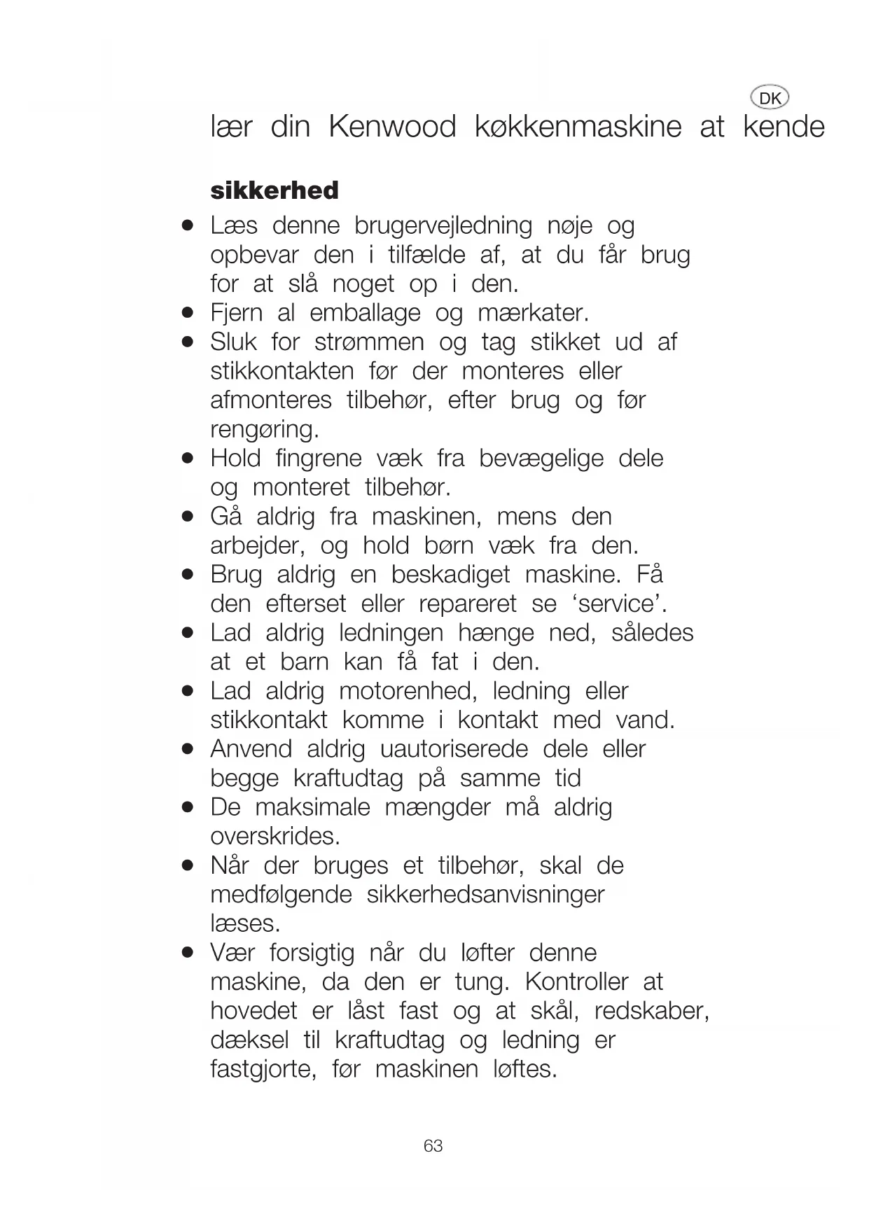 Anvend kun apparatet til husholdningsbrug. Kenwood påtager sig ikke erstatningsansvar, hvis apparatet ikke anvendes korrekt eller disse instruktioner ikke følges. 64inden stikket sættes i stikkontakten