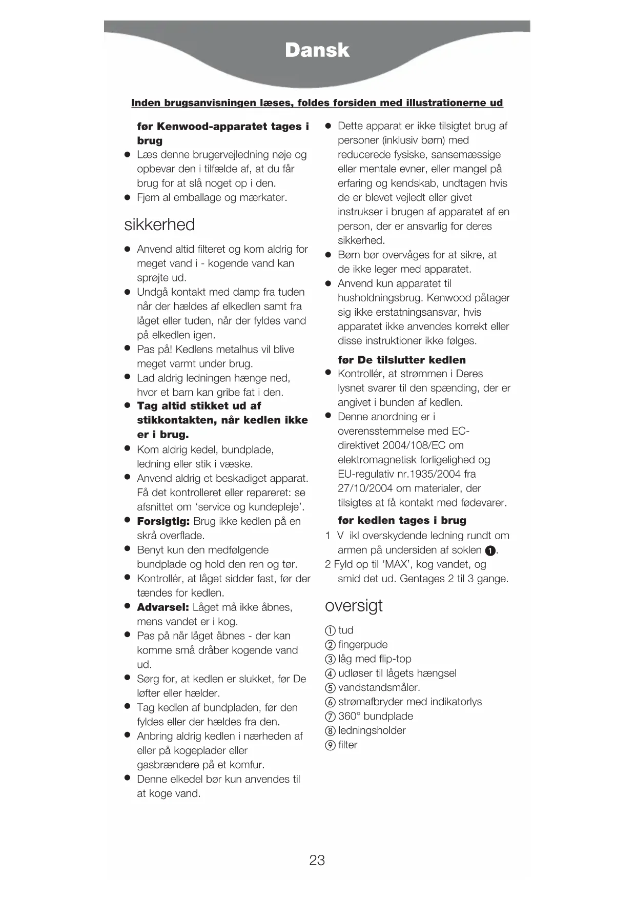 Anvend kun apparatet til husholdningsbrug. Kenwood påtager sig ikke erstatningsansvar, hvis apparatet ikke anvendes korrekt eller disse instruktioner ikke følges. før De tilslutter kedlen