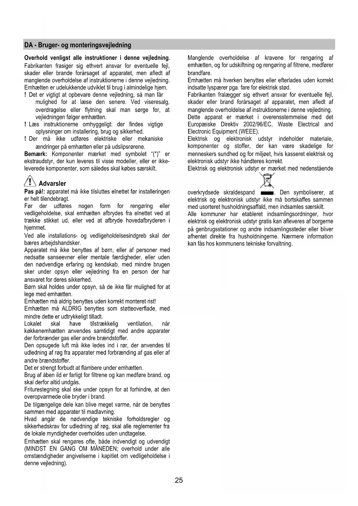 recommendations of the cooker hood and replacement of the filters may cause fire risks. Therefore, we recommend observing these instructions. The manufacturer declines all responsibility for any damage to the motor or any fire damage linked to inappropriate maintenance or failure to observe the above safety recommendations. Grease filter Fig. 12 Traps cooking grease particles. The grease filter must be cleaned once a month using non aggressive detergents, either by hand or in the dishwasher, which must be set to a low temperature and a short cycle. When washed in a dishwasher, the grease filter may discolour slightly, but this does not affect its filtering capacity. Charcoal filter (filter version only) Fig. 13 It absorbs unpleasant odours caused by cooking. The saturation of the charcoal filter occurs after more or less prolonged use, depending on the type of cooking and the regularity of cleaning of the grease filter. In any case it is necessary to replace the cartridge at least every four mounths. The charcoal filter may NOT be washed or regenerated. Replacing lamps Fig. 14 Disconnect the hood from the electricity. Warning! Prior to touching the light bulbs ensure they are cooled down. If the lights do not work, make sure that the lamps are fitted properly into their housings before you call for technical assistance.25 DA - Bruger- og monteringsvejledning Overhold venligst alle instruktioner i denne vejledning. Fabrikanten frasiger sig ethvert ansvar for eventuelle fejl, skader eller brande forårsaget af apparatet, men afledt af manglende overholdelse af instruktionerne i denne vejledning. Emhætten er udelukkende udviklet til brug i almindelige hjem. ! Det er vigtigt at opbevare denne vejledning, så man får mulighed for at læse den senere. Ved viseresalg, overdragelse eller flytning skal man sørge for, at vejledningen følger emhætten. ! Læs instruktionerne omhyggeligt: der findes vigtige oplysninger om installering, brug og sikkerhed. ! Der må ikke udføres elektriske eller mekaniske ændringer på emhætten eller på udslipsrørene. Bemærk: Komponenter mærket med symbolet “(*)” er ekstraudstyr, der kun leveres til visse modeller, eller er ikke- leverede komponenter, som således skal købes særskilt. Advarsler Pas på!: apparatet må ikke tilsluttes elnettet før installeringen er helt tilendebragt. Før der udføres nogen form for rengøring eller vedligeholdelse, skal emhætten afbrydes fra elnettet ved at trække stikket ud, eller ved at afbryde hovedafbryderen i hjemmet. Ved alle installations- og vedligeholdelsesindgreb skal der bæres arbejdshandsker. Apparatet må ikke benyttes af børn, eller af personer med nedsatte sanseevner eller mentale færdigheder, eller uden den nødvendige erfaring og kendskab, med mindre brugen sker under opsyn eller vejledning fra en person der har ansvaret for deres sikkerhed. Børn skal holdes under opsyn, så de ikke får mulighed for at lege med emhætten. Emhætten må aldrig benyttes uden korrekt monteret rist! Emhætten må ALDRIG benyttes som støtteoverflade, med mindre dette er udtrykkeligt tilladt. Lokalet skal have tilstrækkelig ventilation, når køkkenemhætten anvendes samtidigt med andre apparater der forbrænder gas eller andre brændstoffer. Den opsugede luft må ikke ledes ind i rør, der anvendes til udledning af røg fra apparater med forbrænding af gas eller af andre brændstoffer. Det er strengt forbudt at flambere under emhætten. Brug af åben ild er farligt for filtrene og kan medføre brand, og skal derfor altid undgås. Friturestegning skal ske under opsyn for at forhindre, at den overopvarmede olie bryder i brand. De tilgængelige dele kan blive meget varme, når de benyttes sammen med apparater til madlavning. Hvad angår de nødvendige tekniske forholdsregler og sikkerhedskrav for udledning af røg, skal alle reglementer fra de lokale myndigheder overholdes uden undtagelse. Emhætten skal rengøres ofte, både indvendigt og udvendigt (MINDST EN GANG OM MÅNEDEN; overhold under alle omstændigheder angivelserne i kapitlet om vedligeholdelse i denne vejledning). Manglende overholdelse af kravene for rengøring af emhætten, og for udskiftning og rengøring af filtrene, medfører brandfare. Emhætten må hverken benyttes eller efterlades uden korrekt indsatte lyspærer pga. fare for elektrisk stød. Fabrikanten fralægger sig ethvert ansvar for eventuelle fejl, skader eller brand forårsaget af apparatet, men afledt af manglende overholdelse af instruktionerne i denne vejledning. Dette apparat er mærket i overensstemmelse med det Europæiske Direktiv 2002/96/EC, Waste Electrical and Electronic Equipment (WEEE). Elektrisk og elektronisk udstyr indeholder materiale, komponenter og stoffer, der kan være skadelige for menneskers sundhed og for miljøet, hvis kasseret elektrisk og elektronisk udstyr ikke håndteres korrekt. Elektrisk og elektronisk udstyr er mærket med nedenstående overkrydsede skraldespand . Den symboliserer, at elektrisk og elektronisk udstyr ikke må bortskaffes sammen med usorteret husholdningsaffald, men indsamles særskilt. Alle kommuner har etableret indsamlingsordninger, hvor elektrisk og elektronisk udstyr gratis kan afleveres af borgerne på genbrugsstationer og andre indsamlingssteder eller bliver afhentet direkte fra husholdningerne. Nærmere information kan fås hos kommunens tekniske forvaltning.26 Brug Emhætten er udviklet til brug i den sugende udgave med ekstern udledning eller i den filtrerende udgave med intern recirkulation. Sugende udgave Emhætten er udstyret med en luftudgang foroven B til udledning af røg udenfor (udledningsrør og fastgøringsbånd er ikke leveret). Fig. 1 Filtrerende udgave Hvis det ikke er muligt at lede røg og damp fra madlavningen udenfor, kan man anvende emhætten i den filtrerende udgave ved at montere 1 eller 2 filtre med aktivt kul (*). Røgen og dampen renses og luften sendes tilbage i køkkenet. Fig. 2 Modellerne uden udsugningsmoto