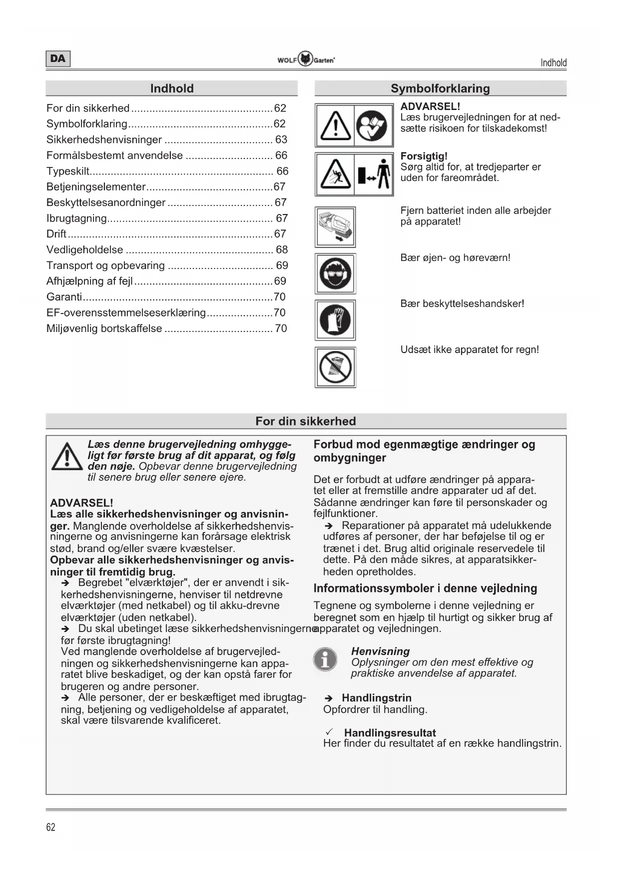 - Miljøvenlig bortskaelse Symbolforklaring ADVARSEL! Læs brugervejledningen for at ned- sætte risikoen for tilskadekomst! Forsigtig! Sørg altid for, at tredjeparter er uden for fareområdet. Fjern batteriet inden alle arbejder på apparatet! Bær øjen- og høreværn! Bær beskyttelseshandsker! Udsæt ikke apparatet for regn! For din sikkerhedFor din sikkerhed p. 70