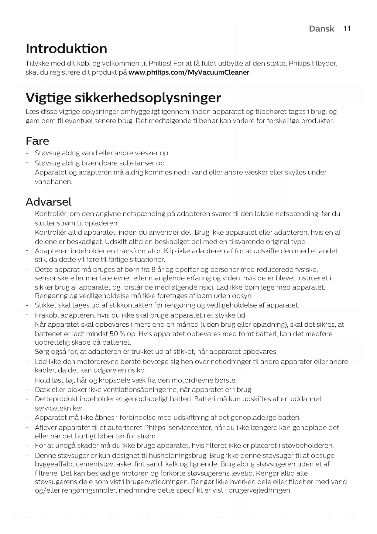 Dansk Introduktion Tillykke med dit køb, og velkommen til Philips! For at få fuldt udbytte af den støtte, Philips tilbyder, skal du registrere dit produkt på www.philips.com/MyVacuumCleaner. Vigtige sikkerhedsoplysninger Læs disse vigtige oplysninger omhyggeligt igennem, inden apparatet og tilbehøret tages i brug, og gem dem til eventuel senere brug. Det medfølgende tilbehør kan variere for forskellige produkter. Fare