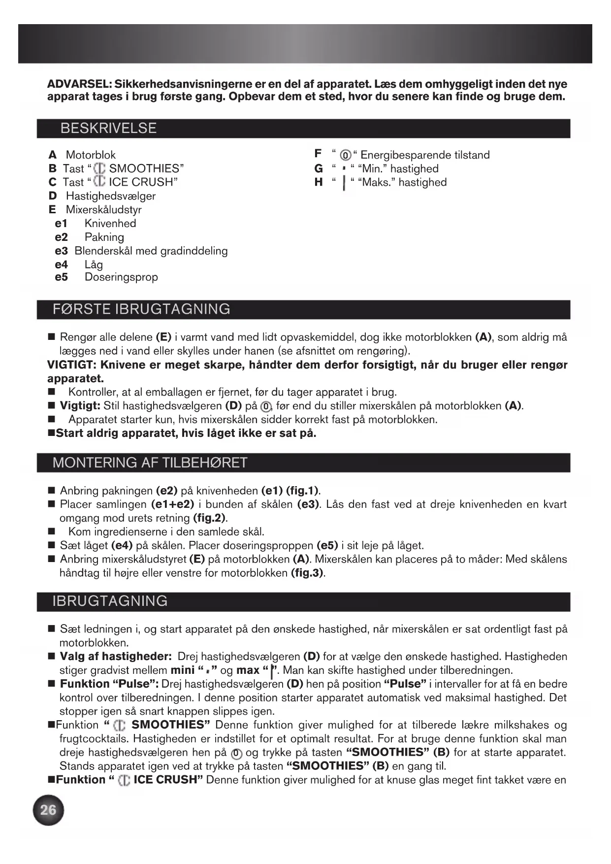 n Anbring pakningen (e2) på knivenheden (e1) (fig.1). n Placer samlingen (e1+e2) i bunden af skålen (e3). Lås den fast ved at dreje knivenheden en kvart omgang mod urets retning (fig.2). n Kom ingredienserne i den samlede skål. n Sæt låget (e4) på skålen. Placer doseringsproppen (e5) i sit leje på låget. n Anbring mixerskåludstyret (E) på motorblokken (A). Mixerskålen kan placeres på to måder: Med skålens håndtag til højre eller venstre for motorblokken (fig.3). IBRUGTAGNING n Sæt ledningen i, og start apparatet på den ønskede hastighed, når mixerskålen er sat ordentligt fast på motorblokken. n Valg af hastigheder: Drej hastighedsvælgeren (D) for at vælge den ønskede hastighed. Hastigheden stiger gradvist mellem mini “ ” og max “ ”. Man kan skifte hastighed under tilberedningen. n Funktion “Pulse”: Drej hastighedsvælgeren (D) hen på position “Pulse” i intervaller for at få en bedre kontrol over tilberedningen. I denne position starter apparatet automatisk ved maksimal hastighed. Det stopper igen så snart knappen slippes igen. n Funktion “ SMOOTHIES” Denne funktion giver mulighed for at tilberede lækre milkshakes og frugtcocktails. Hastigheden er indstillet for et optimalt resultat. For at bruge denne funktion skal man dreje hastighedsvælgeren hen på