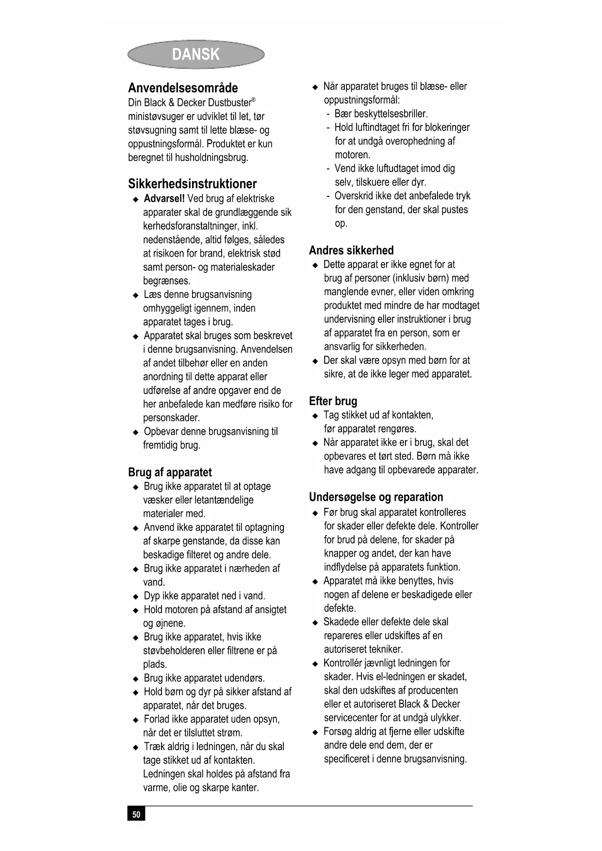 ministøvsuger er udviklet til let, tør støvsugning samt til lette blæse- og oppustningsformål. Produktet er kun beregnet til husholdningsbrug. Sikkerhedsinstruktioner Advarsel! Ved brug af elektriske apparater skal de grundlæggende sik kerhedsforanstaltninger, inkl. nedenstående, altid følges, således at risikoen for brand, elektrisk stød samt person- og materialeskader begrænses. Læs denne brugsanvisning omhyggeligt igennem, inden apparatet tages i brug. Apparatet skal bruges som beskrevet i denne brugsanvisning. Anvendelsen af andet tilbehør eller en anden anordning til dette apparat eller udførelse af andre opgaver end de her anbefalede kan medføre risiko for personskader. Opbevar denne brugsanvisning til fremtidig brug. Brug af apparatet Brug ikke apparatet til at optage væsker eller letantændelige materialer med. Anvend ikke apparatet til optagning af skarpe genstande, da disse kan beskadige filteret og andre dele. Brug ikke apparatet i nærheden af vand. Dyp ikke apparatet ned i vand. Hold motoren på afstand af ansigtet og øjnene. Brug ikke apparatet, hvis ikke støvbeholderen eller filtrene er på plads. Brug ikke apparatet udendørs. Hold børn og dyr på sikker afstand af apparatet, når det bruges. Forlad ikke apparatet uden opsyn, når det er tilsluttet strøm. Træk aldrig i ledningen, når du skal tage stikket ud af kontakten. Ledningen skal holdes på afstand fra varme, olie og skarpe kanter. Når apparatet bruges til blæse- eller oppustningsformål: - Bær beskyttelsesbriller. - Hold luftindtaget fri for blokeringer for at undgå overophedning af motoren. - Vend ikke luftudtaget imod dig selv, tilskuere eller dyr. - Overskrid ikke det anbefalede tryk for den genstand, der skal pustes op. Andres sikkerhed Dette apparat er ikke egnet for at brug af personer (inklusiv børn) med manglende evner, eller viden omkring produktet med mindre de har modtaget undervisning eller instruktioner i brug af apparatet fra en person, som er ansvarlig for sikkerheden. Der skal være opsyn med børn for at sikre, at de ikke leger med apparatet. Efter brug Tag stikket ud af kontakten, før apparatet rengøres. Når apparatet ikke er i brug, skal det opbevares et tørt sted. Børn må ikke have adgang til opbevarede apparater. Undersøgelse og reparation Før brug skal apparatet kontrolleres for skader eller defekte dele. Kontroller for brud på delene, for skader på knapper og andet, der kan have indflydelse på apparatets funktion. Apparatet må ikke benyttes, hvis nogen af delene er beskadigede eller defekte. Skadede eller defekte dele skal repareres eller udskiftes af en autoriseret tekniker. Kontrollér jævnligt ledningen for skader. Hvis el-ledningen er skadet, skal den udskiftes af producenten eller et autoriseret Black & Decker servicecenter for at undgå ulykker. Forsøg aldrig at fjerne eller udskifte andre dele end dem, der er specificeret i denne brugsanvisning.51 DANSK El-sikkerhed