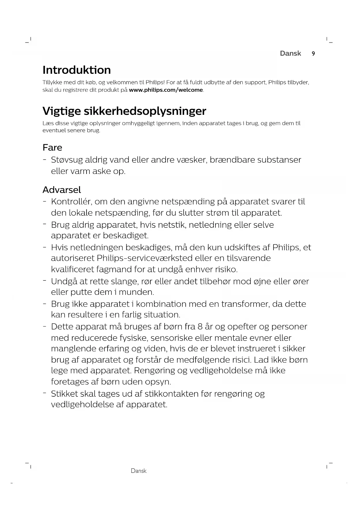 EnglishDansk Introduktion Tillykke med dit køb, og velkommen til Philips! For at få fuldt udbytte af den support, Philips tilbyder,skal du registrere dit produkt på www.philips.com/welcome. Vigtige sikkerhedsoplysninger Læs disse vigtige oplysninger omhyggeligt igennem, inden apparatet tages i brug, og gem dem tileventuel senere brug. Fare