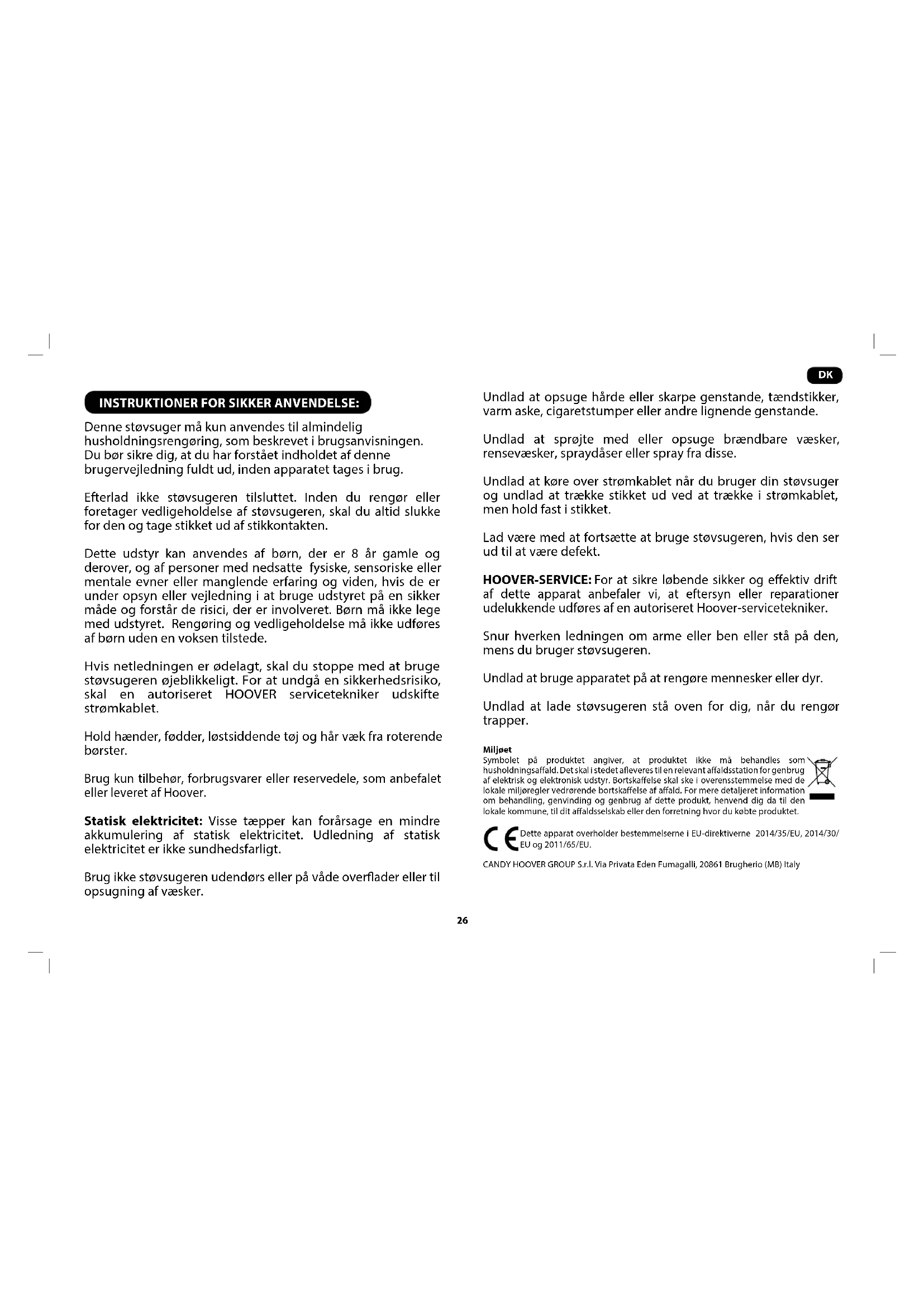 INSTRUKTIONER FOR SIKKER ANVENDELSE: Denne støvsuger må kun anvendes til almindelig husholdningsrengøring, som beskrevet i brugsanvisningen. Du bør sikre dig, at du har forstået indholdet af denne brugervejledning fuldt ud, inden apparatet tages i brug. Efterlad ikke støvsugeren tilsluttet. Inden du rengør eller foretager vedligeholdelse af støvsugeren, skal du altid slukke for den og tage stikket ud af stikkontakten. Dette udstyr kan anvendes af børn, der er 8 år gamle og derover, og af personer med nedsatte fysiske, sensoriske eller mentale evner eller manglende erfaring og viden, hvis de er under opsyn eller vejledning i at bruge udstyret på en sikker måde og forstår de risici, der er involveret. Børn må ikke lege med udstyret. Rengøring og vedligeholdelse må ikke udføres af børn uden en voksen tilstede. Hvis netledningen er ødelagt, skal du stoppe med at bruge støvsugeren øjeblikkeligt. For at undgå en sikkerhedsrisiko, skal en autoriseret HOOVER servicetekniker udskifte strømkablet. Hold hænder, fødder, løstsiddende tøj og hår væk fra roterende børster. Brug kun tilbehør, forbrugsvarer eller reservedele, som anbefalet eller leveret af Hoover. Statisk elektricitet: Visse tæpper kan forårsage en mindre akkumulering af statisk elektricitet. Udledning af statisk elektricitet er ikke sundhedsfarligt. Brug ikke støvsugeren udendørs eller på våde overader eller til opsugning af væsker. Undlad at opsuge hårde eller skarpe genstande, tændstikker, varm aske, cigaretstumper eller andre lignende genstande. Undlad at sprøjte med eller opsuge brændbare væsker, rensevæsker, spraydåser eller spray fra disse. Undlad at køre over strømkablet når du bruger din støvsuger og undlad at trække stikket ud ved at trække i strømkablet, men hold fast i stikket. Lad være med at fortsætte at bruge støvsugeren, hvis den ser ud til at være defekt. HOOVER-SERVICE: For at sikre løbende sikker og eektiv drift af dette apparat anbefaler vi, at eftersyn eller reparationer udelukkende udføres af en autoriseret Hoover-servicetekniker. Snur hverken ledningen om arme eller ben eller stå på den, mens du bruger støvsugeren. Undlad at bruge apparatet på at rengøre mennesker eller dyr. Undlad at lade støvsugeren stå oven for dig, når du rengør trapper. Miljøet Symbolet på produktet angiver, at produktet ikke må behandles som husholdningsaald. Det skal i stedet aeveres til en relevant aaldsstation for genbrug af elektrisk og elektronisk udstyr. Bortskaelse skal ske i overensstemmelse med de lokale miljøregler vedrørende bortskaelse af aald. For mere detaljeret information om behandling, genvinding og genbrug af dette produkt, henvend dig da til den lokale kommune, til dit aaldsselskab eller den forretning hvor du købte produktet. Dette apparat overholder bestemmelserne i EU-direktiverne 2014/35/EU, 2014/30/ EU og 2011/65/EU. CANDY HOOVER GROUP S.r.l. Via Privata Eden Fumagalli, 20861 Brugherio (MB) Italy27