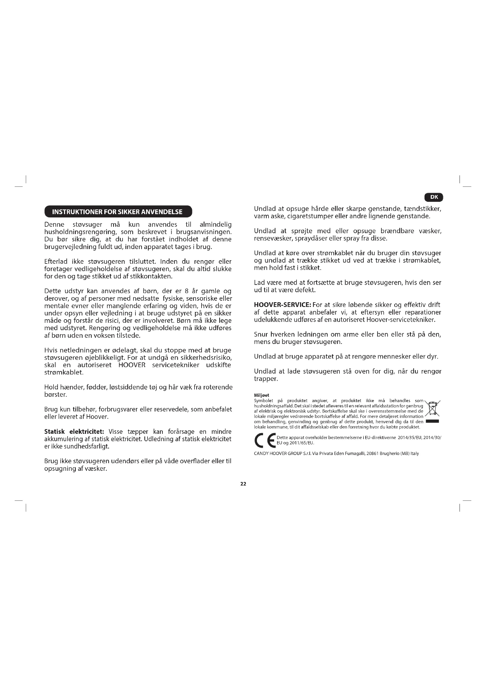 Denne støvsuger må kun anvendes til almindelig husholdningsrengøring, som beskrevet i brugsanvisningen. Du bør sikre dig, at du har forstået indholdet af denne brugervejledning fuldt ud, inden apparatet tages i brug. Efterlad ikke støvsugeren tilsluttet. Inden du rengør eller foretager vedligeholdelse af støvsugeren, skal du altid slukke for den og tage stikket ud af stikkontakten. Dette udstyr kan anvendes af børn, der er 8 år gamle og derover, og af personer med nedsatte fysiske, sensoriske eller mentale evner eller manglende erfaring og viden, hvis de er under opsyn eller vejledning i at bruge udstyret på en sikker måde og forstår de risici, der er involveret. Børn må ikke lege med udstyret. Rengøring og vedligeholdelse må ikke udføres af børn uden en voksen tilstede. Hvis netledningen er ødelagt, skal du stoppe med at bruge støvsugeren øjeblikkeligt. For at undgå en sikkerhedsrisiko, skal en autoriseret HOOVER servicetekniker udskifte strømkablet. Hold hænder, fødder, løstsiddende tøj og hår væk fra roterende børster. Brug kun tilbehør, forbrugsvarer eller reservedele, som anbefalet eller leveret af Hoover. Statisk elektricitet: Visse tæpper kan forårsage en mindre akkumulering af statisk elektricitet. Udledning af statisk elektricitet er ikke sundhedsfarligt. Brug ikke støvsugeren udendørs eller på våde overader eller til opsugning af væsker. Undlad at opsuge hårde eller skarpe genstande, tændstikker, varm aske, cigaretstumper eller andre lignende genstande. Undlad at sprøjte med eller opsuge brændbare væsker, rensevæsker, spraydåser eller spray fra disse. Undlad at køre over strømkablet når du bruger din støvsuger og undlad at trække stikket ud ved at trække i strømkablet, men hold fast i stikket. Lad være med at fortsætte at bruge støvsugeren, hvis den ser ud til at være defekt. HOOVER-SERVICE: For at sikre løbende sikker og eektiv drift af dette apparat anbefaler vi, at eftersyn eller reparationer udelukkende udføres af en autoriseret Hoover-servicetekniker. Snur hverken ledningen om arme eller ben eller stå på den, mens du bruger støvsugeren. Undlad at bruge apparatet på at rengøre mennesker eller dyr. Undlad at lade støvsugeren stå oven for dig, når du rengør trapper. Miljøet Symbolet på produktet angiver, at produktet ikke må behandles som husholdningsaald. Det skal i stedet aeveres til en relevant aaldsstation for genbrug af elektrisk og elektronisk udstyr. Bortskaelse skal ske i overensstemmelse med de lokale miljøregler vedrørende bortskaelse af aald. For mere detaljeret information om behandling, genvinding og genbrug af dette produkt, henvend dig da til den lokale kommune, til dit aaldsselskab eller den forretning hvor du købte produktet. Dette apparat overholder bestemmelserne i EU-direktiverne 2014/35/EU, 2014/30/ EU og 2011/65/EU. CANDY HOOVER GROUP S.r.l. Via Privata Eden Fumagalli, 20861 Brugherio (MB) Italy23