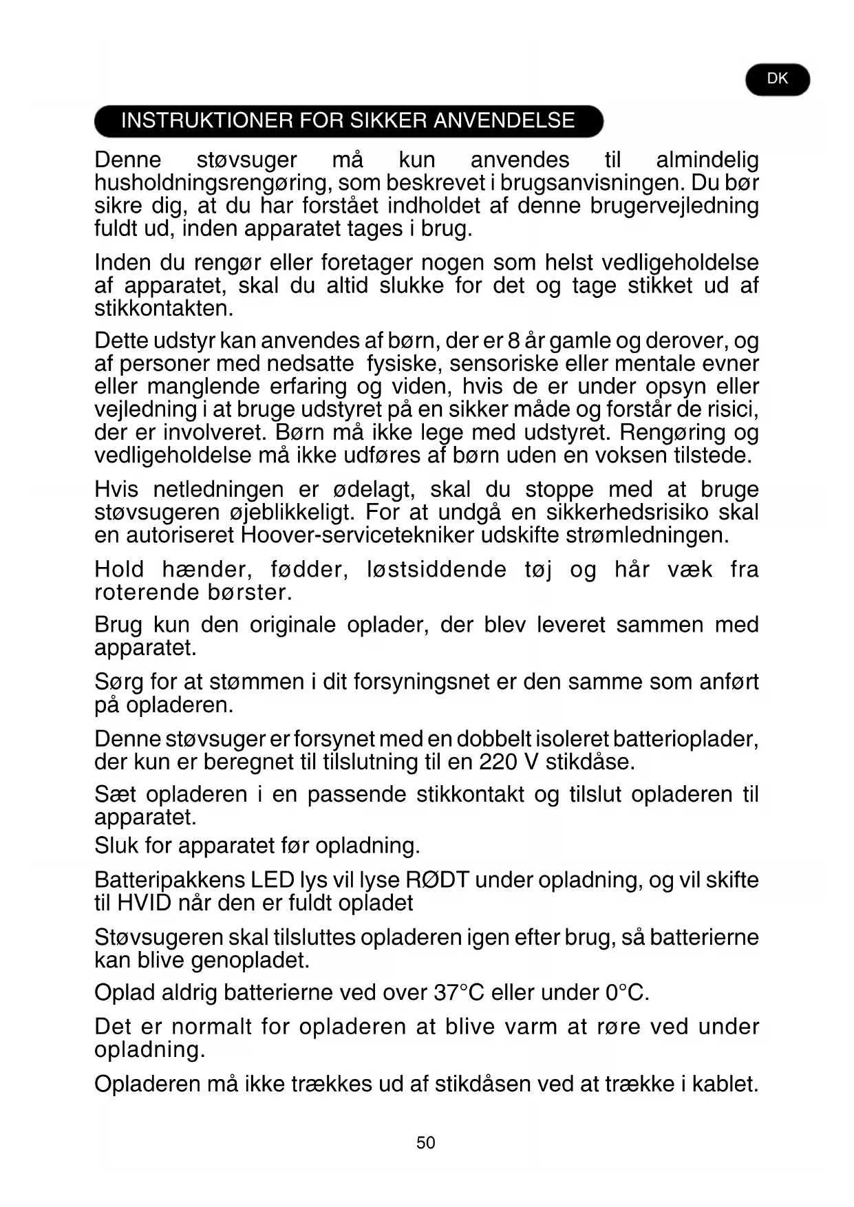 Denne støvsuger må kun anvendes til almindelig husholdningsrengøring, som beskrevet i brugsanvisningen. Du bør sikre dig, at du har forstået indholdet af denne brugervejledning fuldt ud, inden apparatet tages i brug. Inden du rengør eller foretager nogen som helst vedligeholdelse af apparatet, skal du altid slukke for det og tage stikket ud af stikkontakten. Dette udstyr kan anvendes af børn, der er 8 år gamle og derover, og af personer med nedsatte fysiske, sensoriske eller mentale evner eller manglende erfaring og viden, hvis de er under opsyn eller vejledning i at bruge udstyret på en sikker måde og forstår de risici, der er involveret. Børn må ikke lege med udstyret. Rengøring og vedligeholdelse må ikke udføres af børn uden en voksen tilstede. Hvis netledningen er ødelagt, skal du stoppe med at bruge støvsugeren øjeblikkeligt. For at undgå en sikkerhedsrisiko skal en autoriseret Hoover-servicetekniker udskifte strømledningen. Hold hænder, fødder, løstsiddende tøj og hår væk fra roterende børster. Brug kun den originale oplader, der blev leveret sammen med apparatet. Sørg for at stømmen i dit forsyningsnet er den samme som anført på opladeren. Denne støvsuger er forsynet med en dobbelt isoleret batterioplader, der kun er beregnet til tilslutning til en 220 V stikdåse. Sæt opladeren i en passende stikkontakt og tilslut opladeren til apparatet. Sluk for apparatet før opladning. Batteripakkens LED lys vil lyse RØDT under opladning, og vil skifte til HVID når den er fuldt opladet Støvsugeren skal tilsluttes opladeren igen efter brug, så batterierne kan blive genopladet. Oplad aldrig batterierne ved over 37°C eller under 0°C. Det er normalt for opladeren at blive varm at røre ved under opladning. Opladeren må ikke trækkes ud af stikdåsen ved at trække i kablet. DK51 Træk opladeren ud af stikket ved længere tids fravær (ferie o.lign.). Genoplad støvsugeren igen før brug, da batterierne kan selvaflade ved længere tids stilstand. Hvis dit apparat skal kasseres, skal batterierne fjernes inden. Apparatet skal abrydes fra lysnettet når batteriet fjernes. Bortskaf batterierne på en sikker måde. Tænd apparatet, indtil det stopper, fordi batterierne er helt afladet. Brugte batterier skal afleveres på en genbrugsstation og ikke smides ud sammen med husholdningsaffald. Hvis batterierne skal fjernes, bedes du kontakte Hoover-kundeservice eller handle i henhold til følgende anvisninger. VIGTIGT: Aflad altid batterierne helt, før de fjernes. Kør med støvsugeren, indtil batterierne er helt tomme. Fjern opladeren fra apparatet. Tryk på batteripakkens udløsningsknapper, og fjern pakken. Bemærk: Hvis du får problemer med at afmontere enheden eller ønsker mere detaljerede oplysninger om behandling, genanvendelse og genbrug af dette produkt, bedes du kontakte kommunen eller skraldeselskabet. Anvend kun tilbehør, udstyr og reservedele leveret af Hoover. Statisk elektricitet: Visse tæpper kan forårsage en mindre akkumulering af statisk elektricitet. Udledning af statisk elektricitet er ikke sundhedsfarligt. Brug ikke støvsugeren udendørs eller på våde overflader eller til opsugning af væsker. Undlad at opsuge hårde eller skarpe genstande, tændstikker, varm aske, cigaretstumper eller andre lignende genstande. Undlad at sprøjte med eller opsuge brændbare væsker, rensevæsker, spraydåser eller spray fra disse. Undlad at køre over strømkablet når du bruger din støvsuger og undlad at trække stikket ud ved at trække i strømkablet, men hold fast i stikket. Hvis apparatet eller opladeren ser ud til at være beskadigede, skal det tages ud af brug. Hoover service: For at sikre løbende sikker og effektiv drift af denne støvsuger anbefaler vi, at eftersyn eller reparationer udelukkende udføres af en autoriseret Hoover-servicetekniker. Undlad at bruge apparatet på at rengøre mennesker eller dyr. DKPRODUKTKOMPONENTER