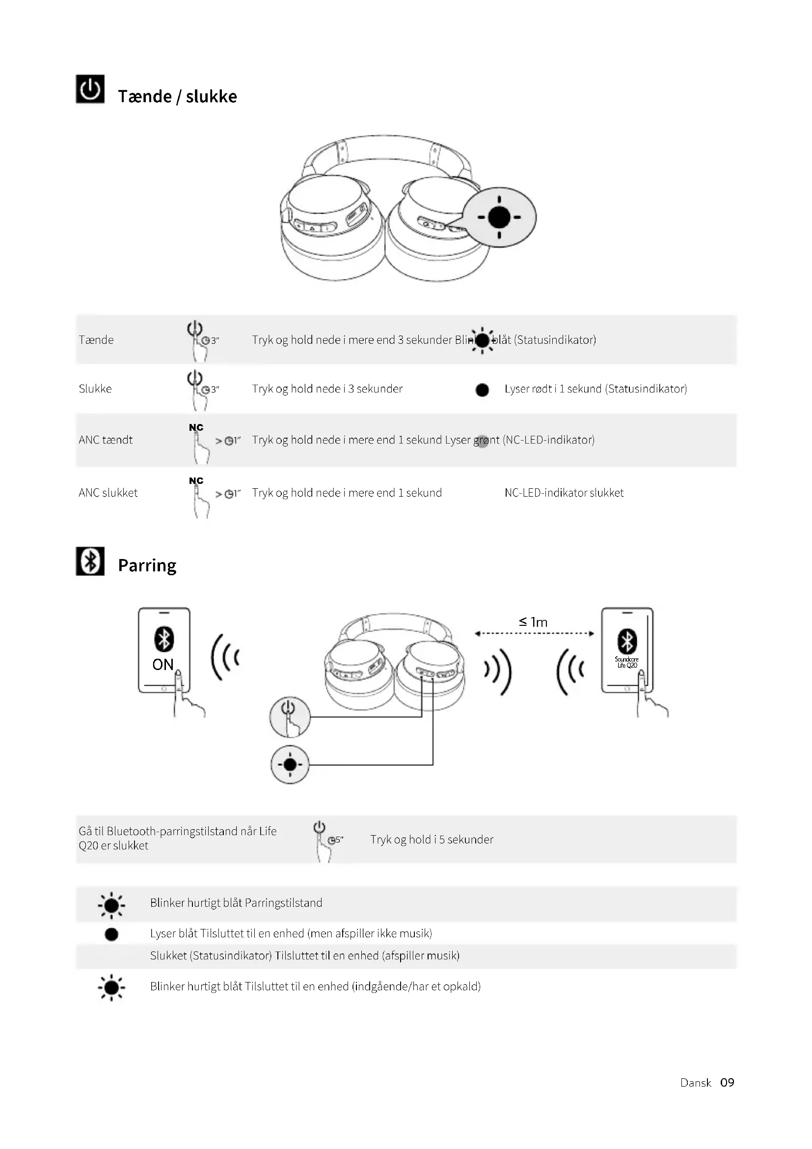 Tryk og hold nede i 1 sekund Aktiver Siri / anden stemmestyringssoftwareDansk 11 Aux-in AUX AUX Når du tilslutter et lydkabel, skiftes der automatisk til AUX-tilstand, og Bluetoothtilstand og ANC bliver deaktiveret. Opladning af høretelefonerne Meddelelseslyd (tone): Der er kun 2 timers afspilningstid tilbage. Du vil høre en stemmemeddelelse for hver 30 minutter. Lavt batteriniveau Blinker rødt hver 60 sekunder (Statusindikator) Lyser rødt (Statusindikator) Opladning Bemærk: Tænd ikke Life Q20 under opladning. Slukket (Statusindikator) Helt opladet12 Dansk Specifikationer Specifikationerne kan ændres uden varsel. Indgang 5 V 0,65 A Impedans 16 Ω Opladningstid 3 timer Driver (fuldt frekvensområde) 40 mm x 2 Afspilningstid (Bluetooth med ANC-tilstand tændt) 40 timer Frekvenskurve 16 Hz - 40 KHz Afspilningstid (Bluetooth med ANC-tilstand slukket) 60 timer Bluetooth-version V 5.0 Afspilningstid (forbundet til lydkabel med ANC-tilstand tændt) 35 timer Rækkevidde 15 m Vægt 268 gDeutsch 13 Ein- / Ausschalten Eingeschaltet