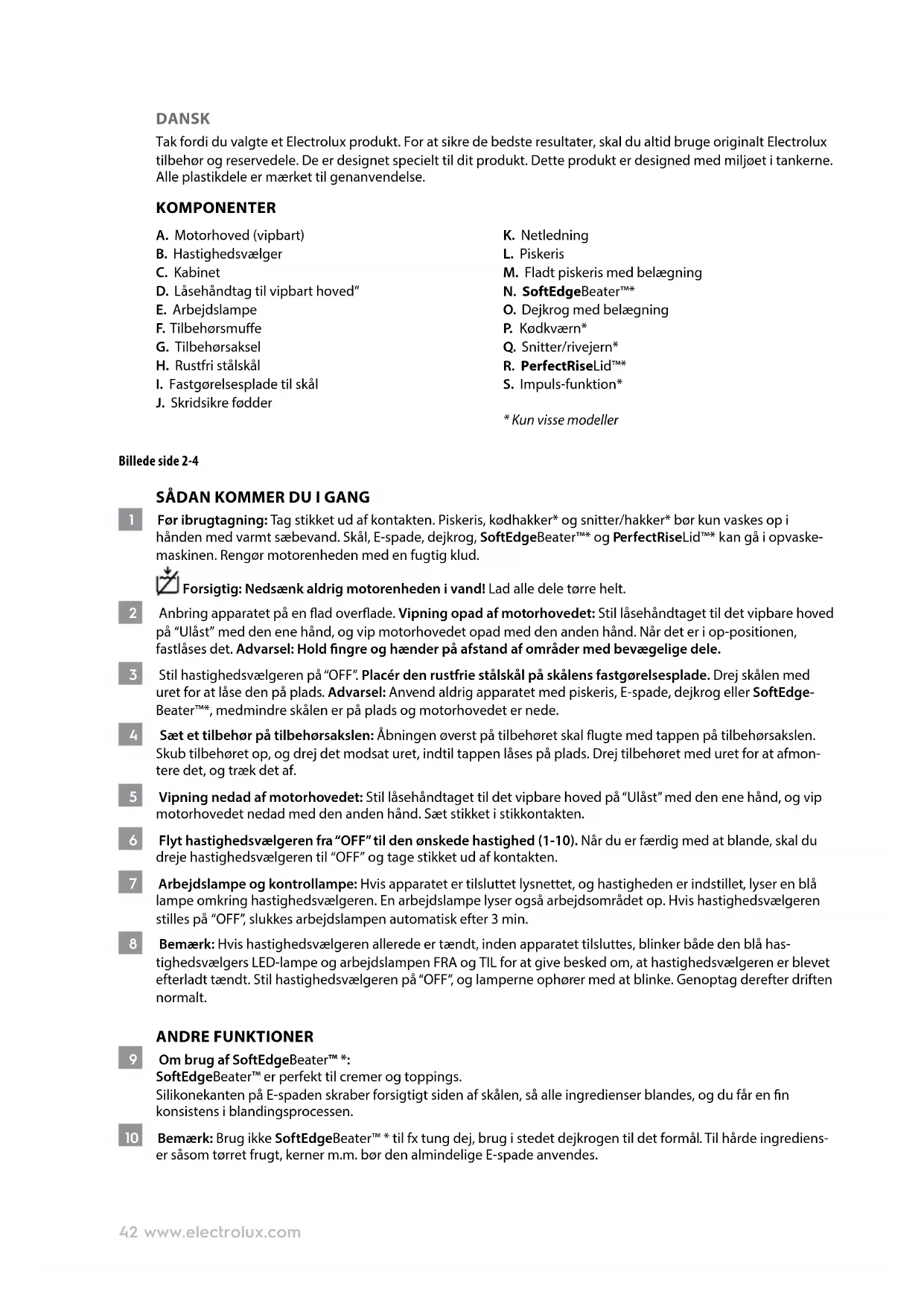 22 Afbryd apparatet.Vi anbefaler, at du vasker piskeris, kødhakker* og snitte-/rivedelen* i hånden med varmt sæbevand. Skål, E-spade, dejkrog, SoftEdgeBeater™* og PerfectRiseLid™* kan gå i opvaskemaskinen. Rengør motorenheden med en fugtig klud. Forsigtig: Nedsænk aldrig motorenheden i vand! Lad alle dele tørre helt. 23 Brug ikke slibende rengøringsmidler eller skuresvampe til rengøring af apparatet. Nyd dit nye Electrolux produkt!44 www.electrolux.com SIKKERHEDSRÅD Læs den følgende instruktion omhyggeligt, før apparatet anvendes for første gang.